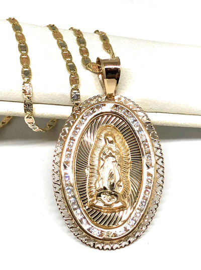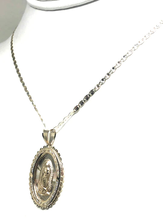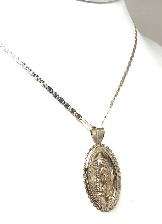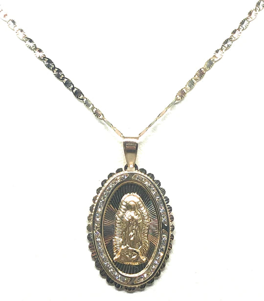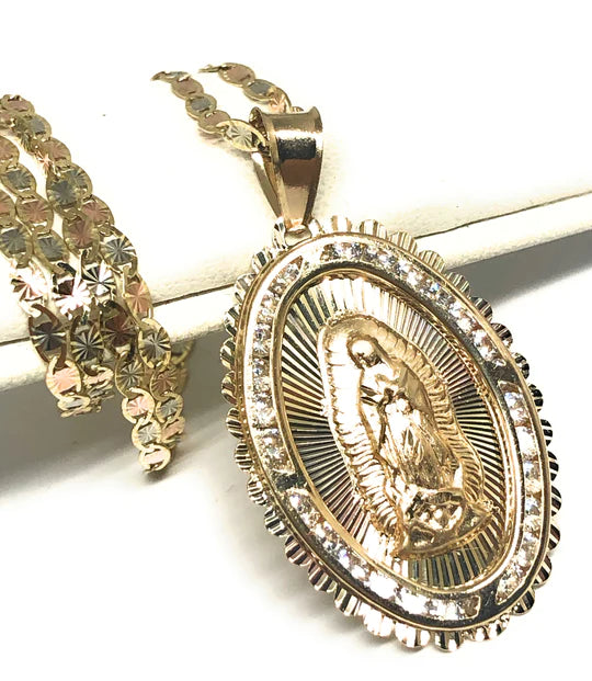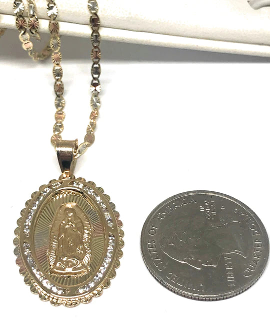 10k Solid Gold Tri-Color Virrgin Mary Oval Pendant Necklace W/ Cubic Zirconia Virrgen Gaudalupe (LG, MED, SM)