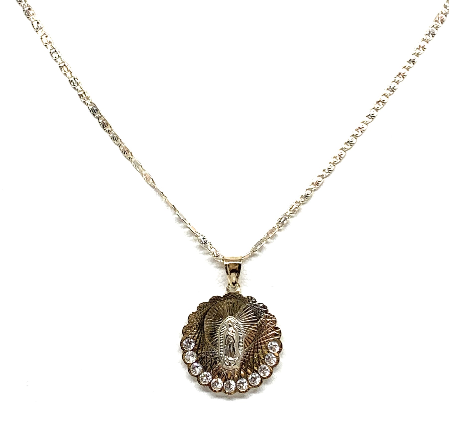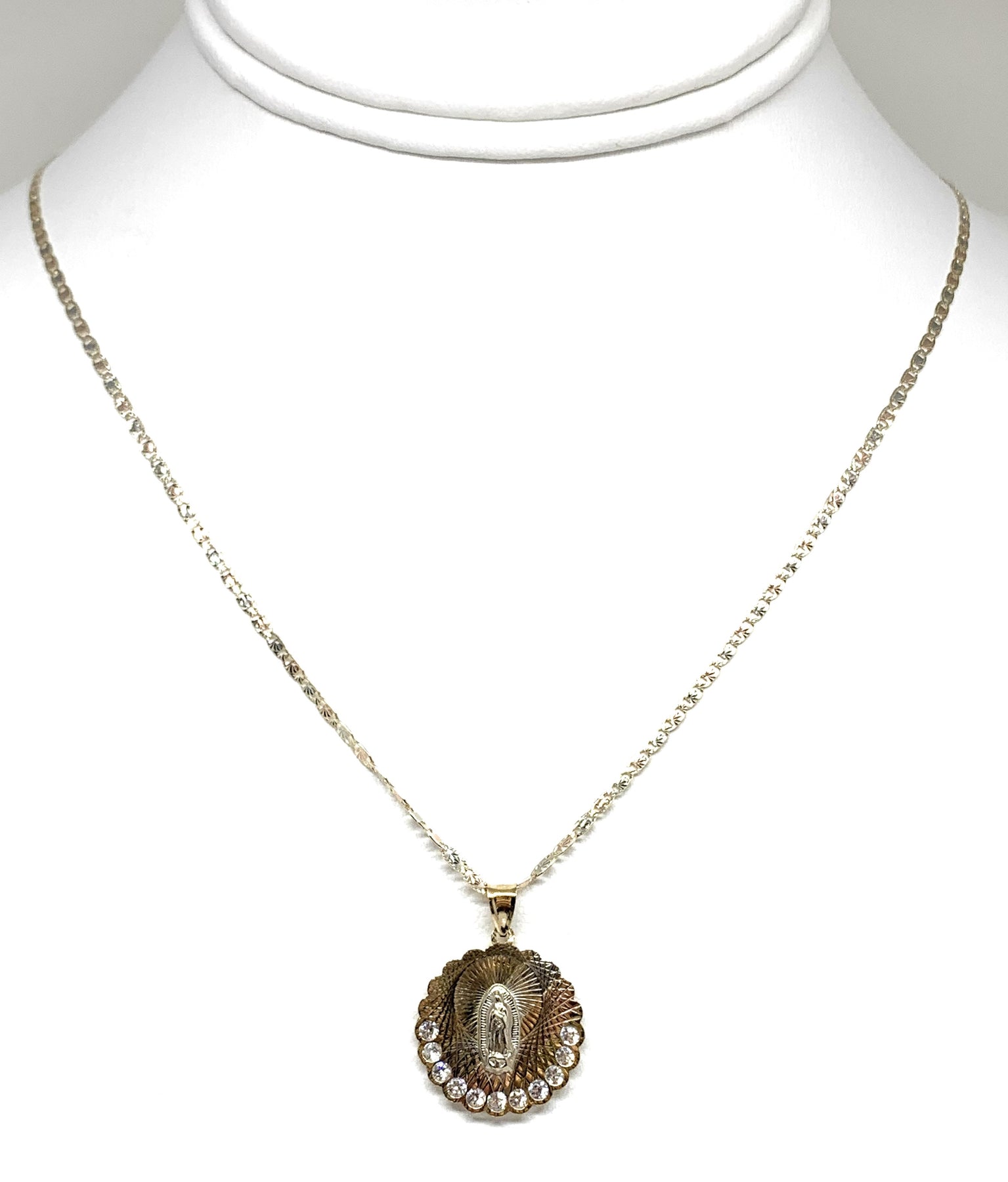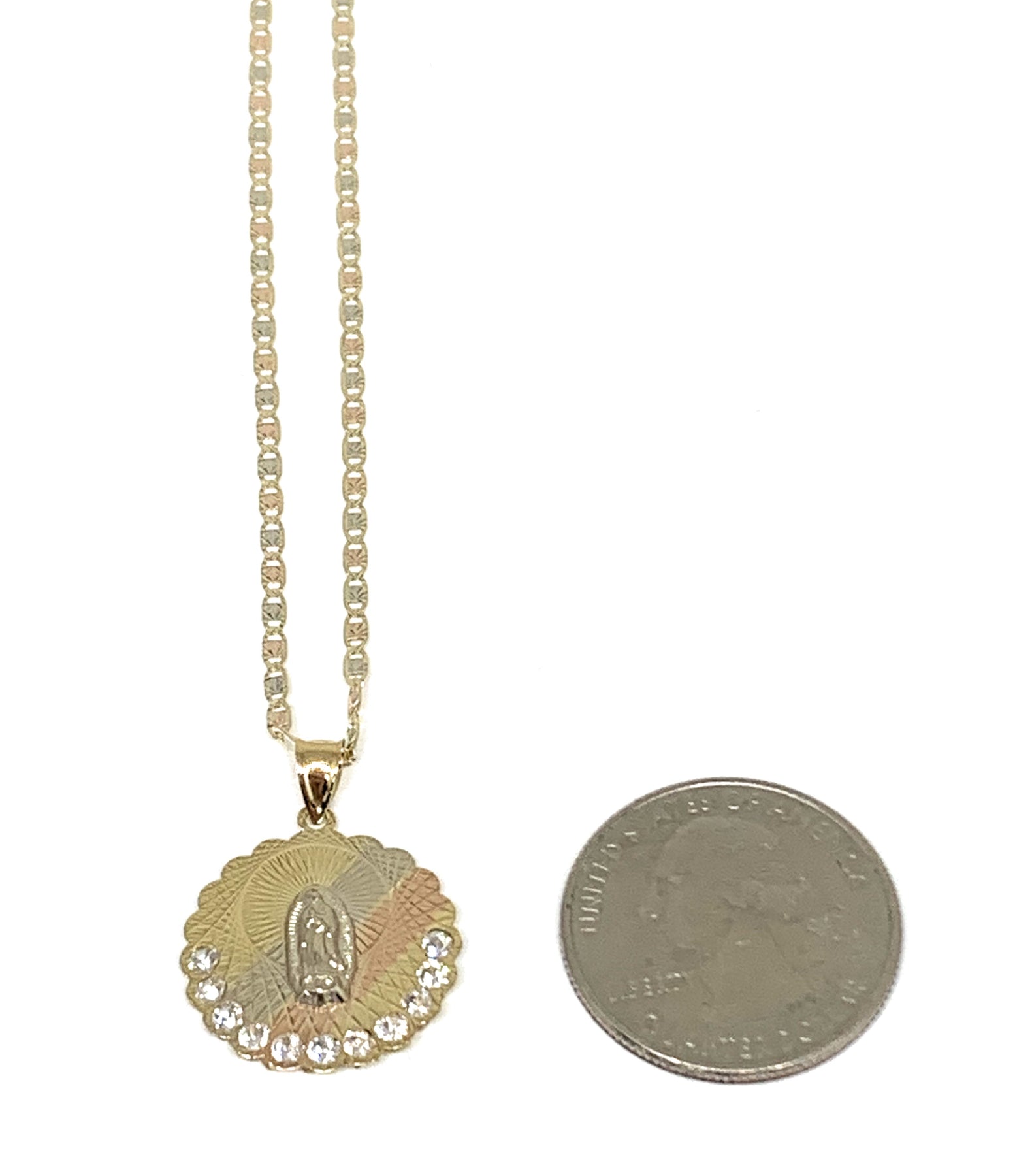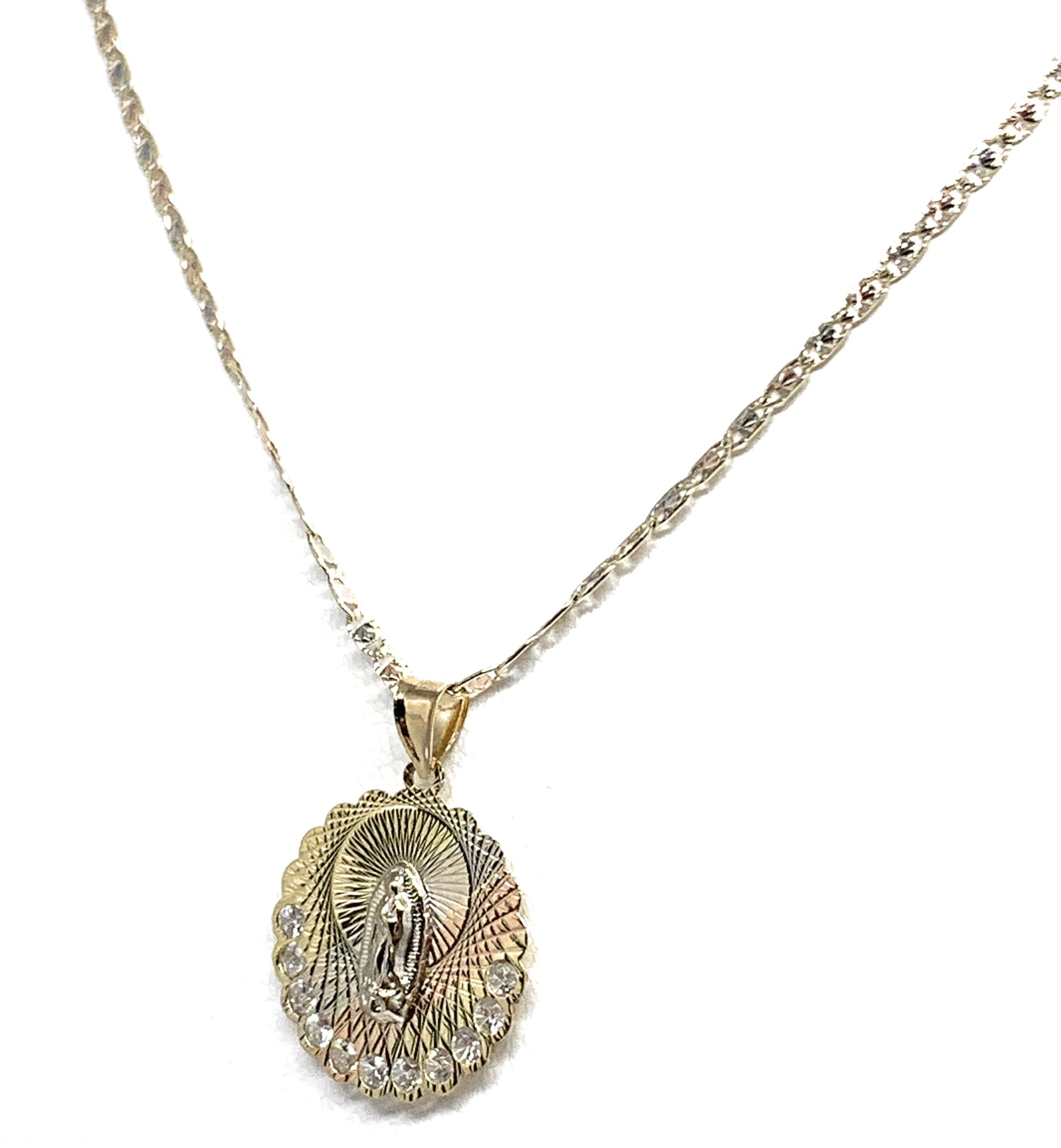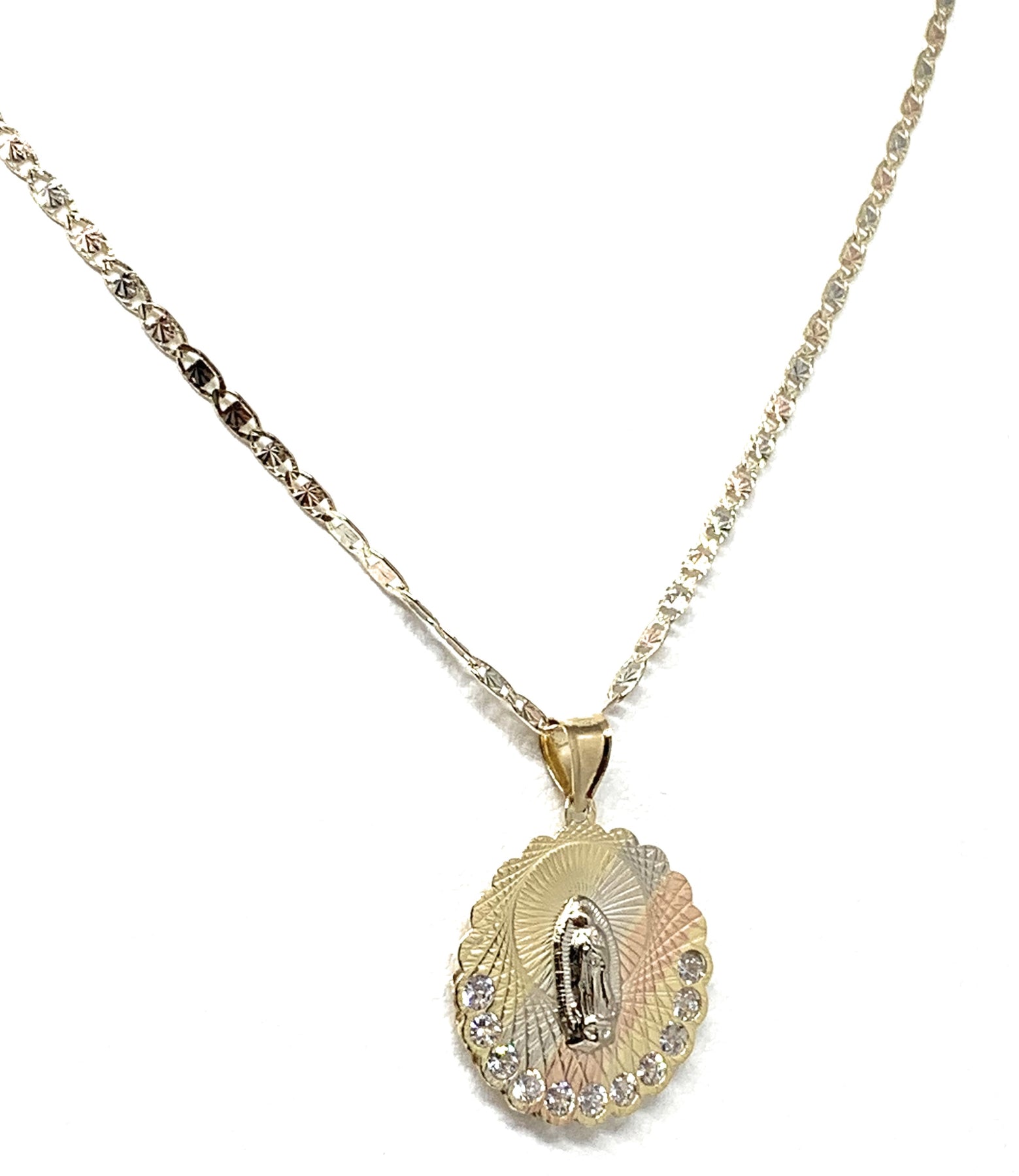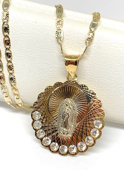 10k Solid Gold Tri-Color Virrgin Mary Pendant Necklace W/ Cubic Zirconia Virrgen Gaudalupe Valentina Chain (MED,SM)