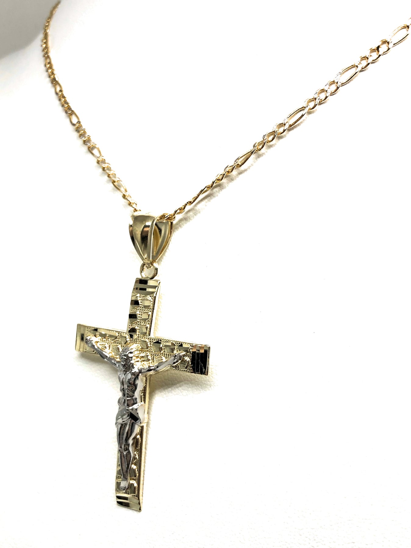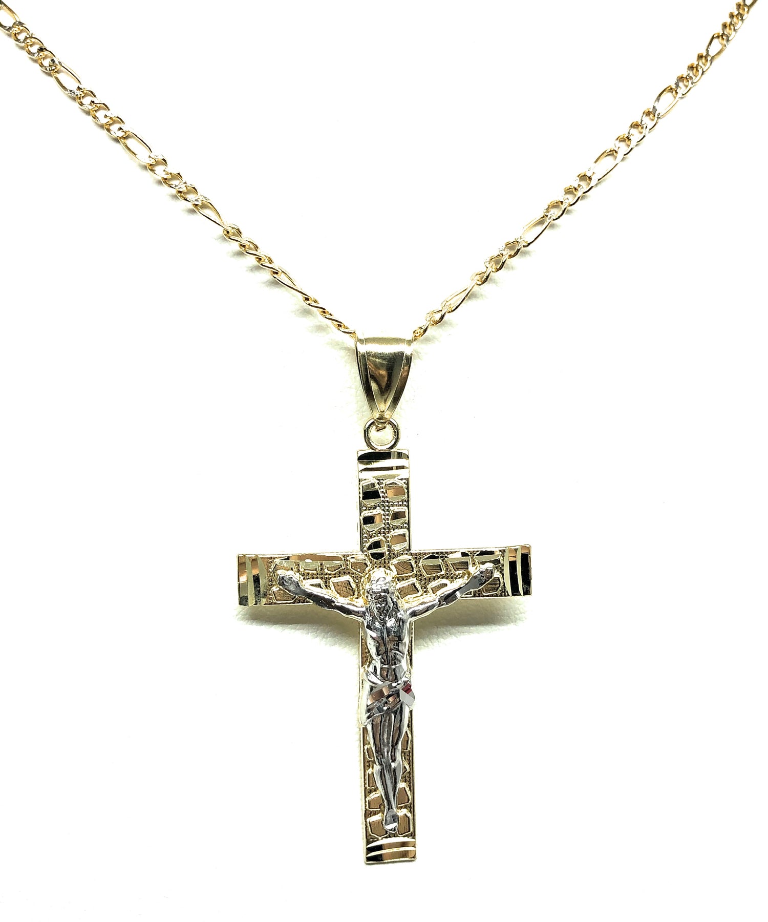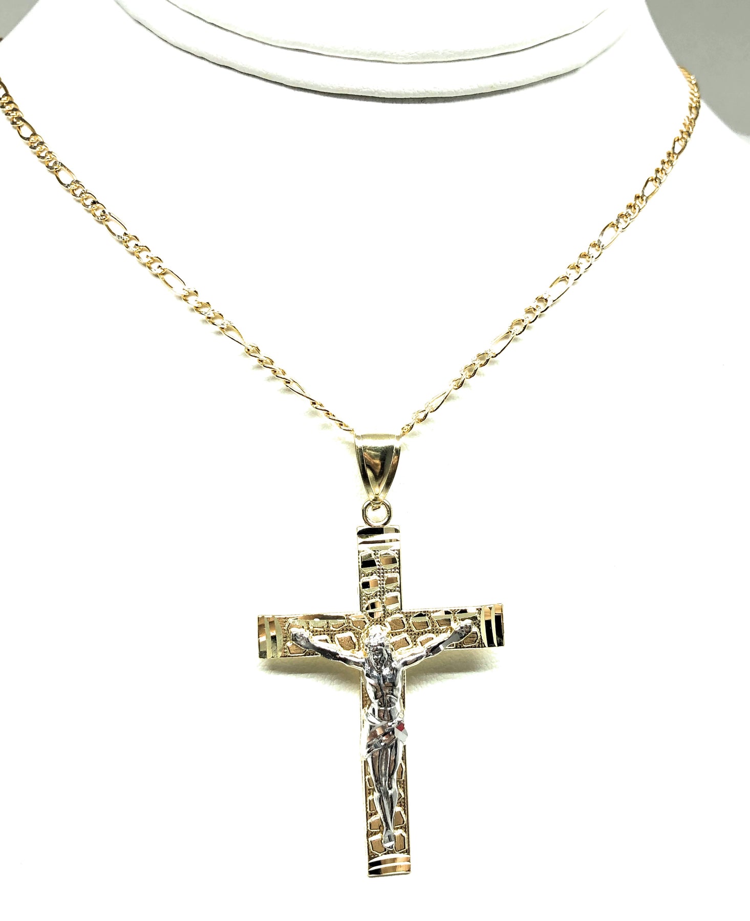 10k Solid Gold Yellow 2-Tone Jesus Cross Crucifix Nugget Pendant Necklace