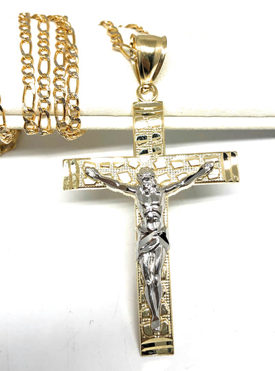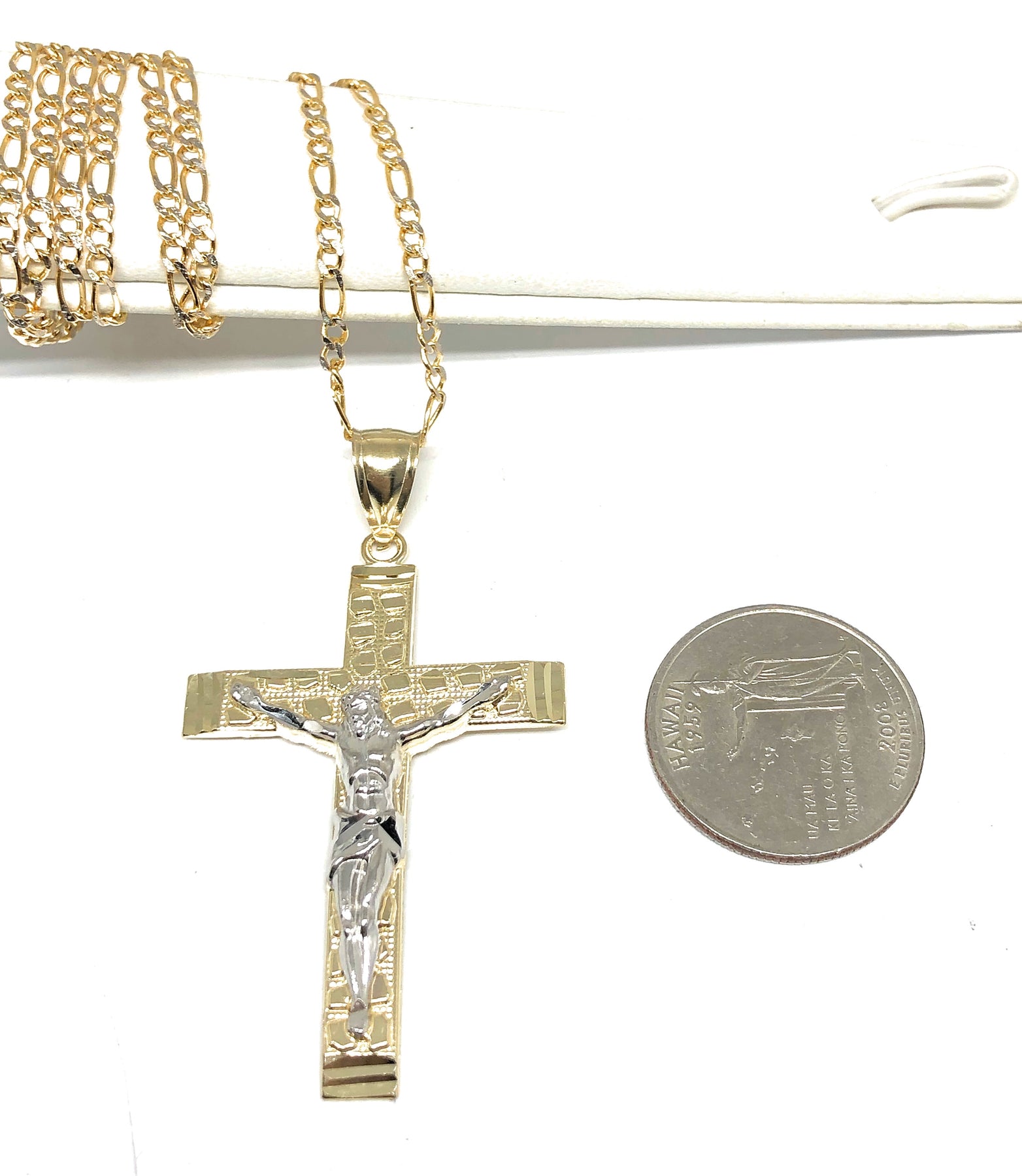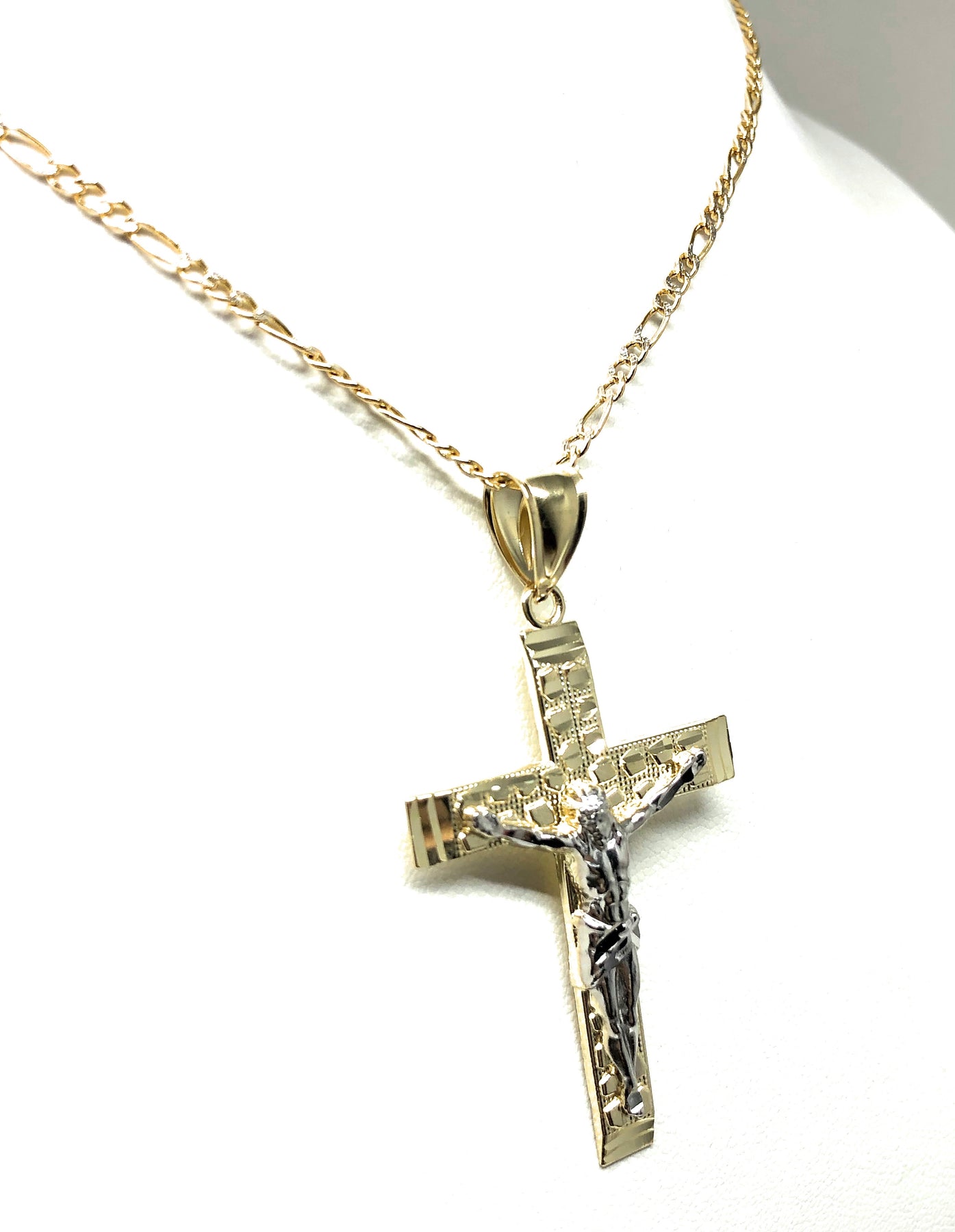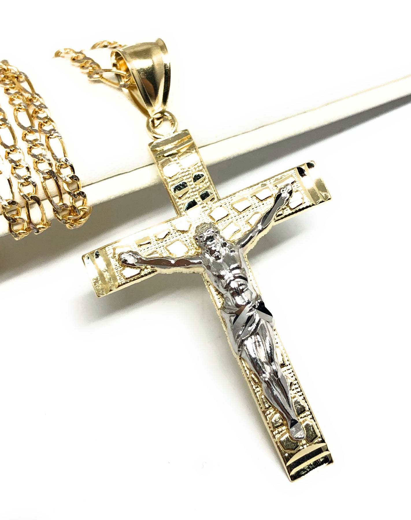 10k Solid Gold Yellow 2-Tone Jesus Cross Crucifix Nugget Pendant Necklace