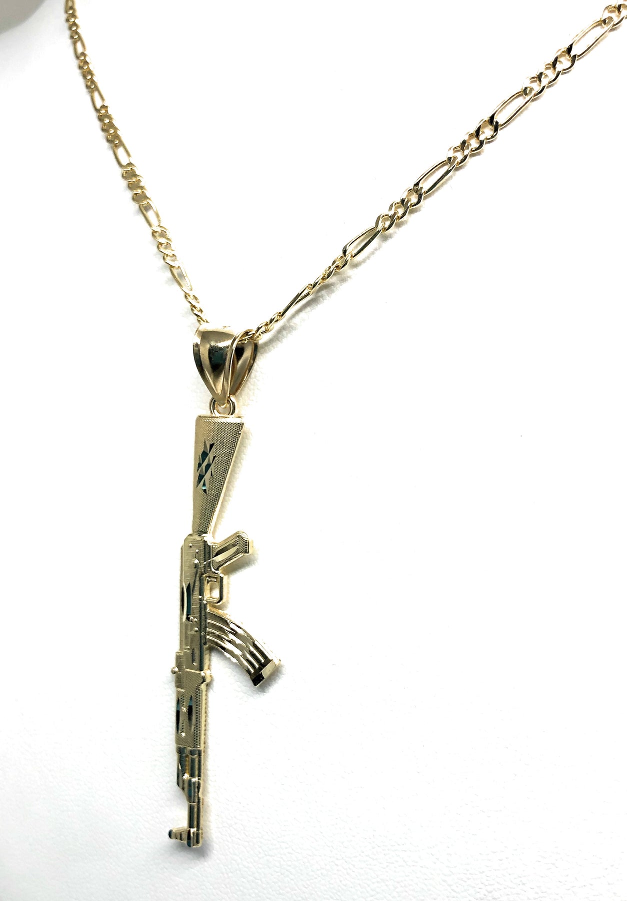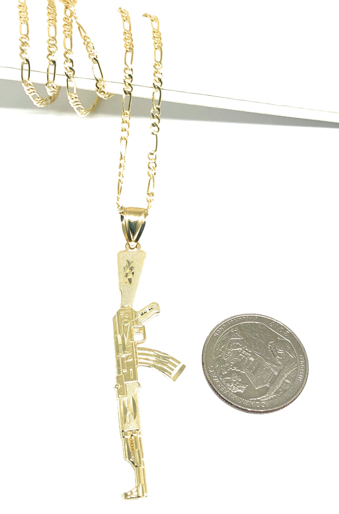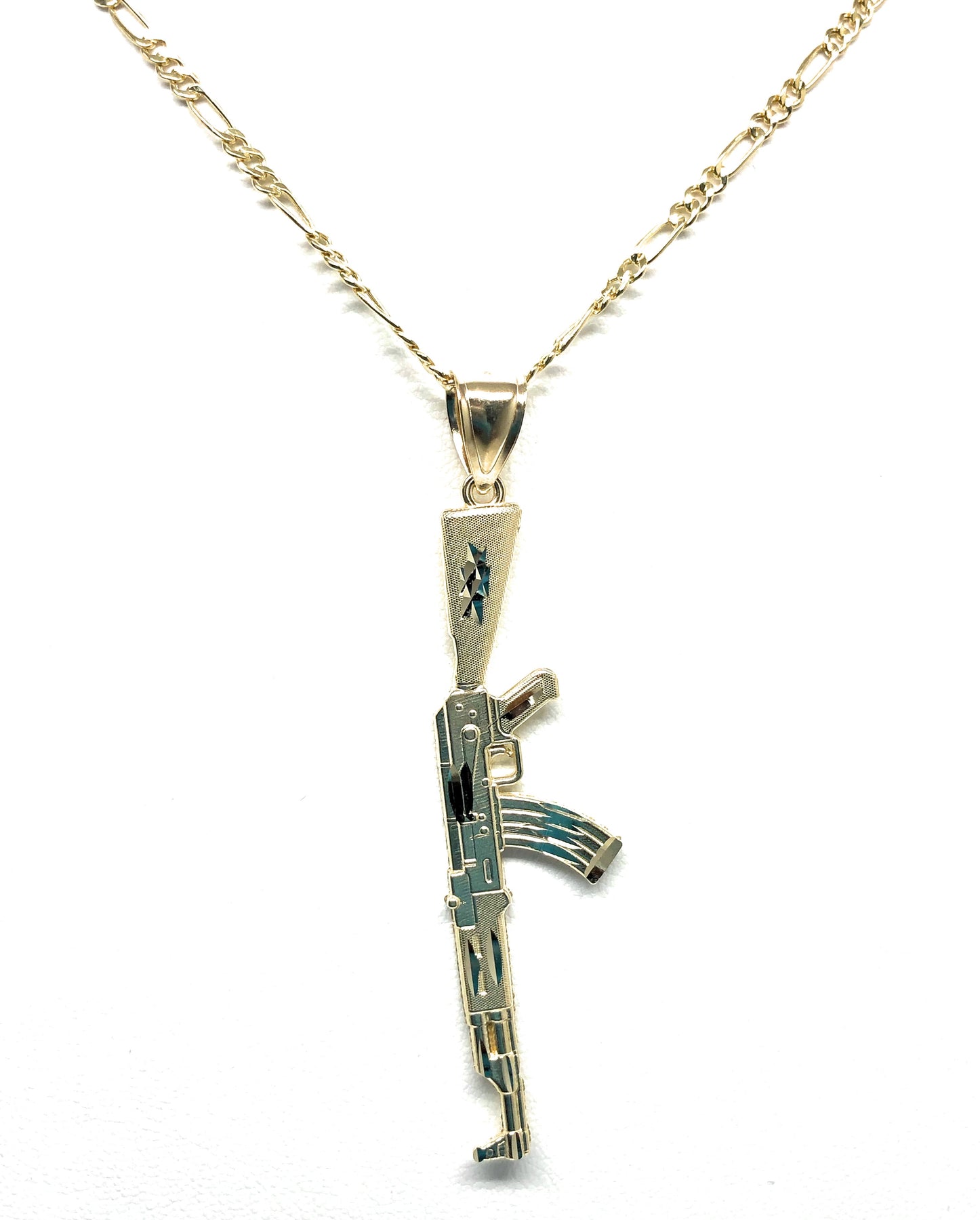 10k Solid Gold Yellow Classic Machine Gun AK-47 Detailed Pendant Necklace