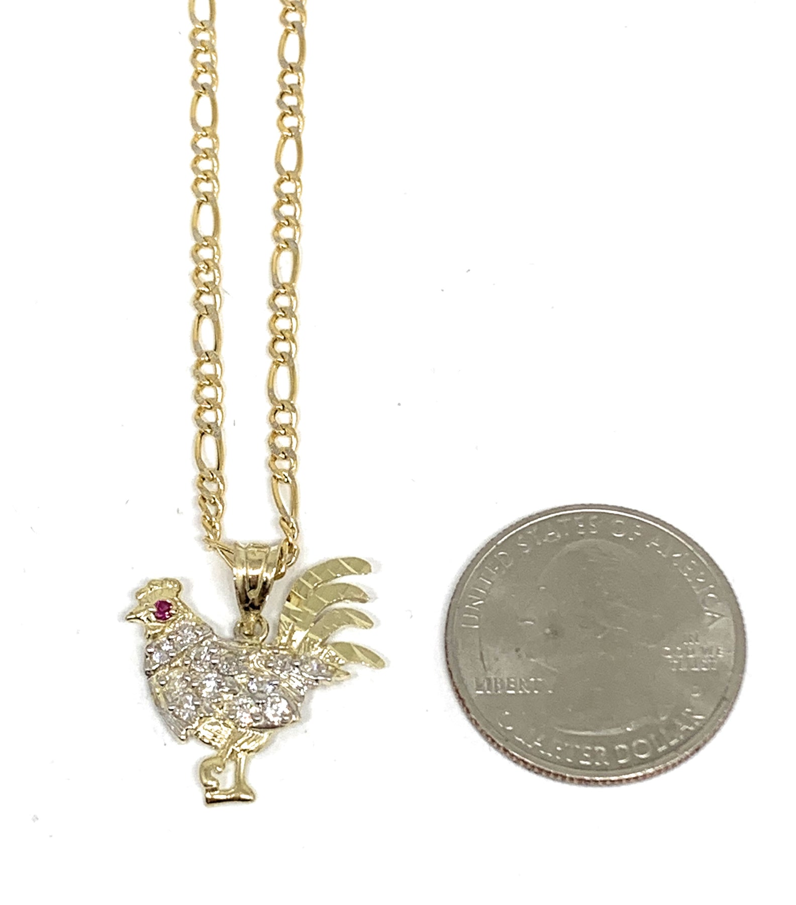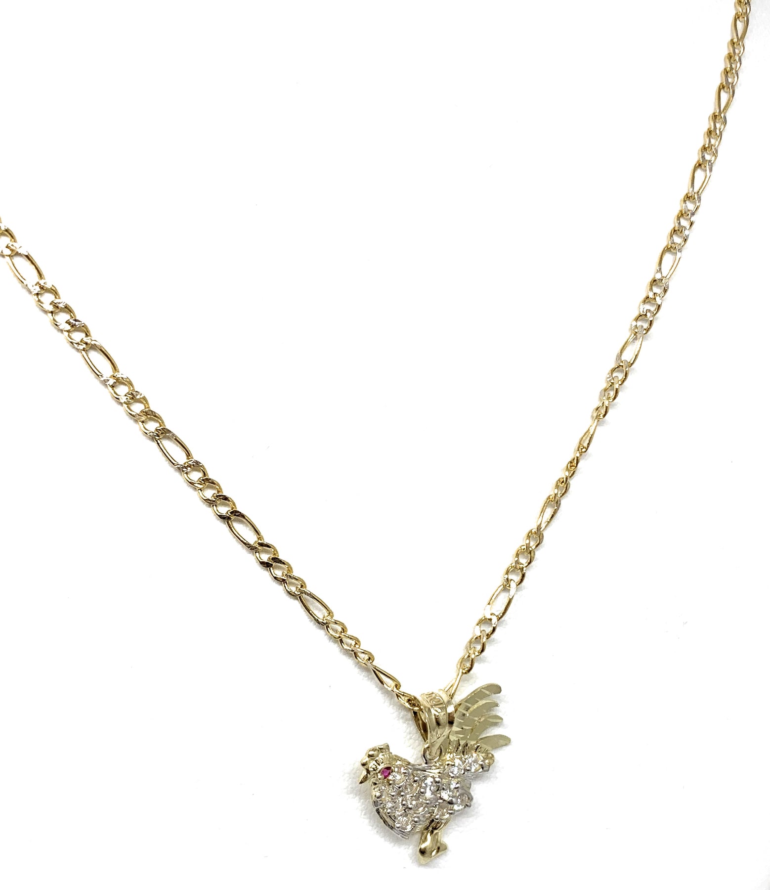 10k Solid Gold Yellow Cubic Zirconia White Rooster Pendant Necklace