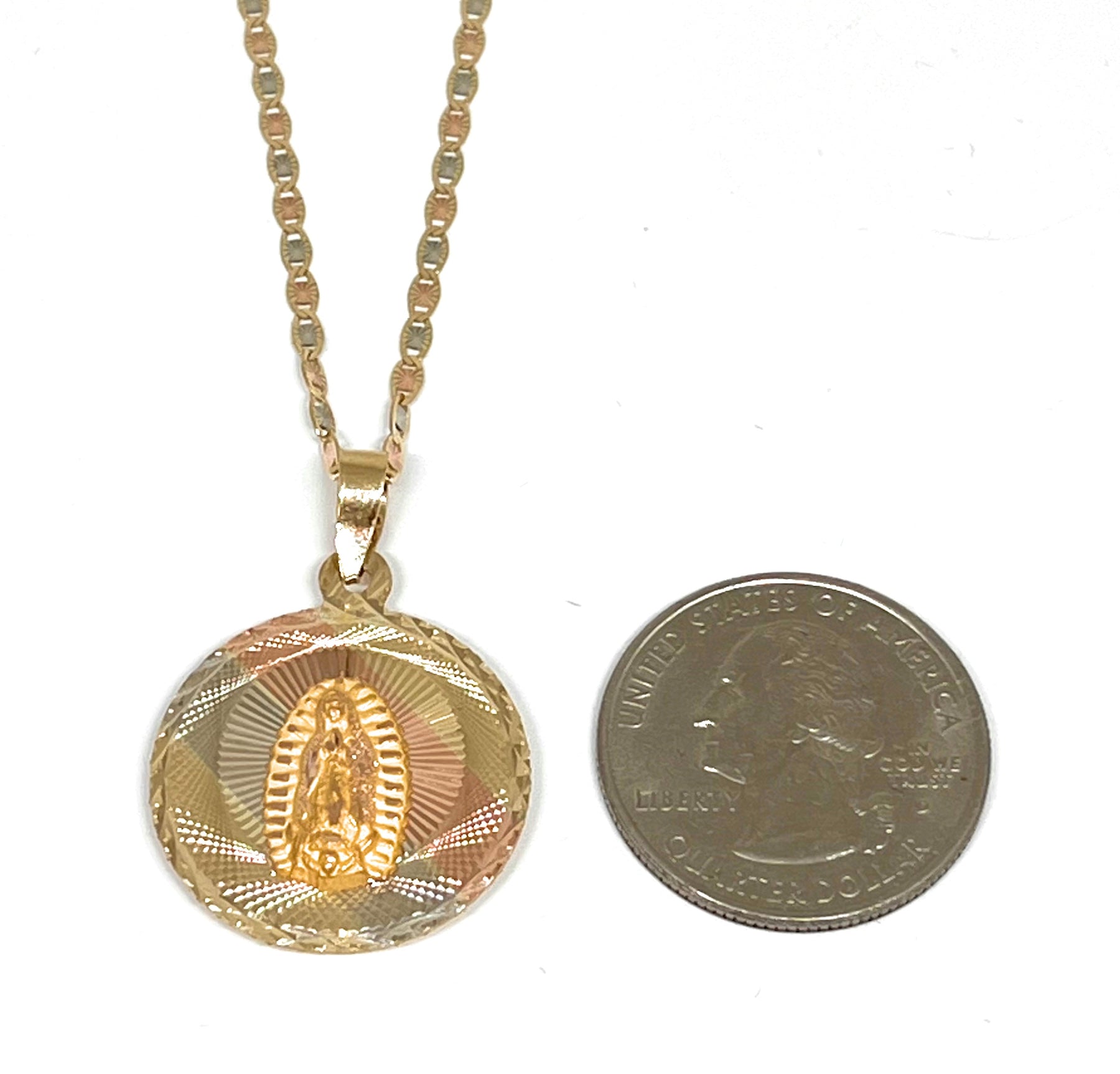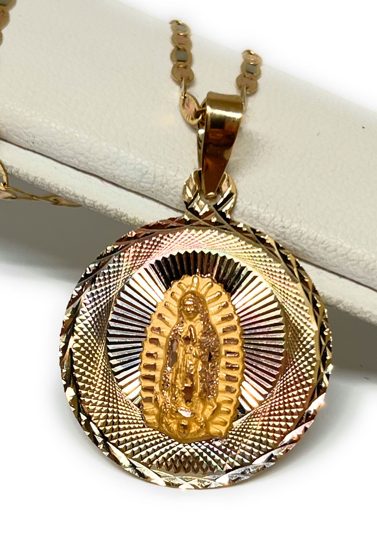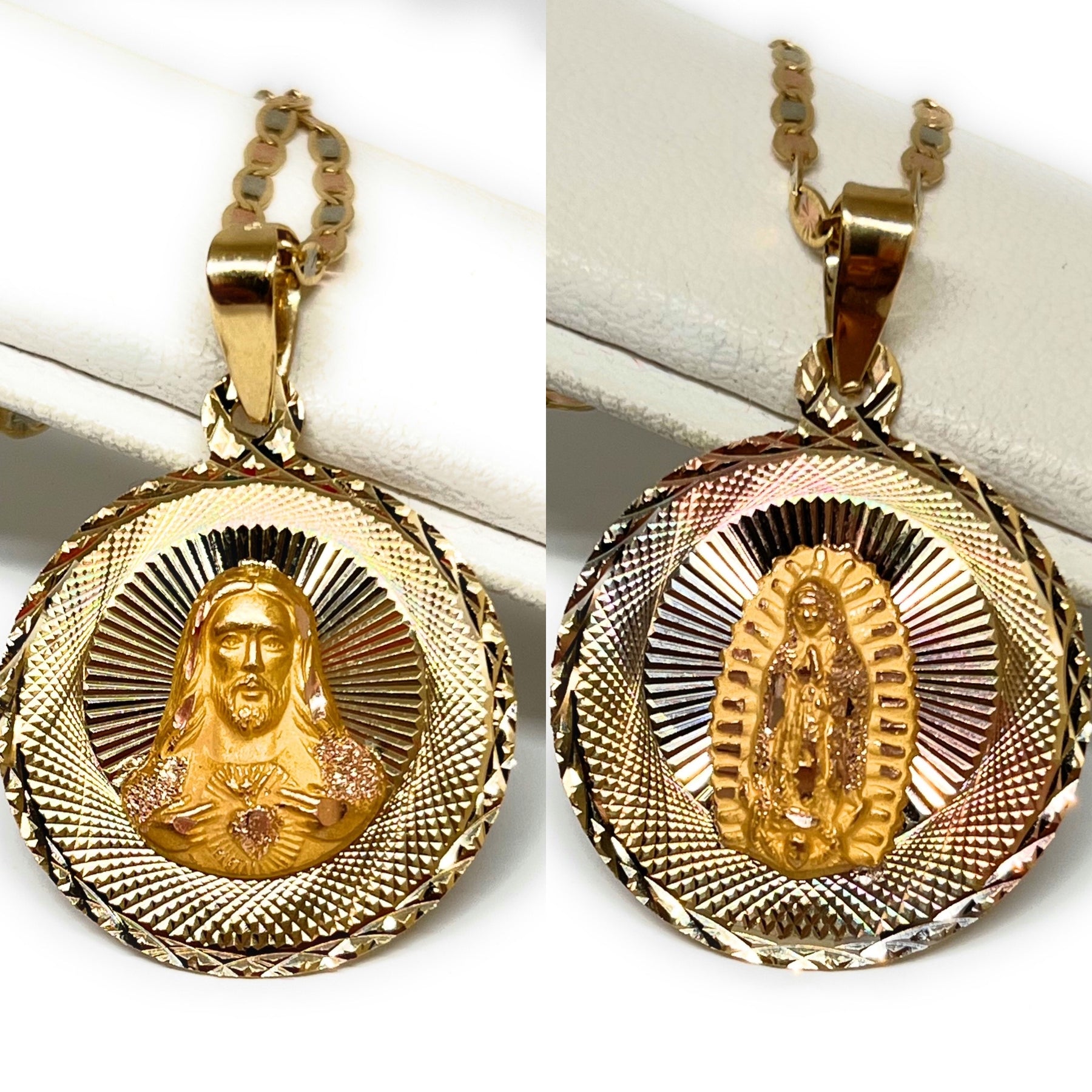 10k Solid Gold Tri-Color Jesus Sagrado Corazon & Virrgin Mary Double Sided Pendant Necklace (MADE IN MX) (MED, LG)