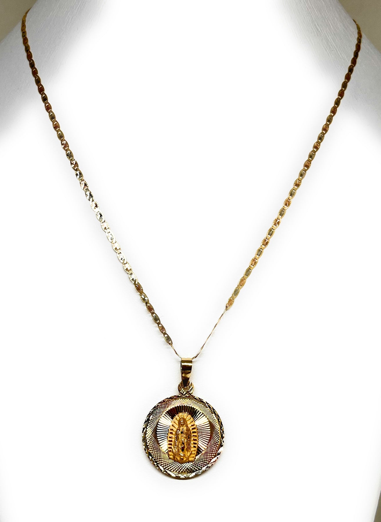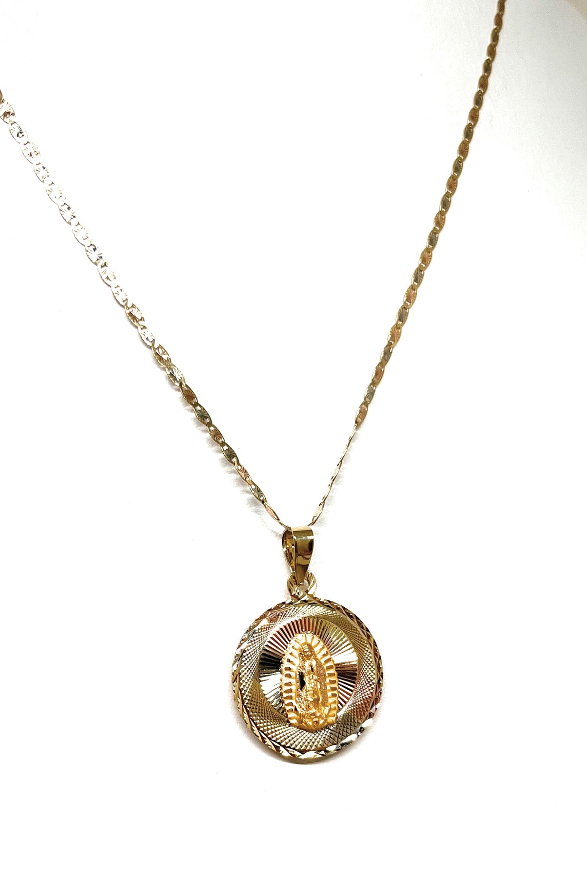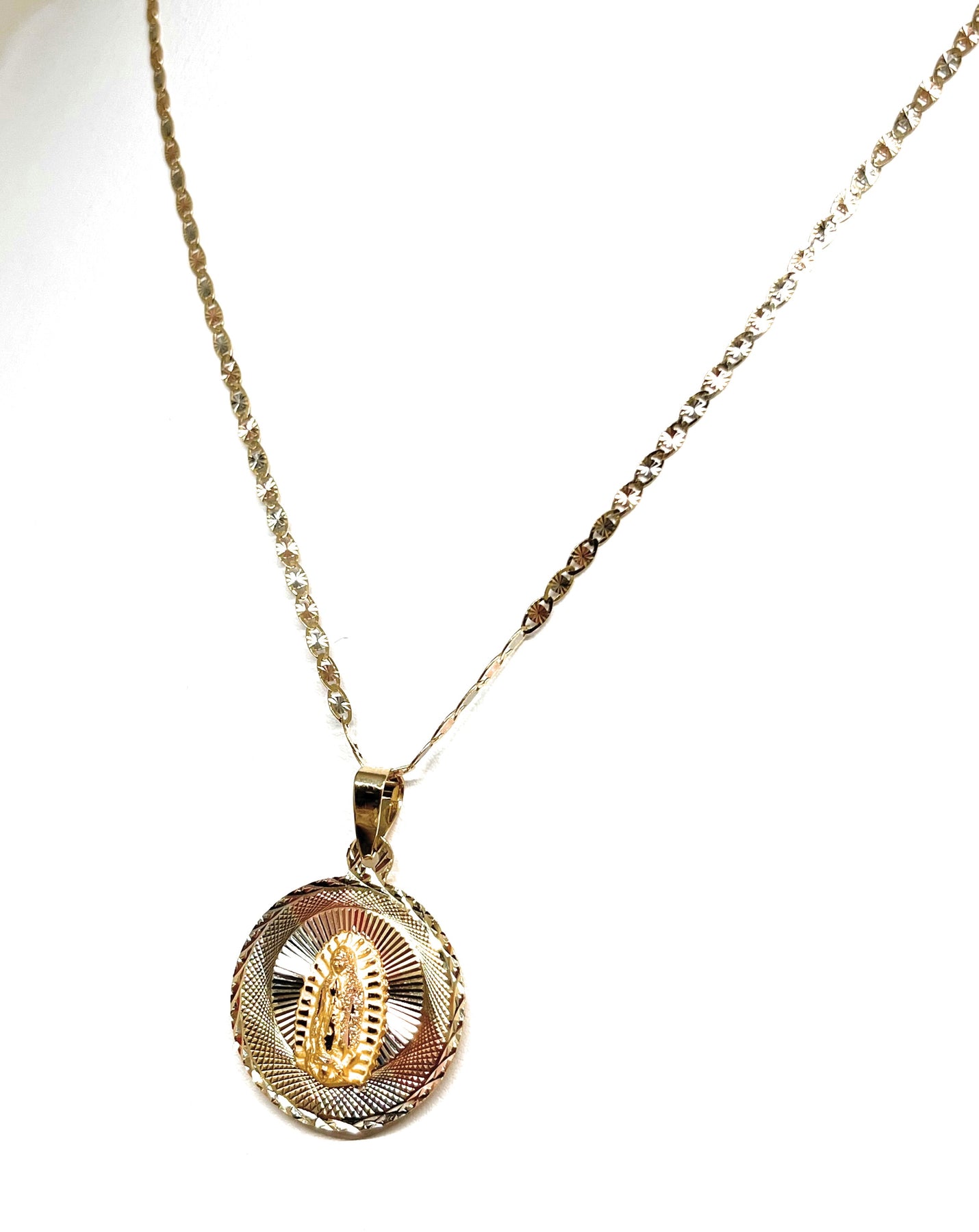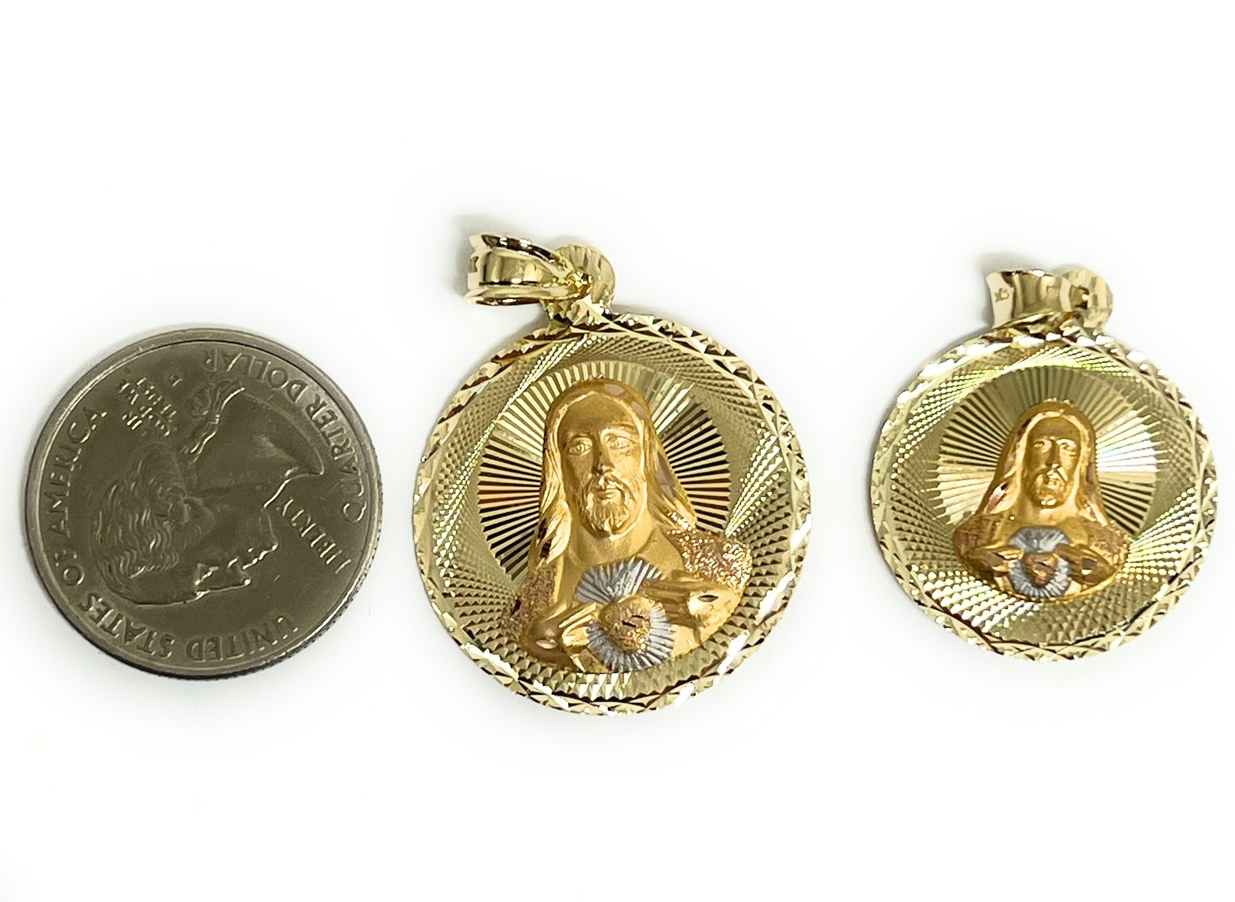 10k Solid Gold Tri-Color Jesus Sagrado Corazon & Virrgin Mary Double Sided Pendant Necklace (MADE IN MX) (MED, LG)