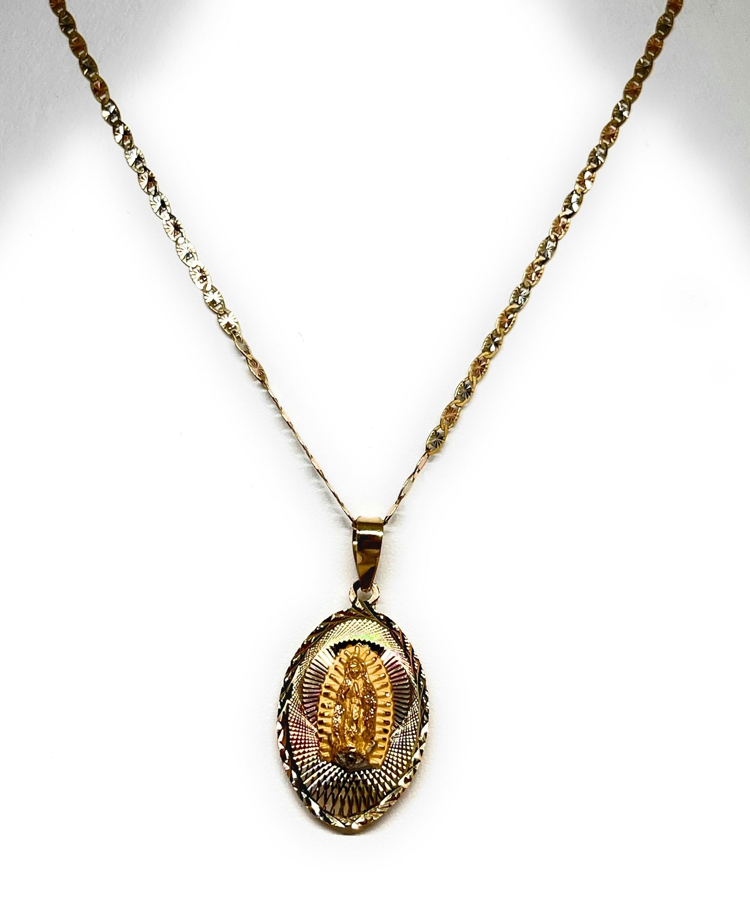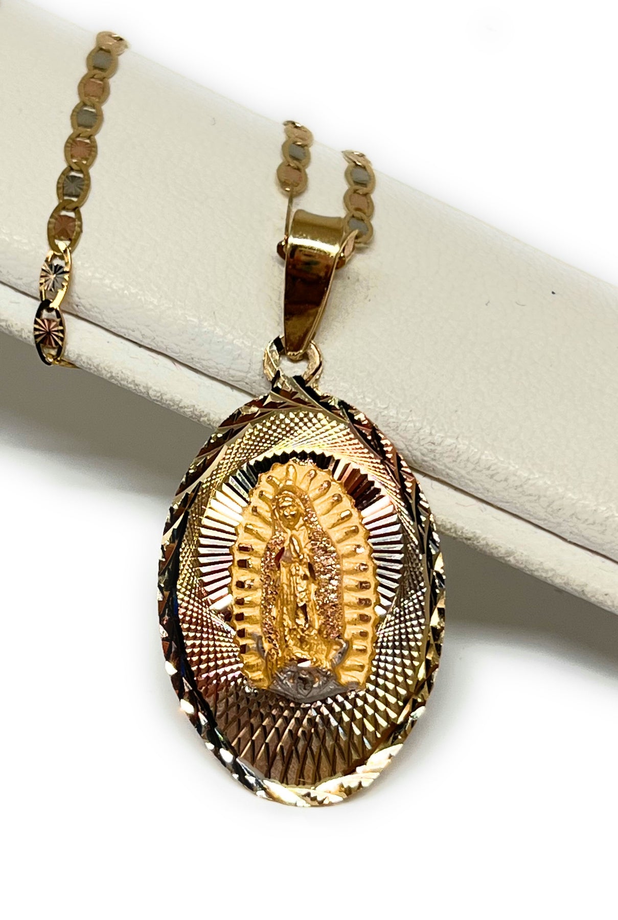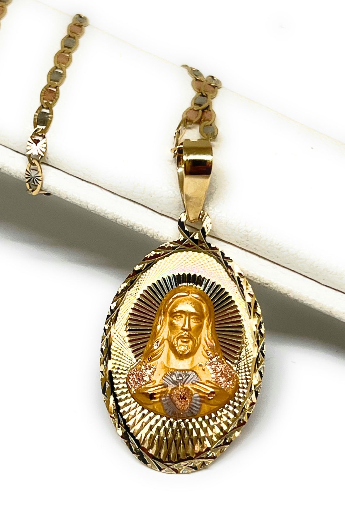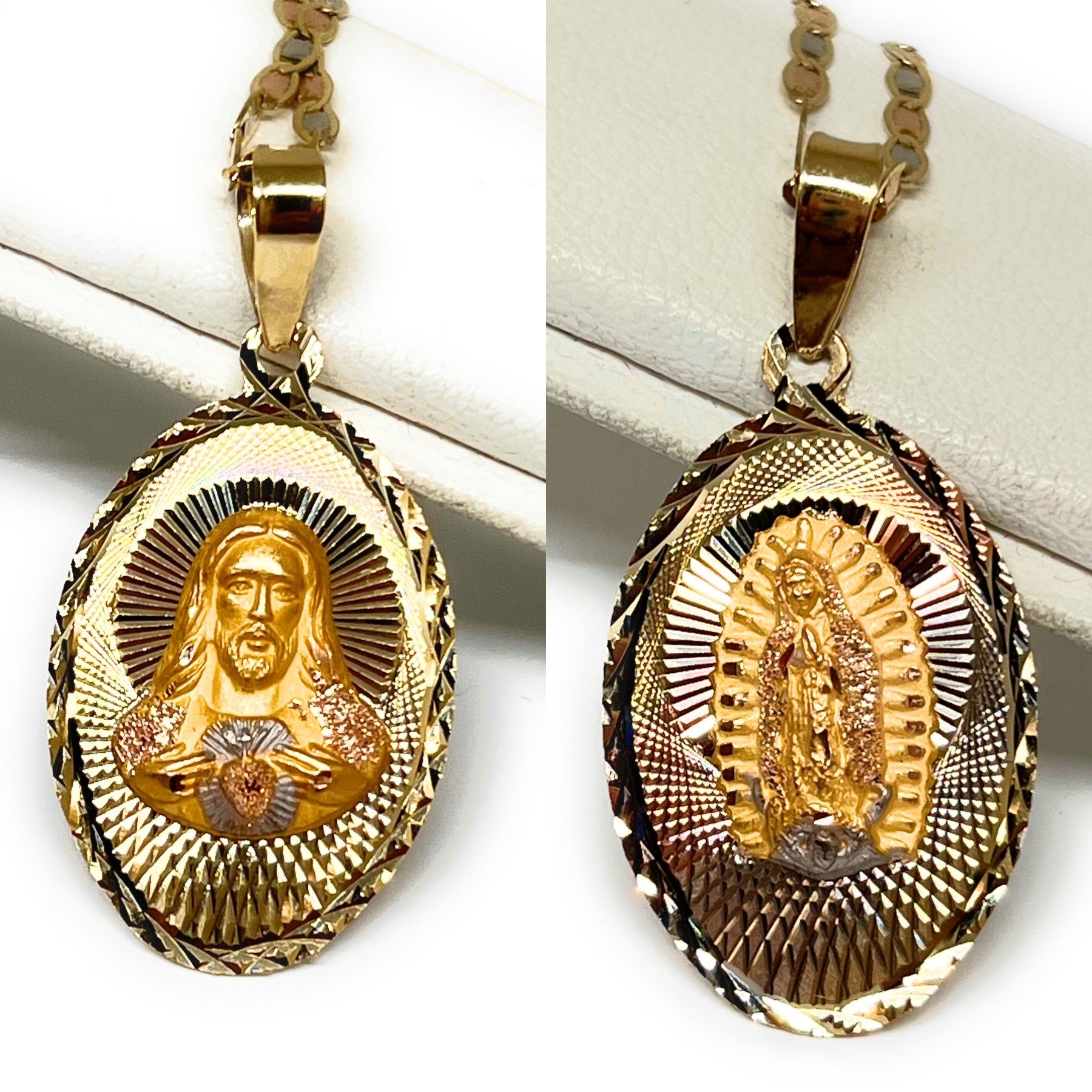 10k Solid Gold Tri-Color Jesus Sagrado Corazon & Virrgin Mary Double Sided Pendant Necklace (MADE IN MX)