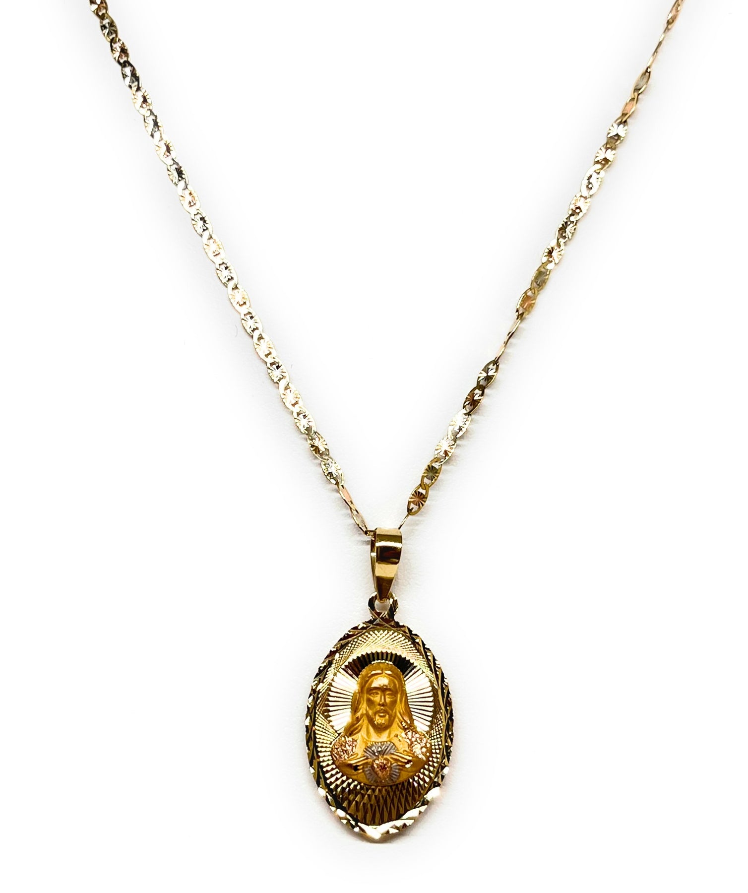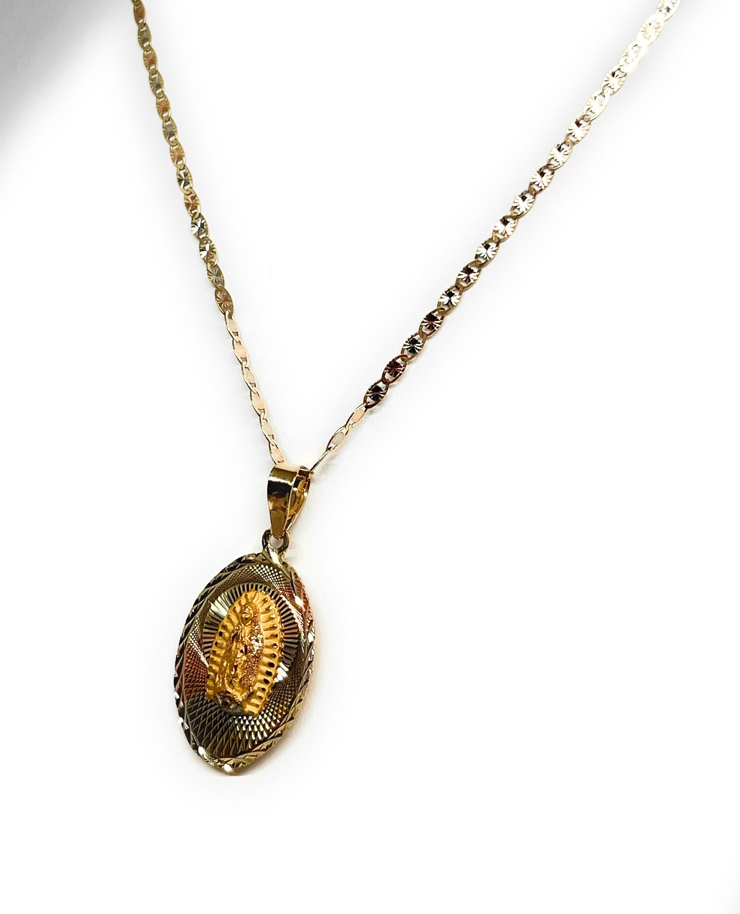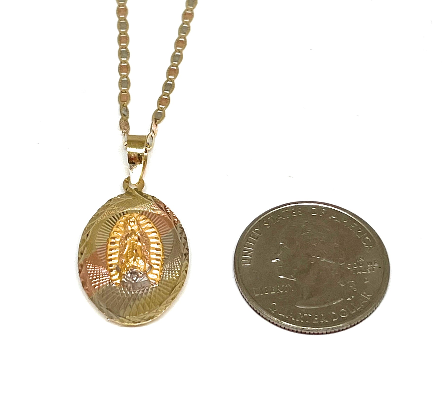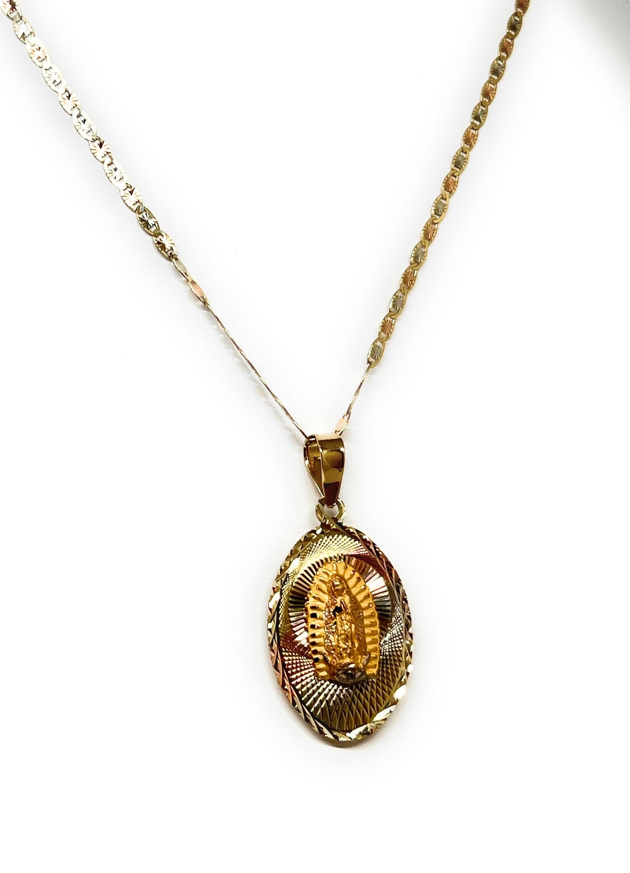10k Solid Gold Tri-Color Jesus Sagrado Corazon & Virrgin Mary Double Sided Pendant Necklace (MADE IN MX)
