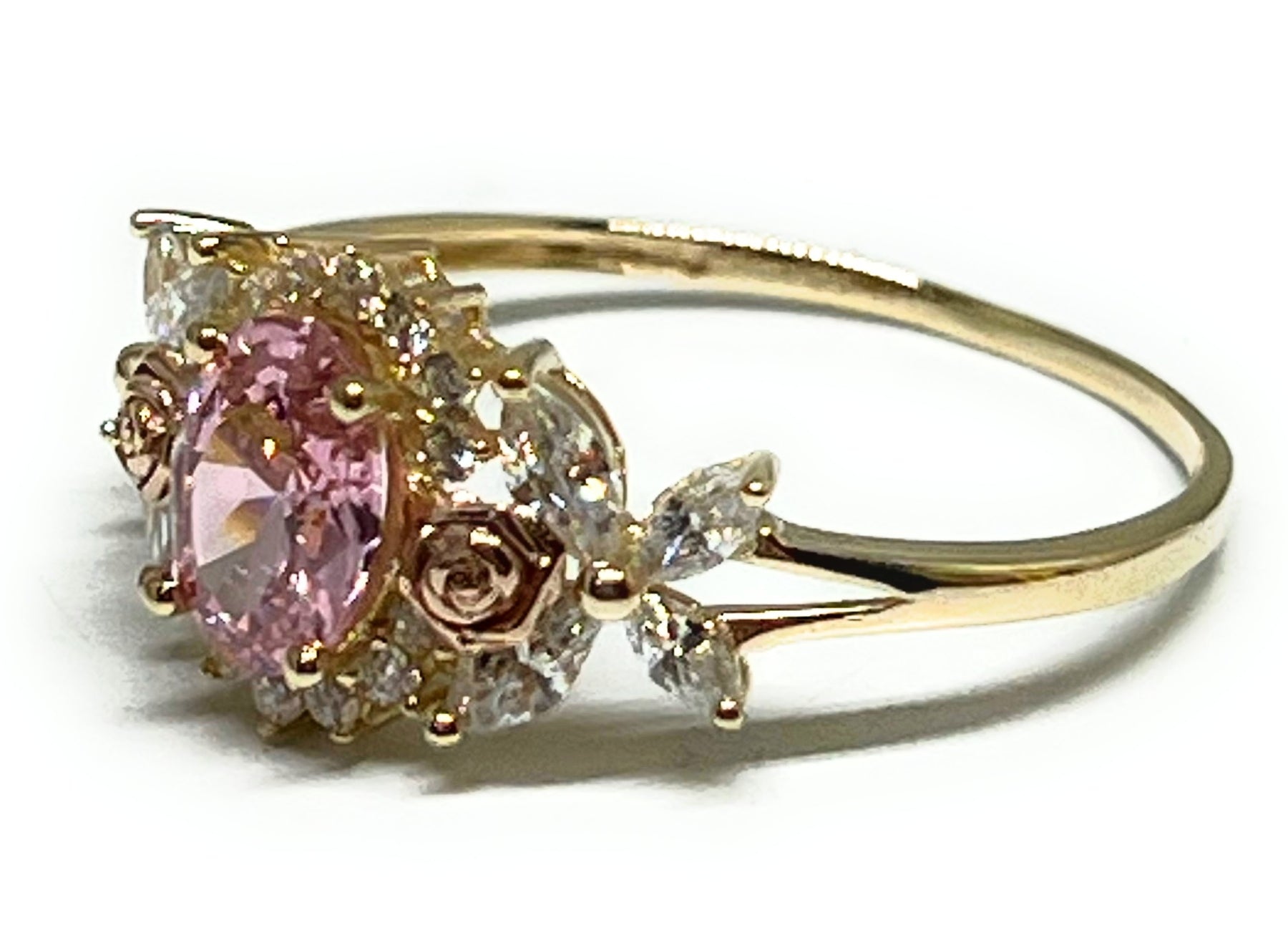 • Pink CZ round design with white cubic zirconia stones in sides and rose gold flower embroidery.