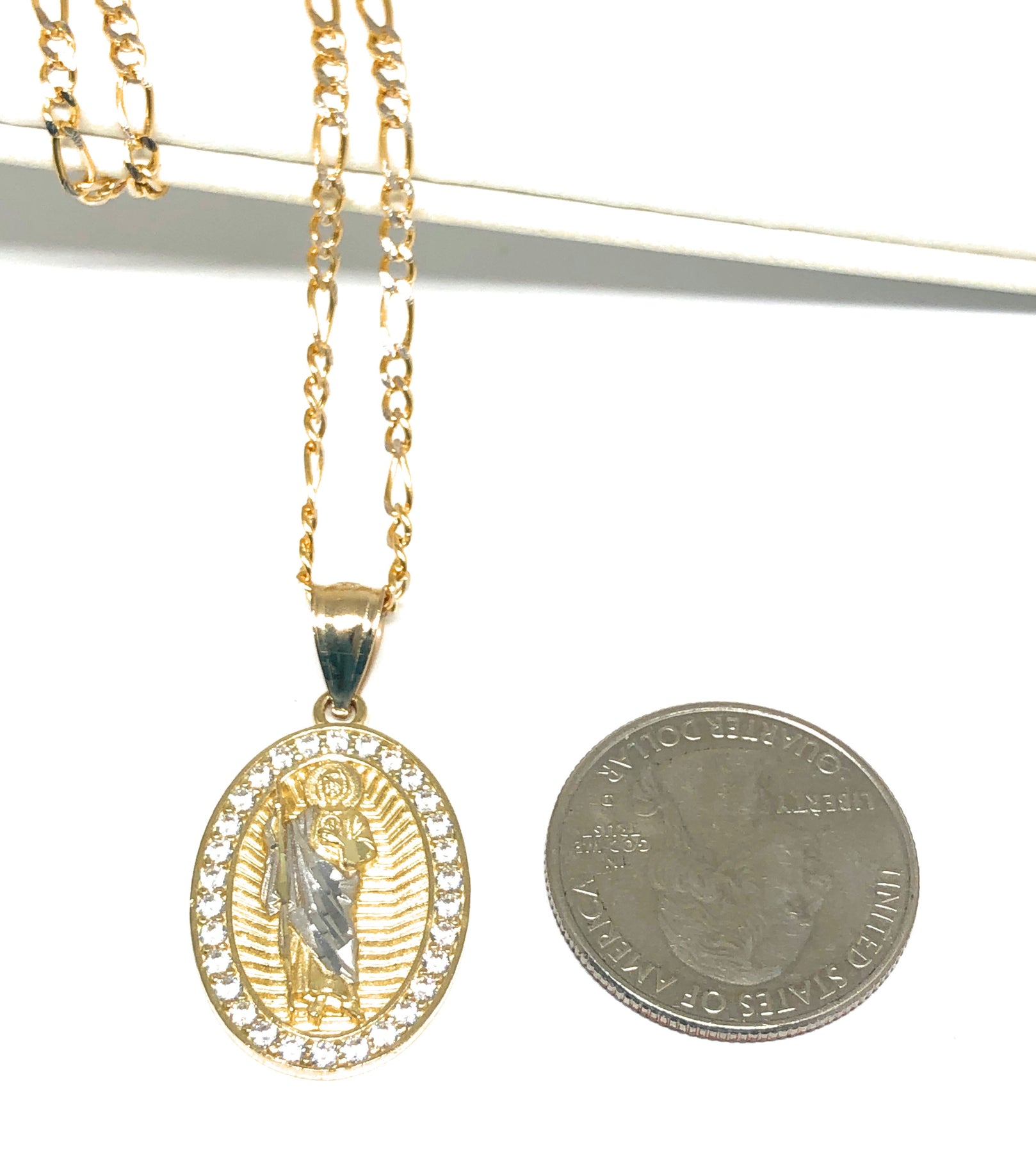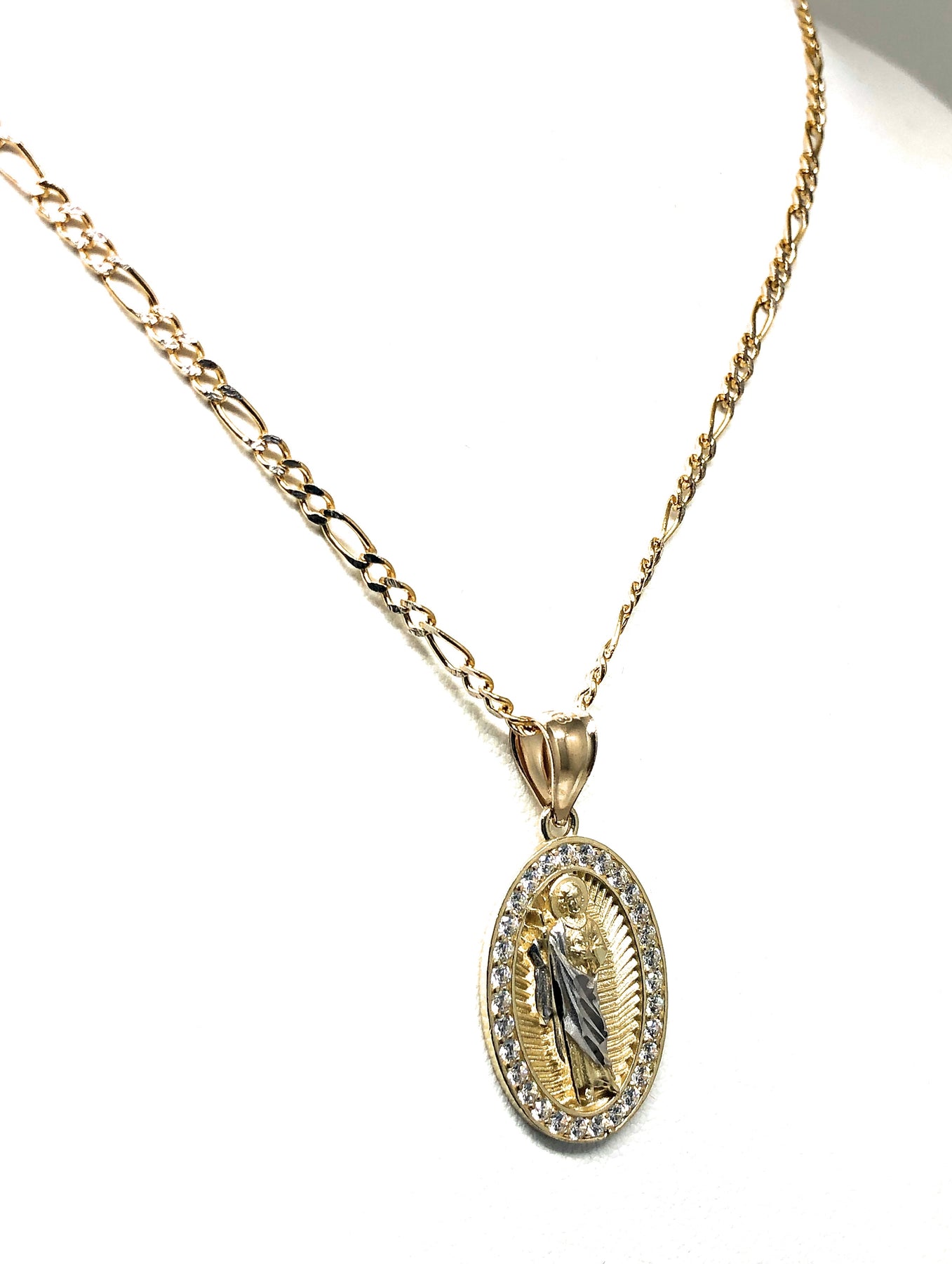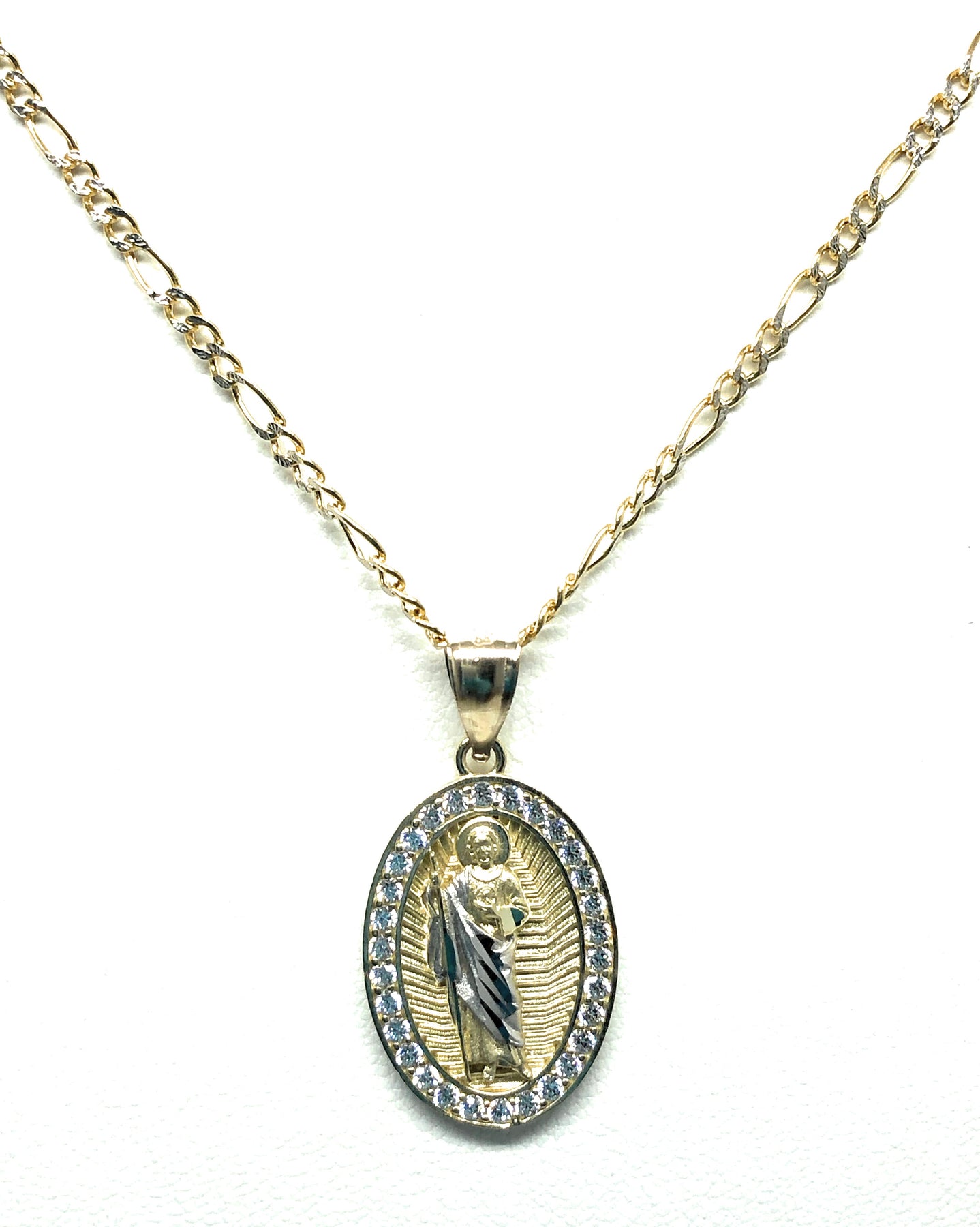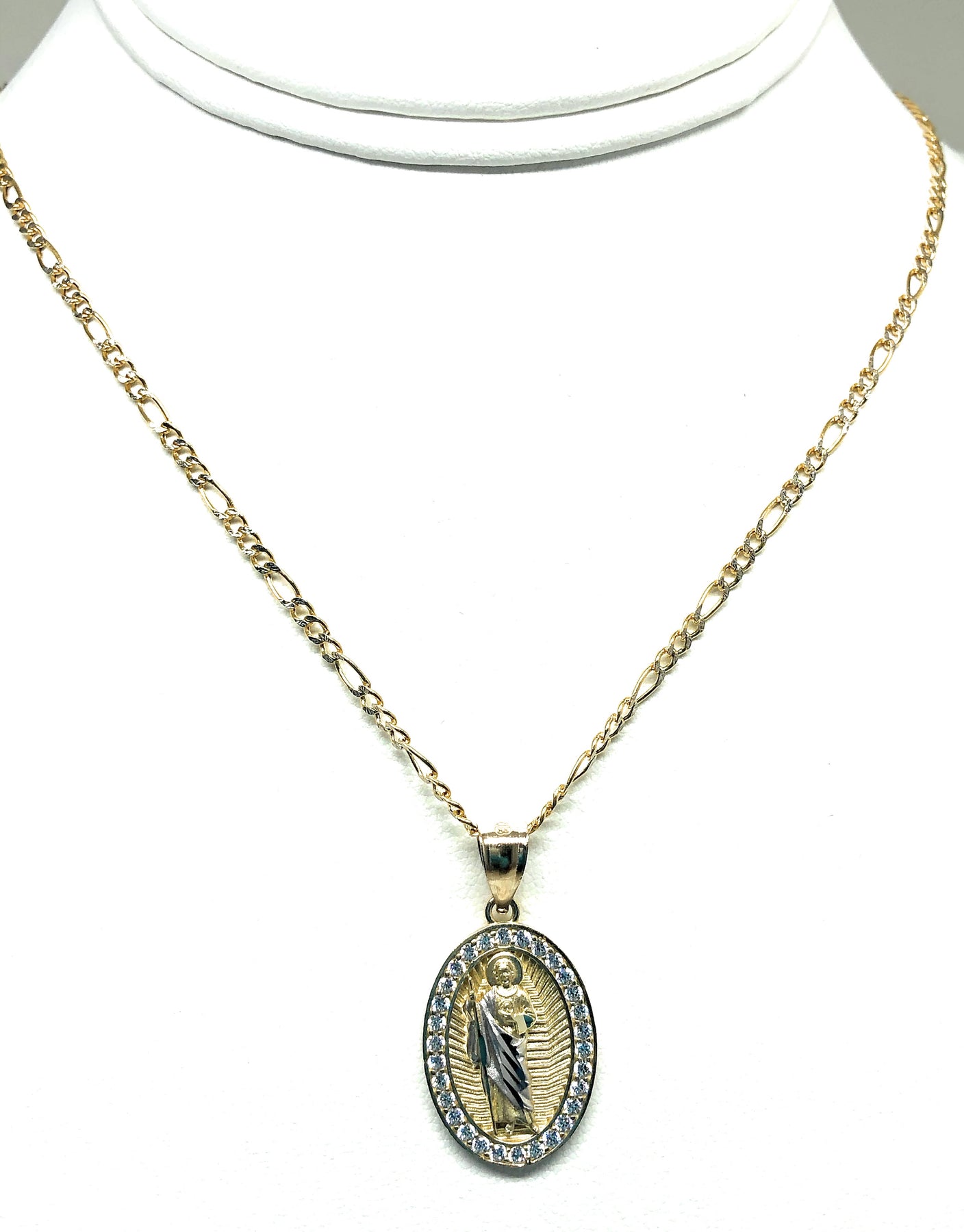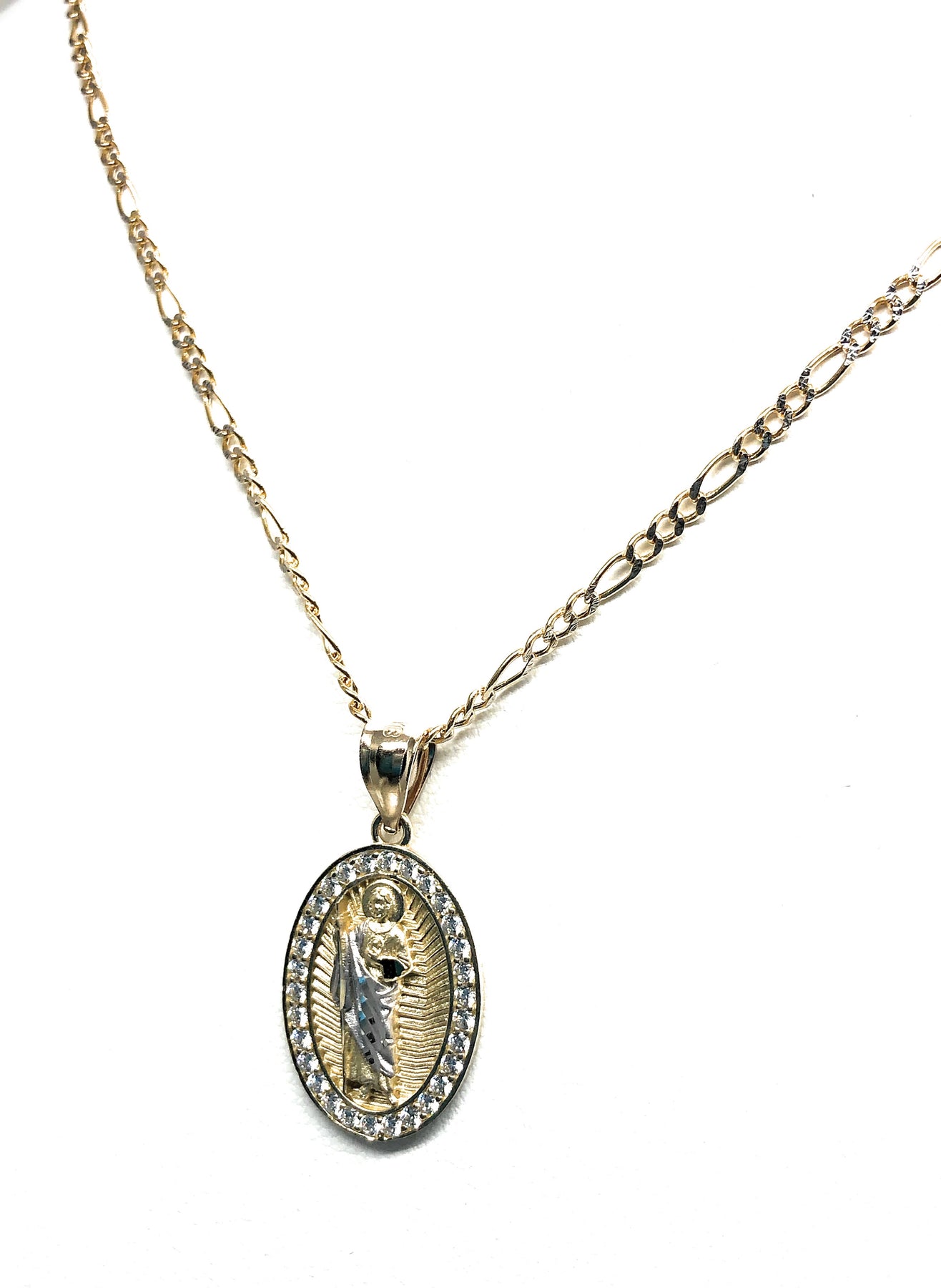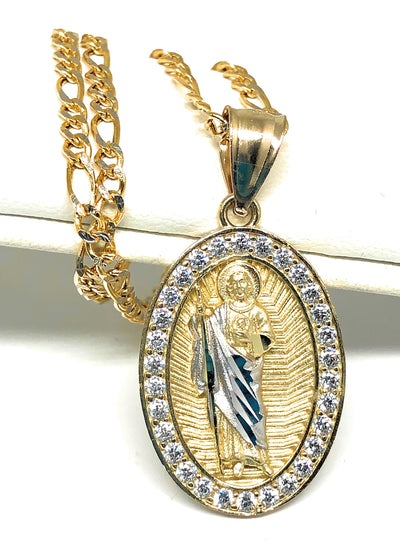 10k Solid Gold Yellow Saan Judas Saaint Jude Oval Layered CZ Pendant with Figaro Chain Optional