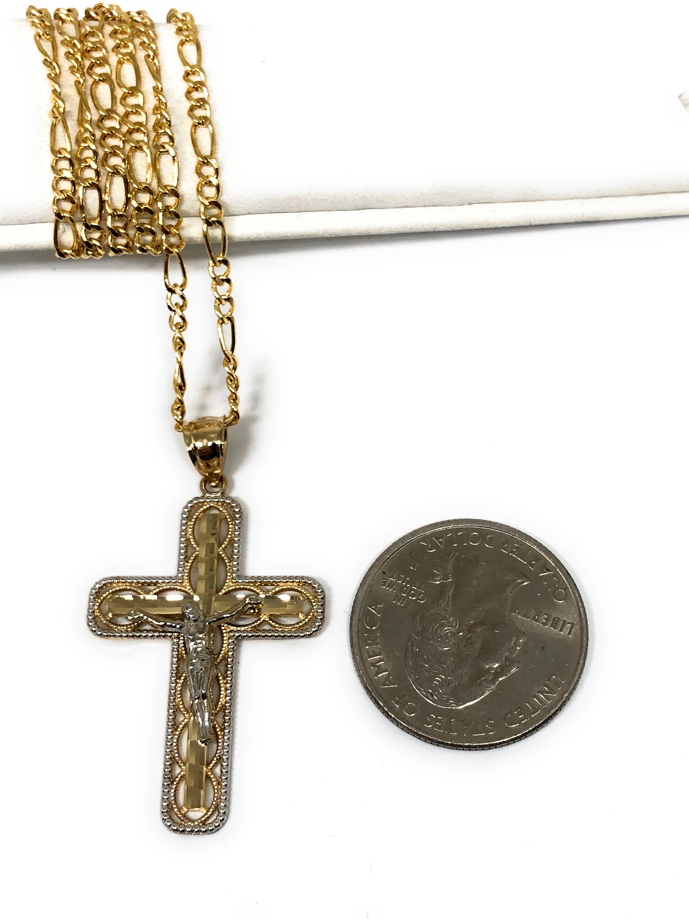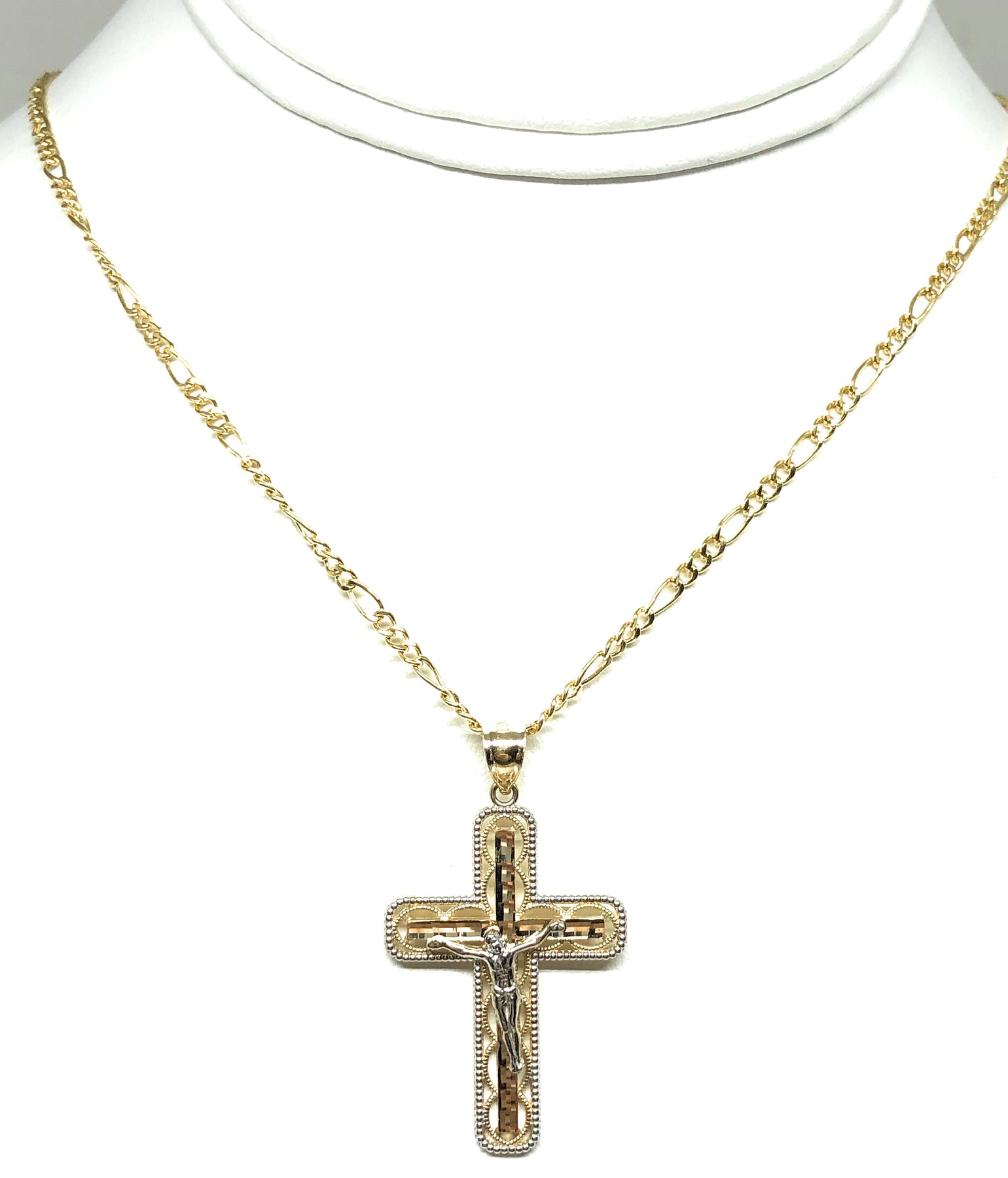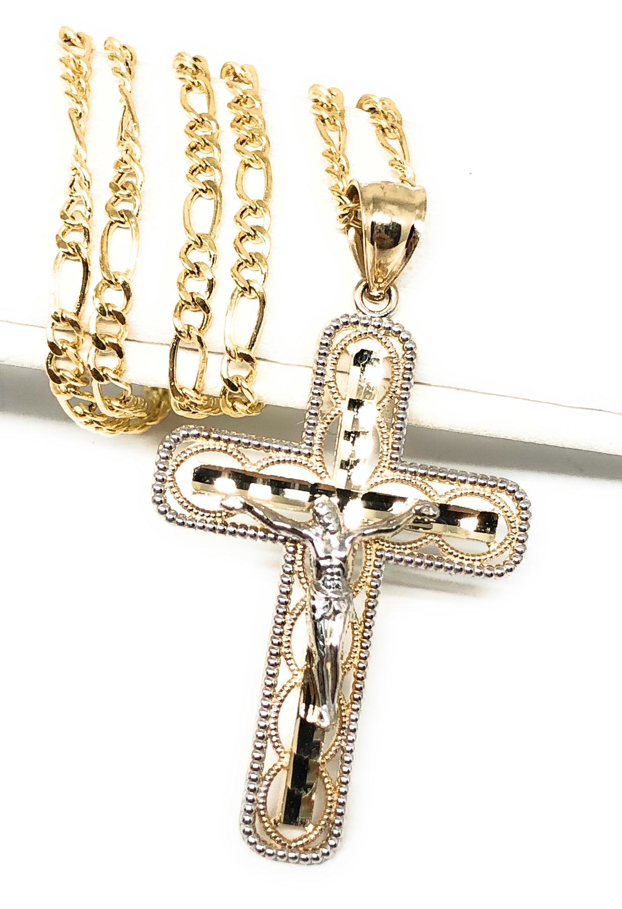 14k Solid Gold 2-Tone Classic Jesus Cross Pendant Necklace Crucifix With Figaro Chain