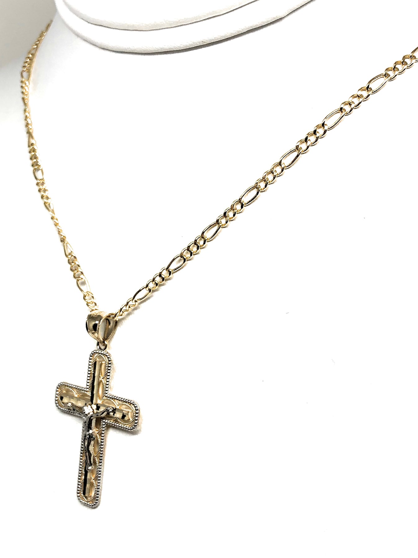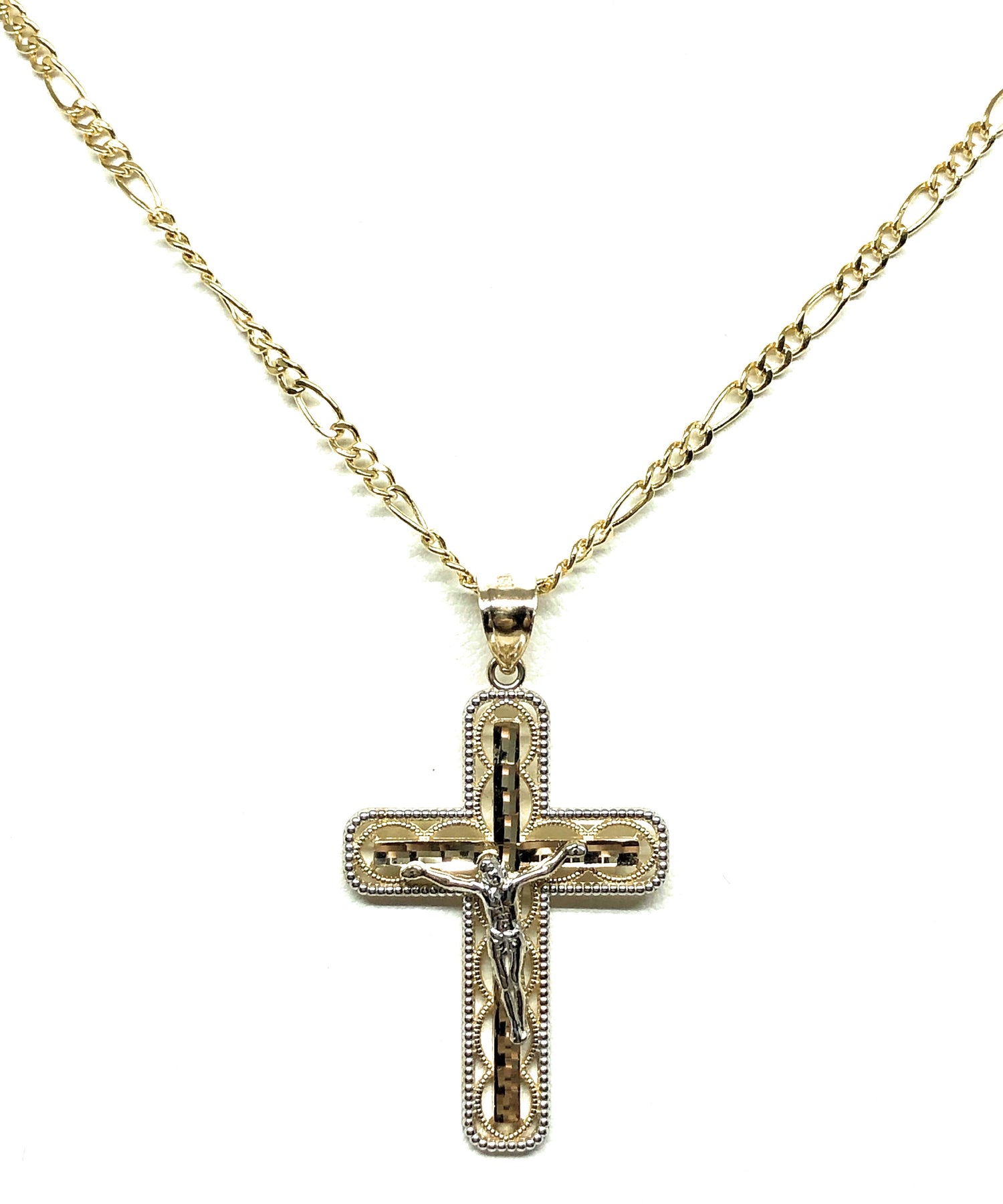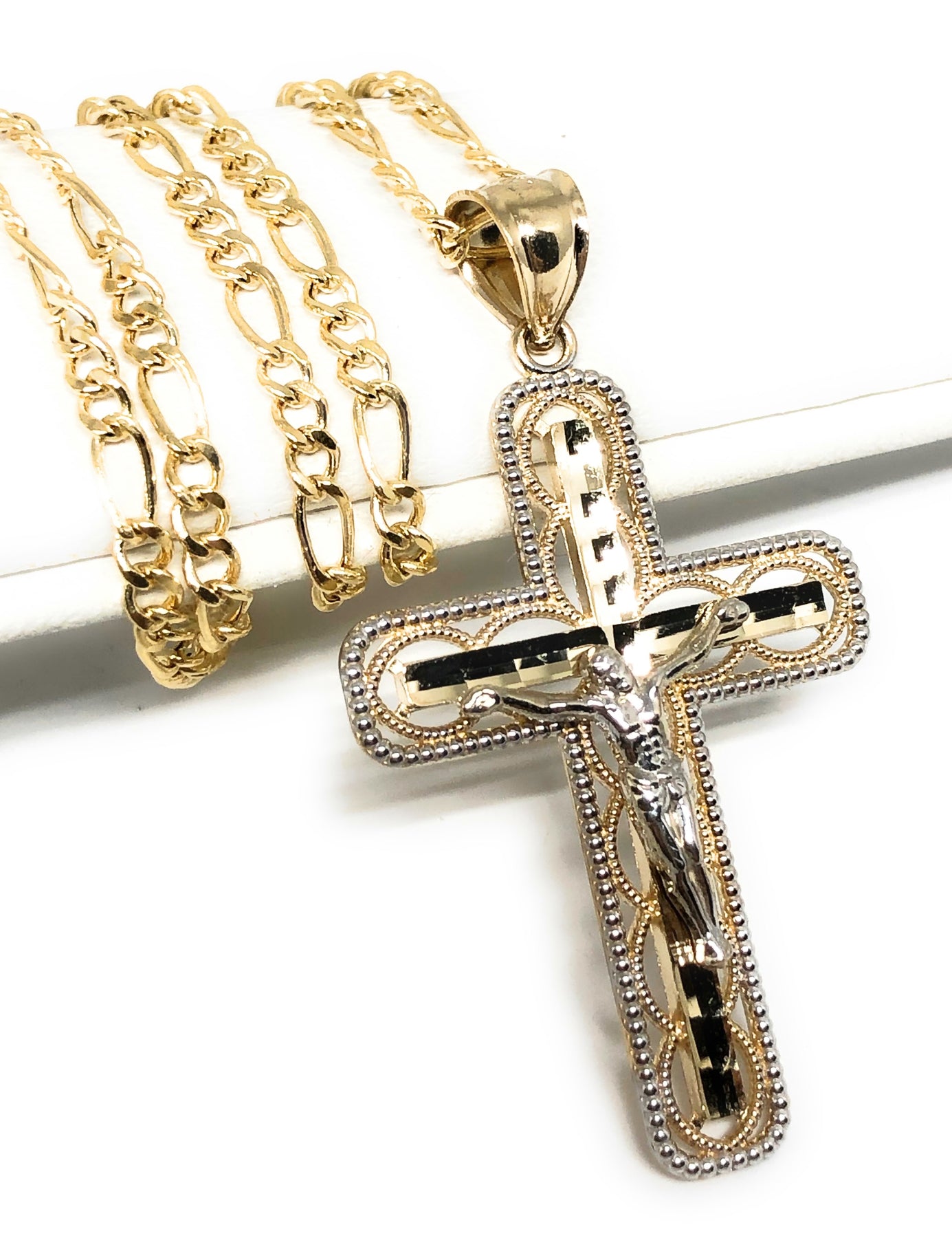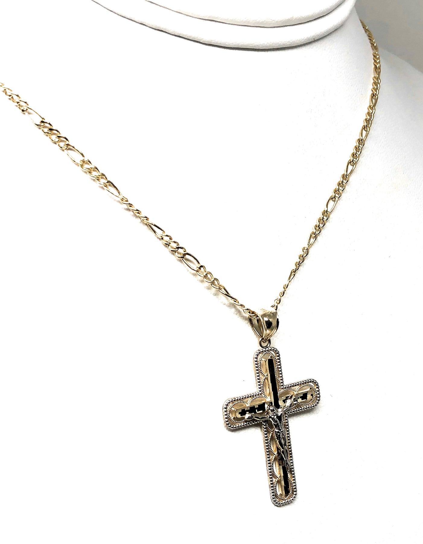14k Solid Gold 2-Tone Classic Jesus Cross Pendant Necklace Crucifix With Figaro Chain