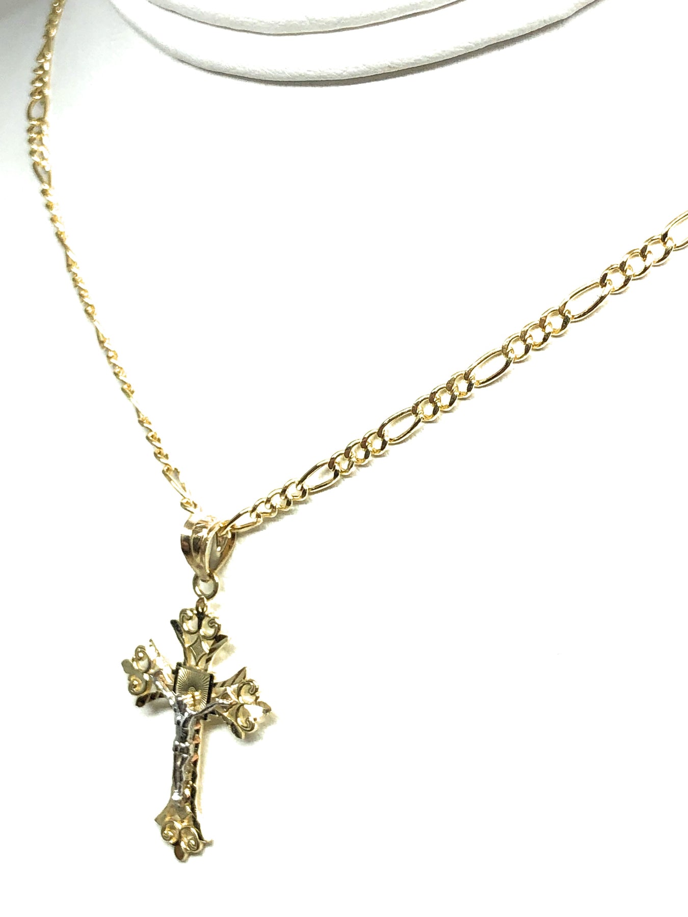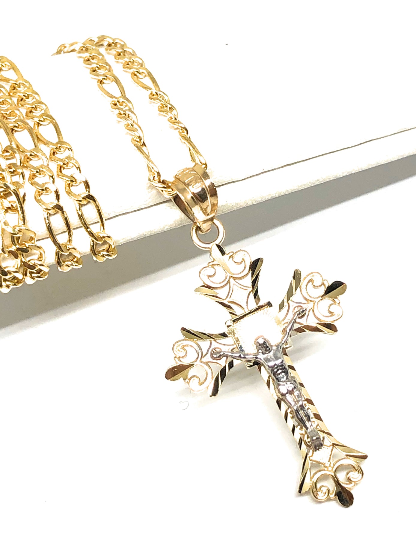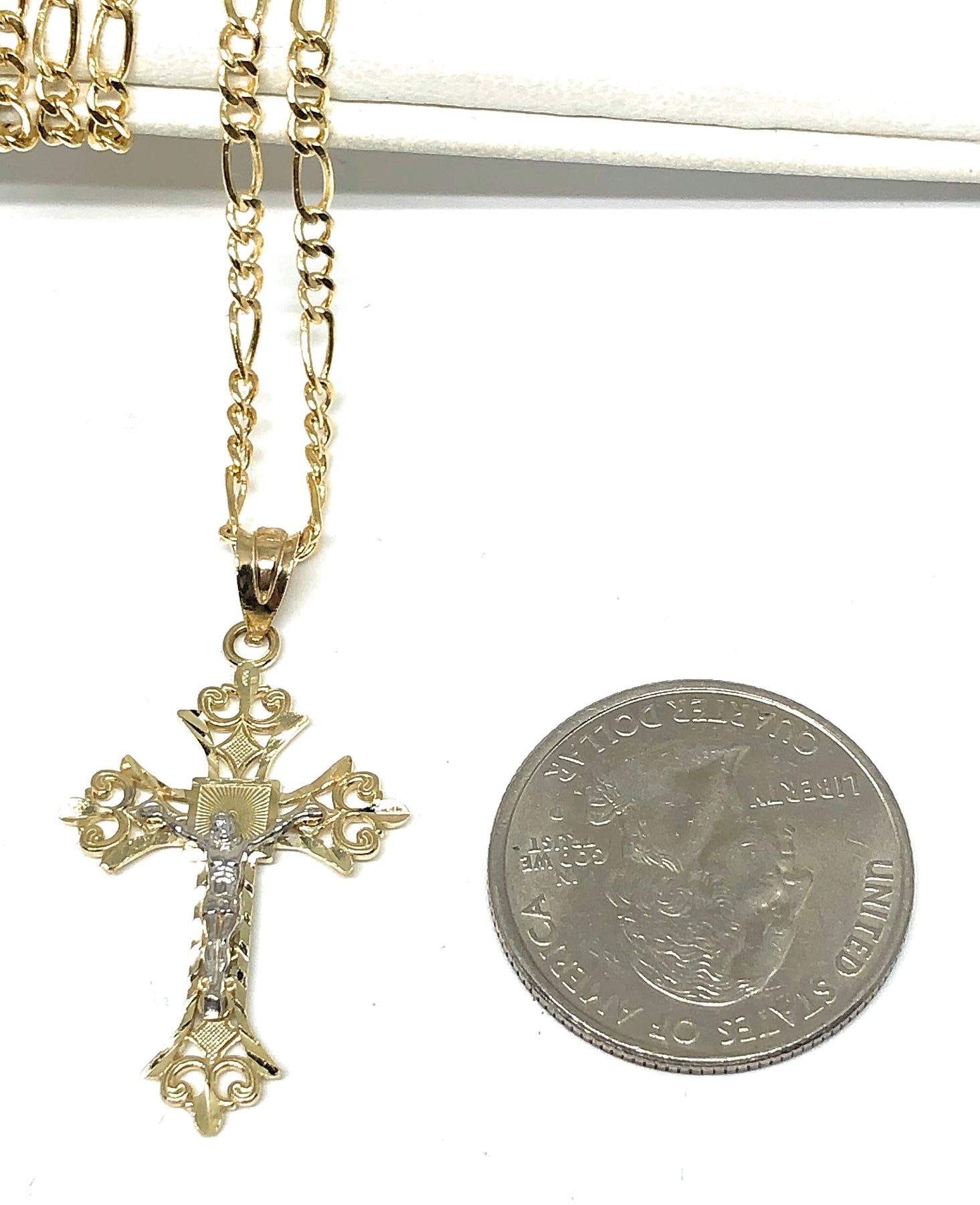 14k Solid Gold 2-Tone Classic Jesus Cross Pendant Necklace Crucifix With Figaro Chain (MED, LG)