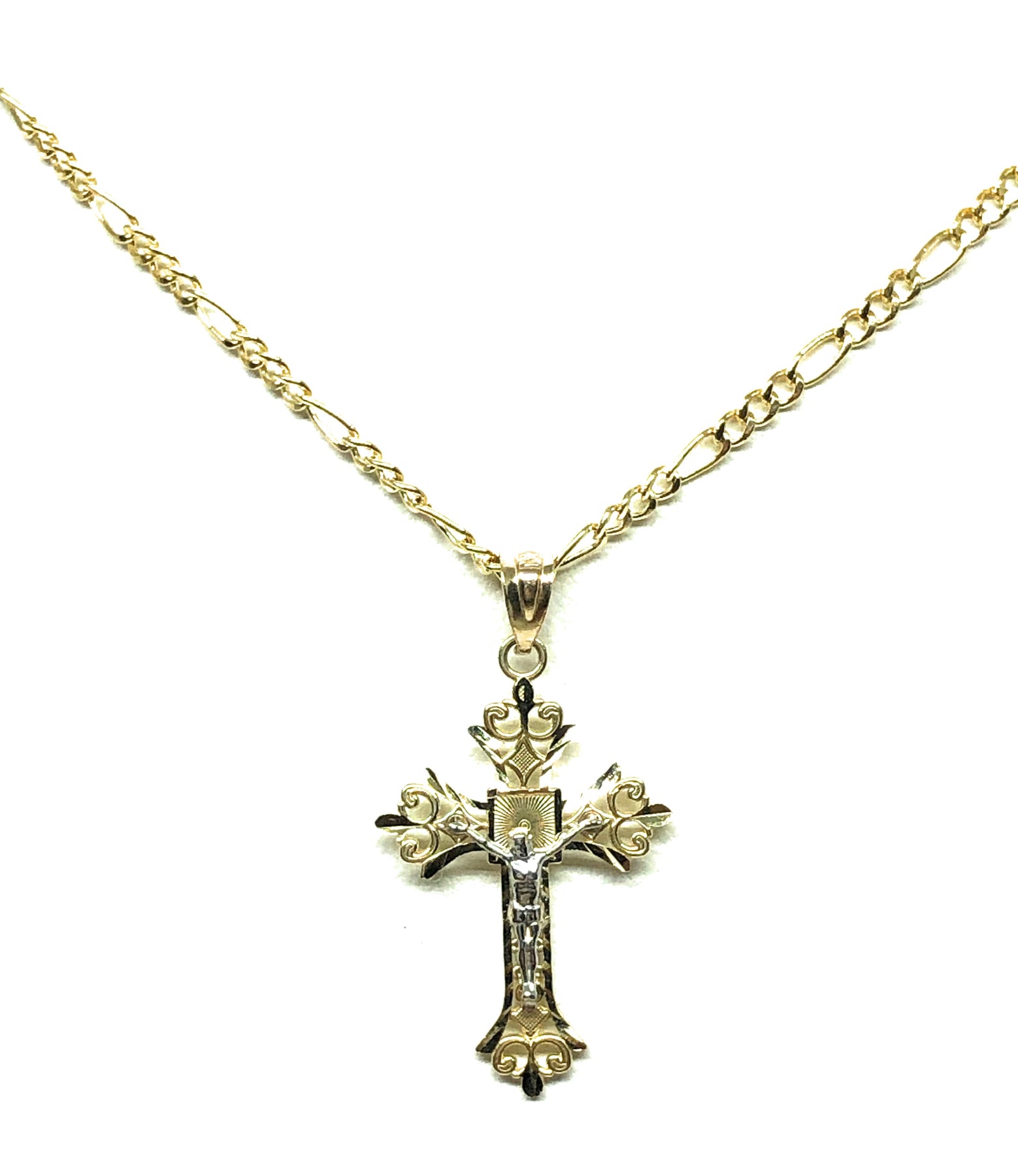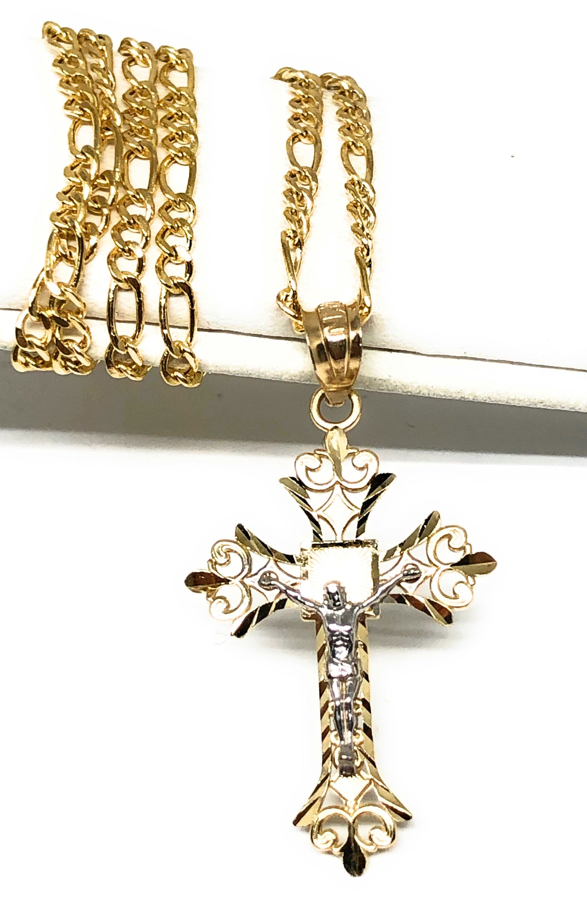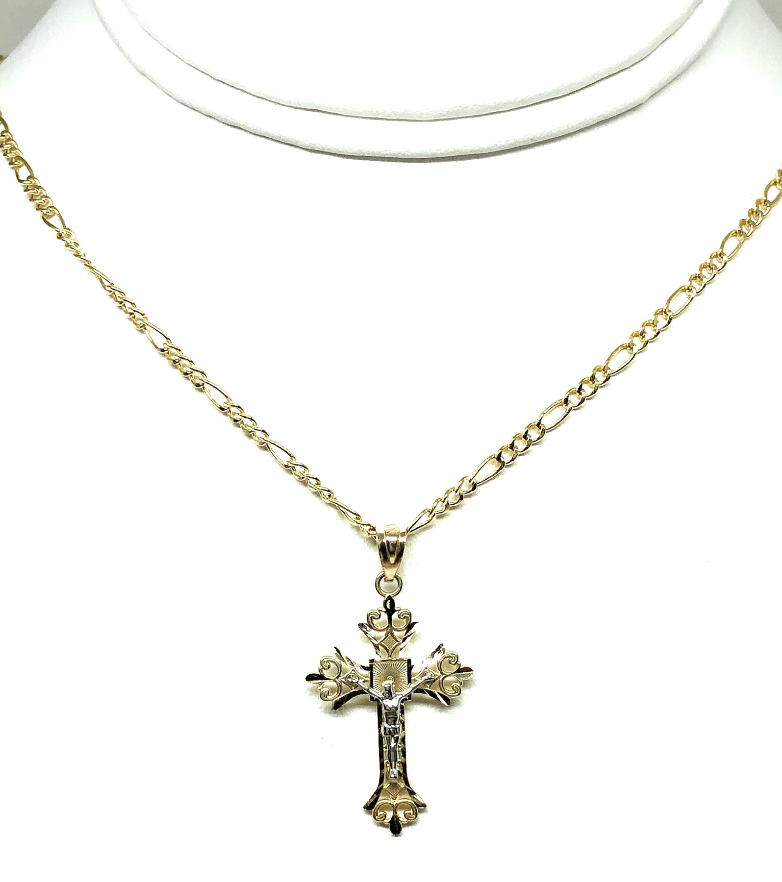 14k Solid Gold 2-Tone Classic Jesus Cross Pendant Necklace Crucifix With Figaro Chain (MED, LG)