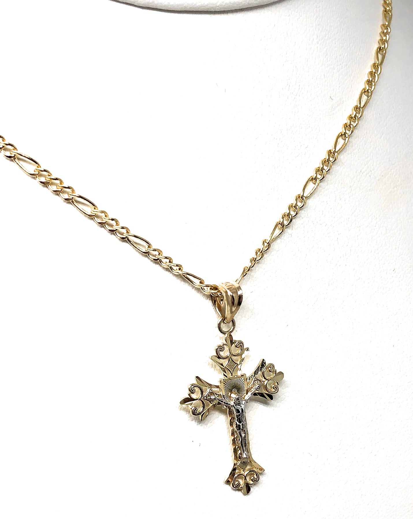 Emily Castro 14k Solid Gold 2-Tone Classic Jesus Cross Pendant Necklace Crucifix With Figaro Chain (MED, LG)