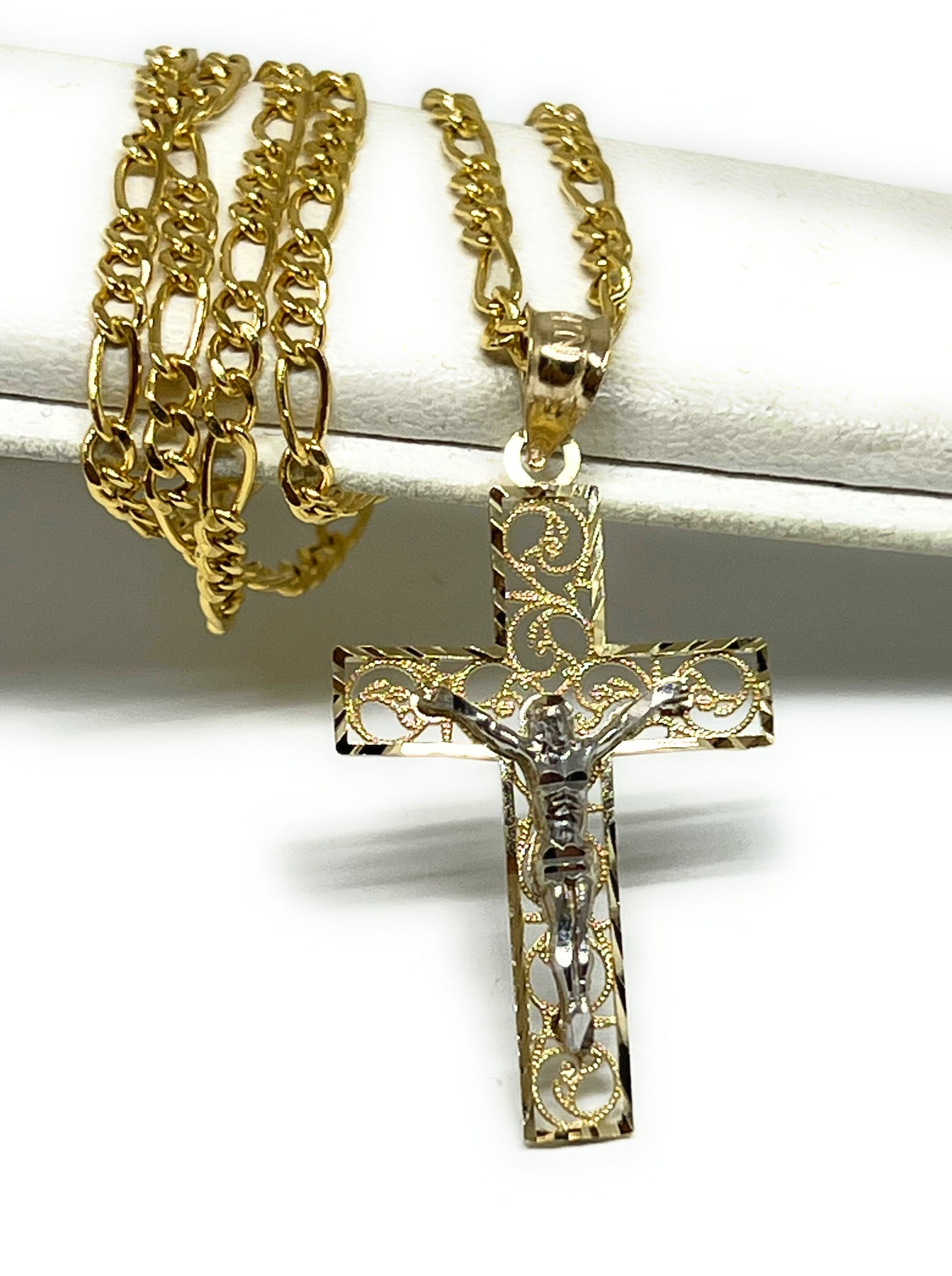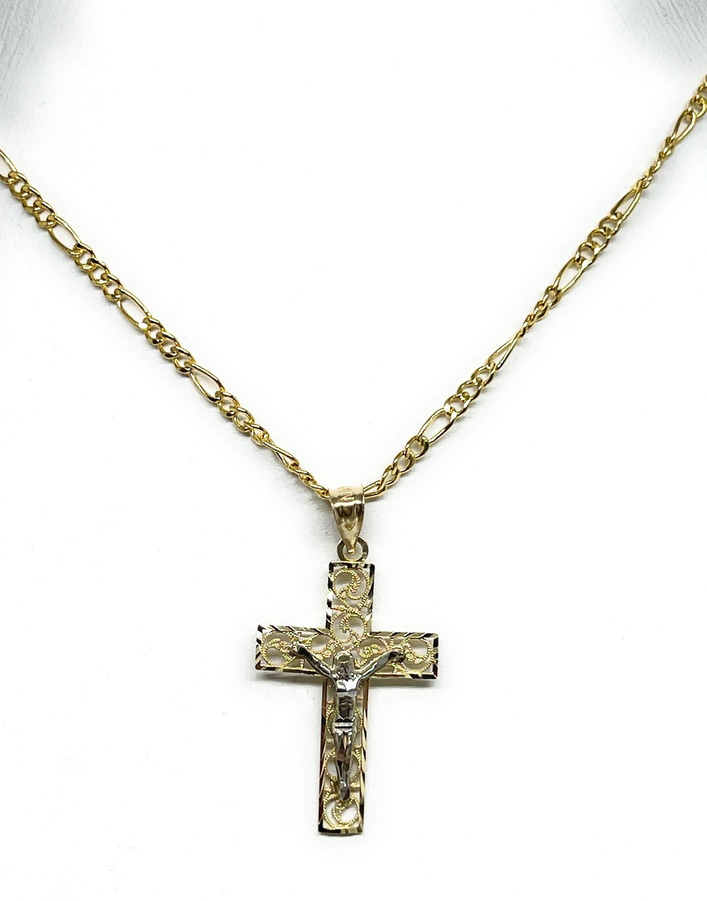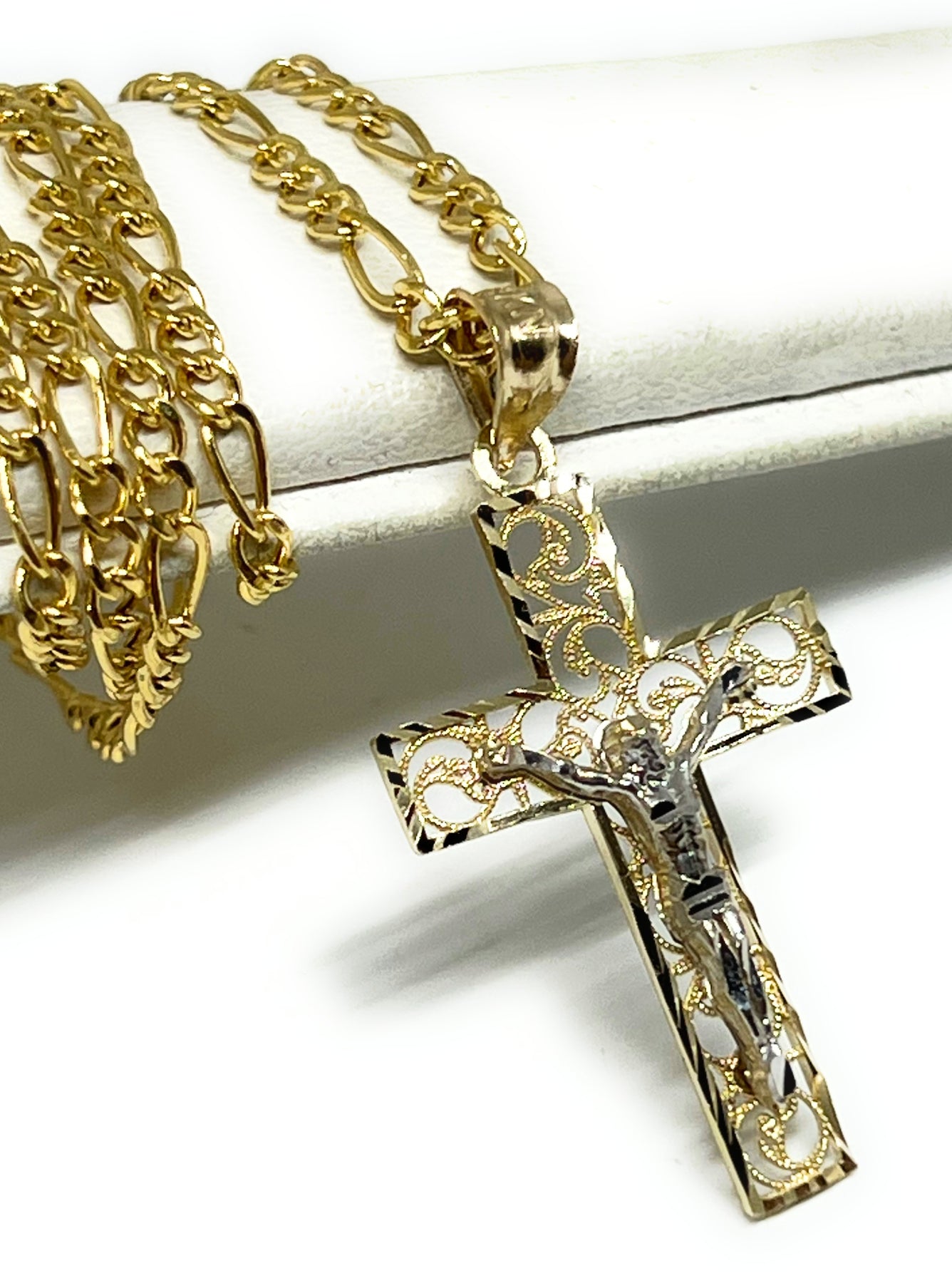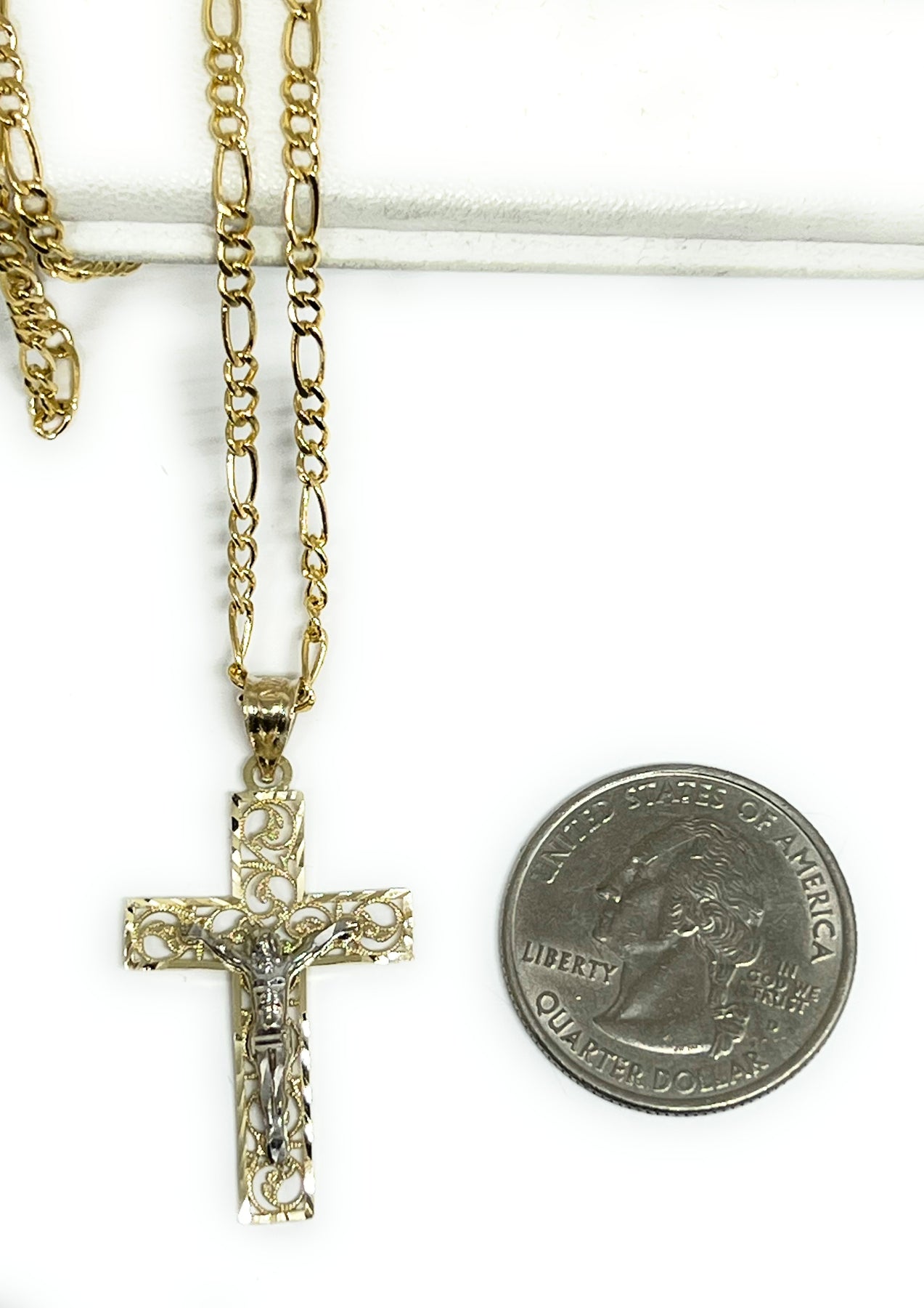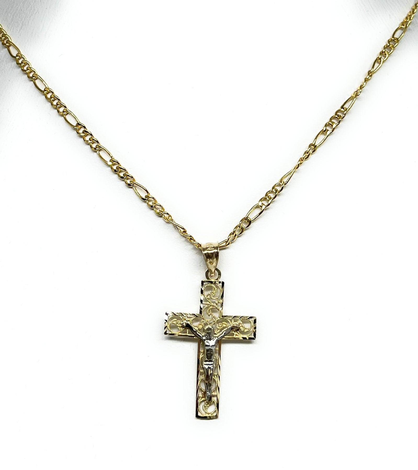 14k Solid Gold 2-Tone Filigran Jesus Cross Crucifix Pendant Necklace