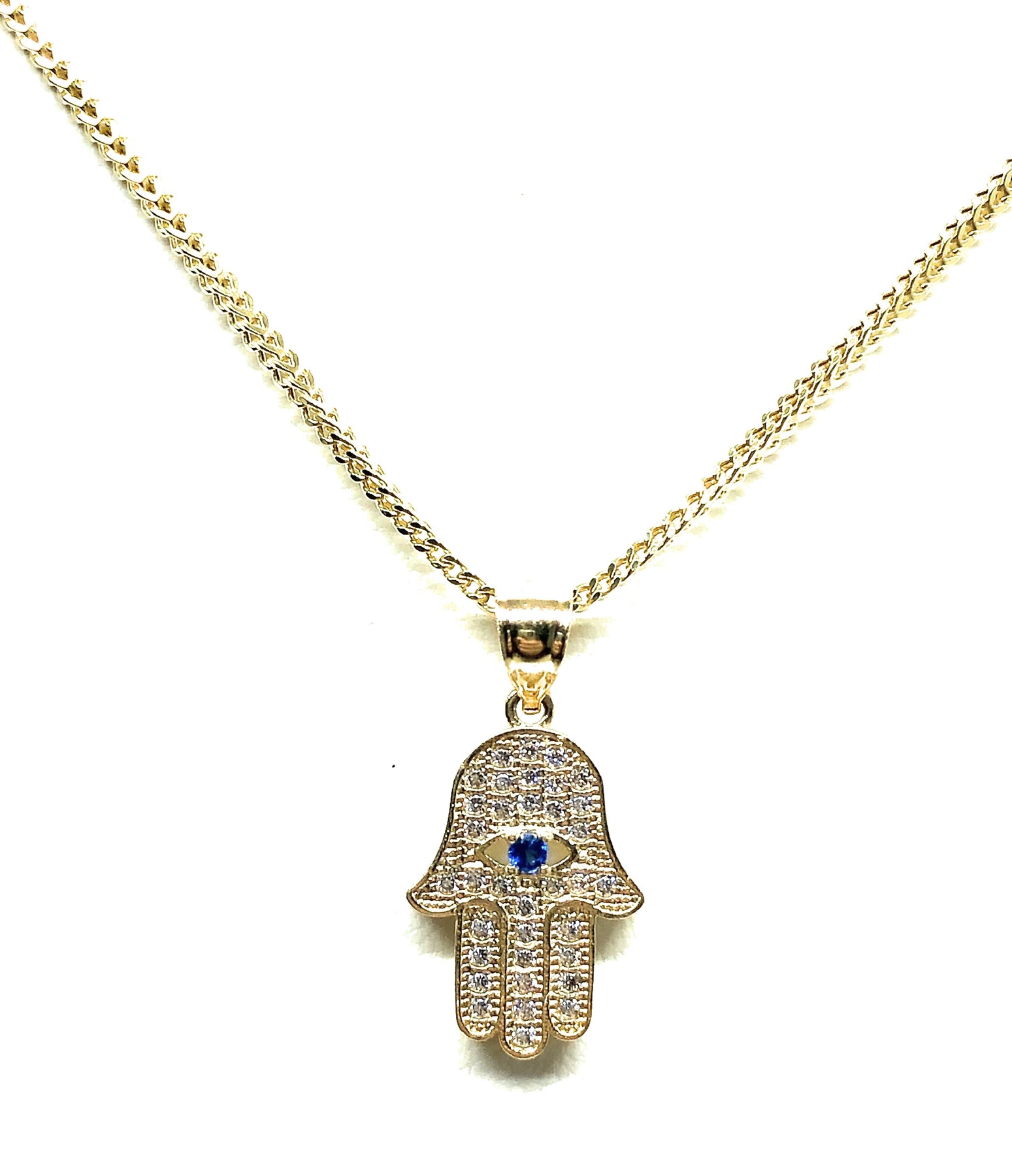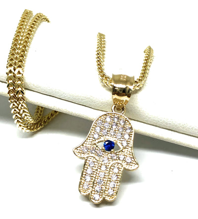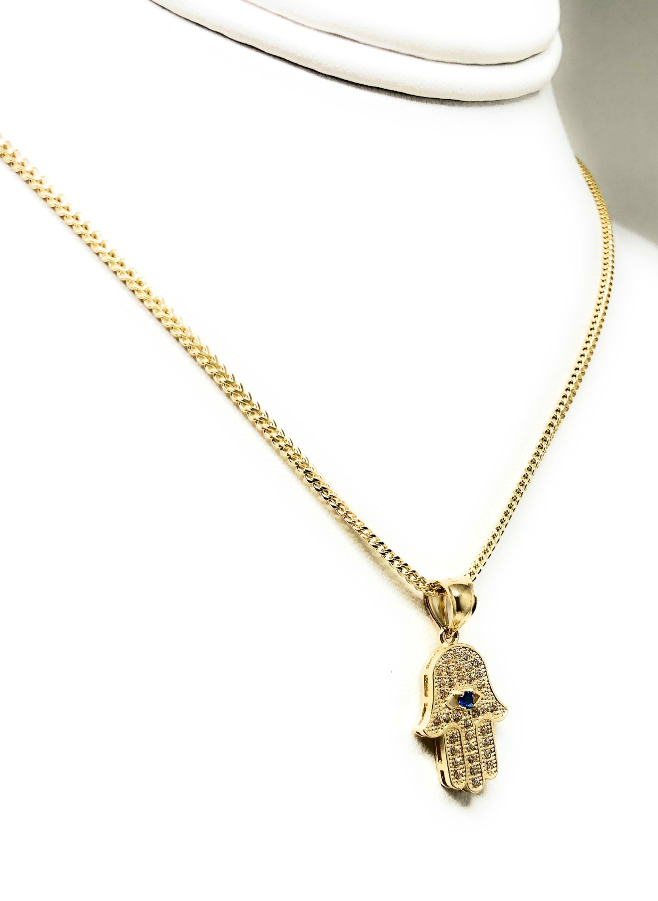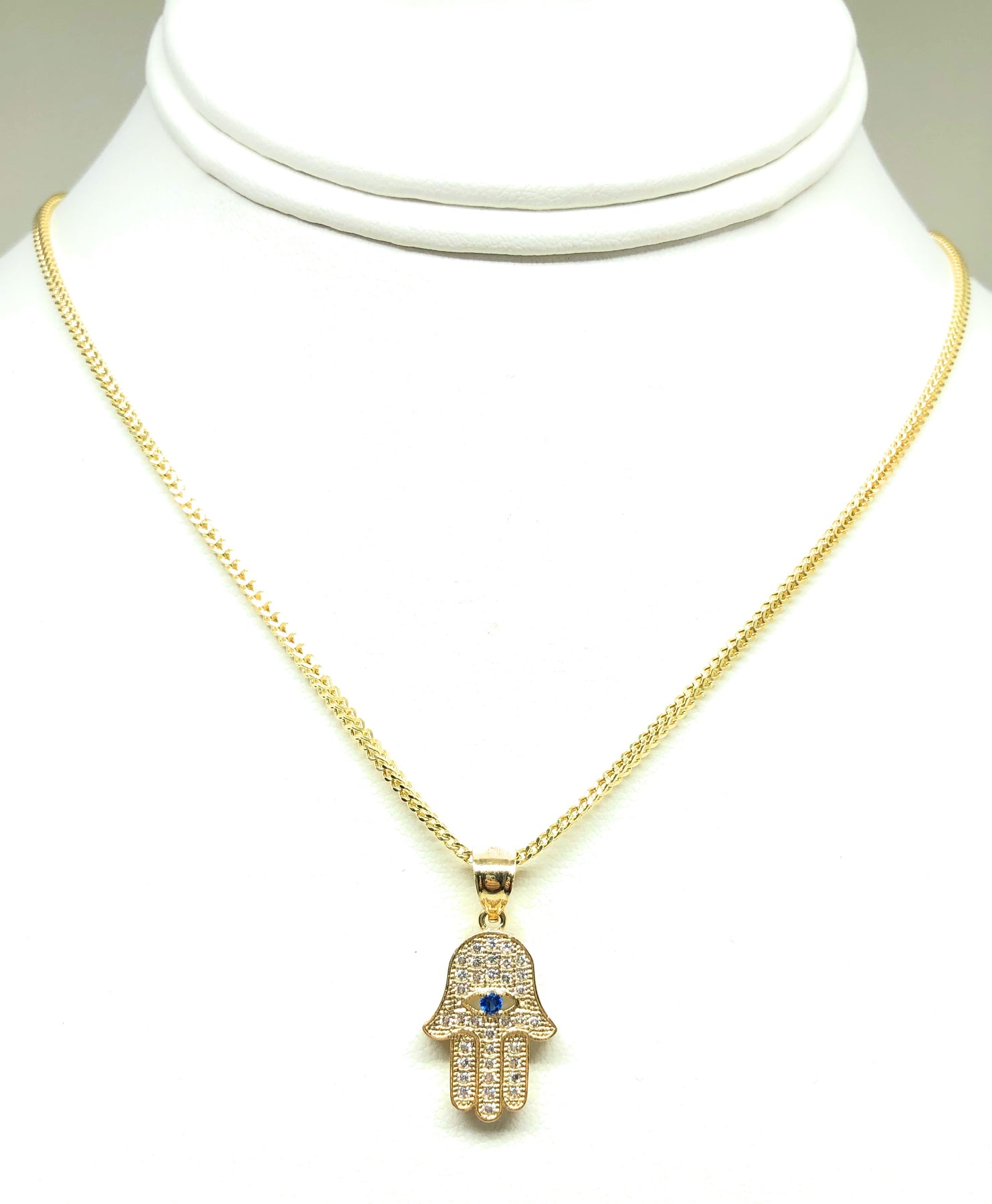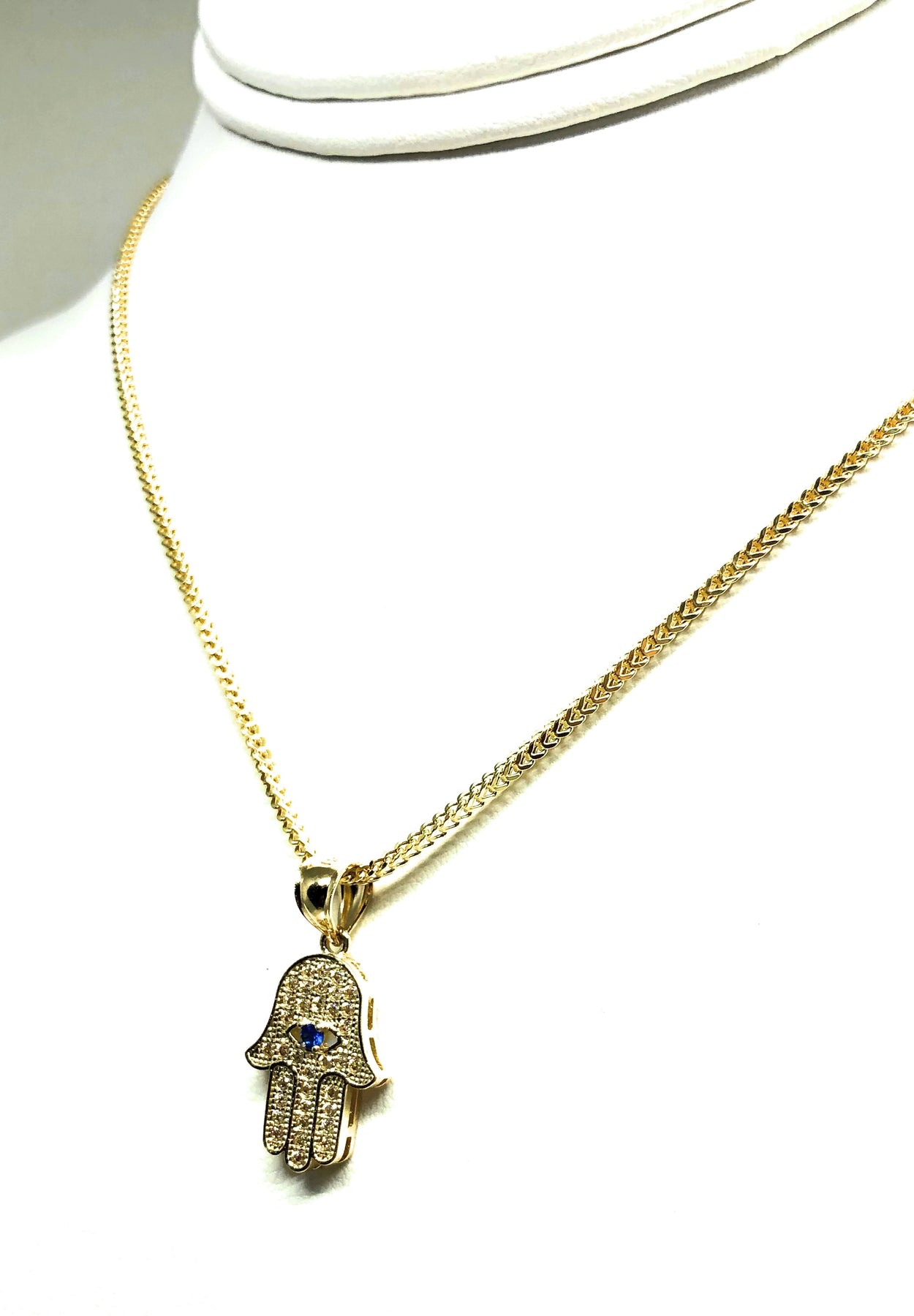 14k Solid Gold Hamsa Hand Pendant CZ Necklace Franco Chain