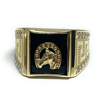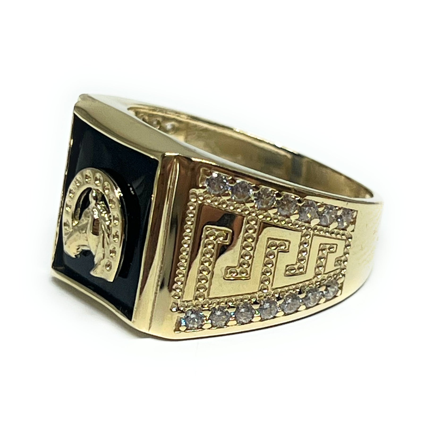 14k Solid Gold HOSE WITH HORSESHOE ONYX CZ GREEK BORDER Ring (9.5g)