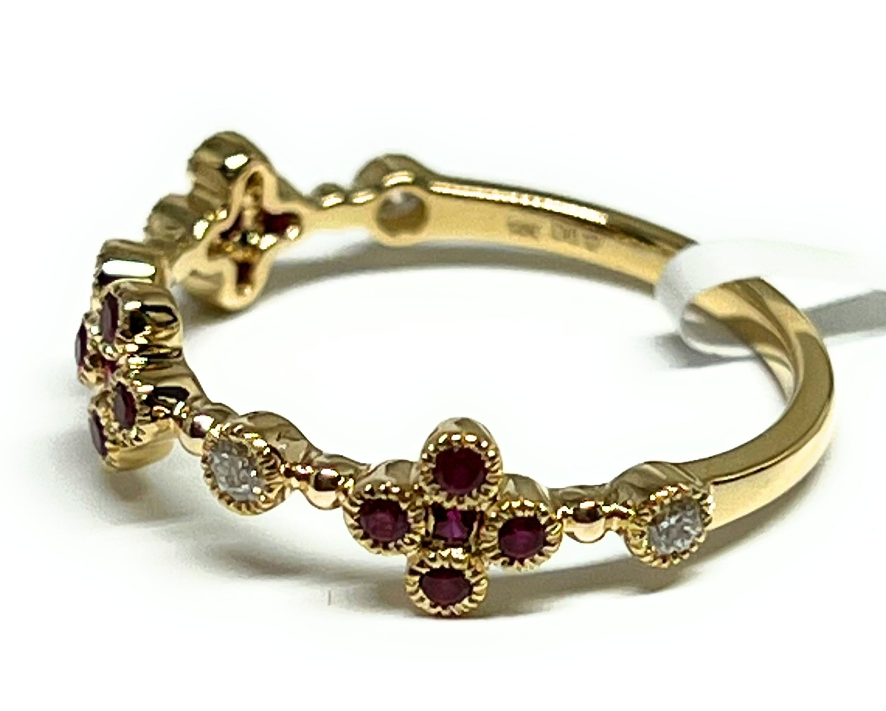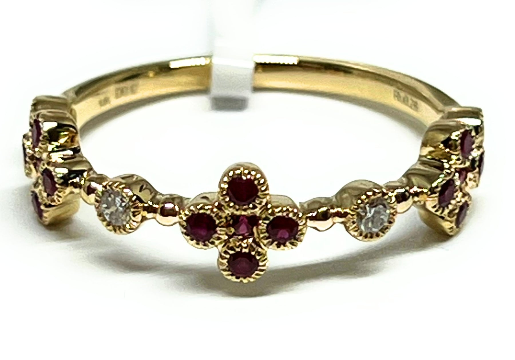 Introducing our new collection of REAL & NATURAL precious gemstones jewelry! This elegant 14k solid gold band ring features 15 natural heat treated round rubies and 4 round brilliant cut diamonds, perfect for any special occasion. Made using 14k solid gold and with a total carat weight of 0.37 ct, this ring is beautiful and crafted with the best materials for best quality, affordability, and shine!