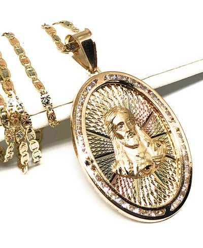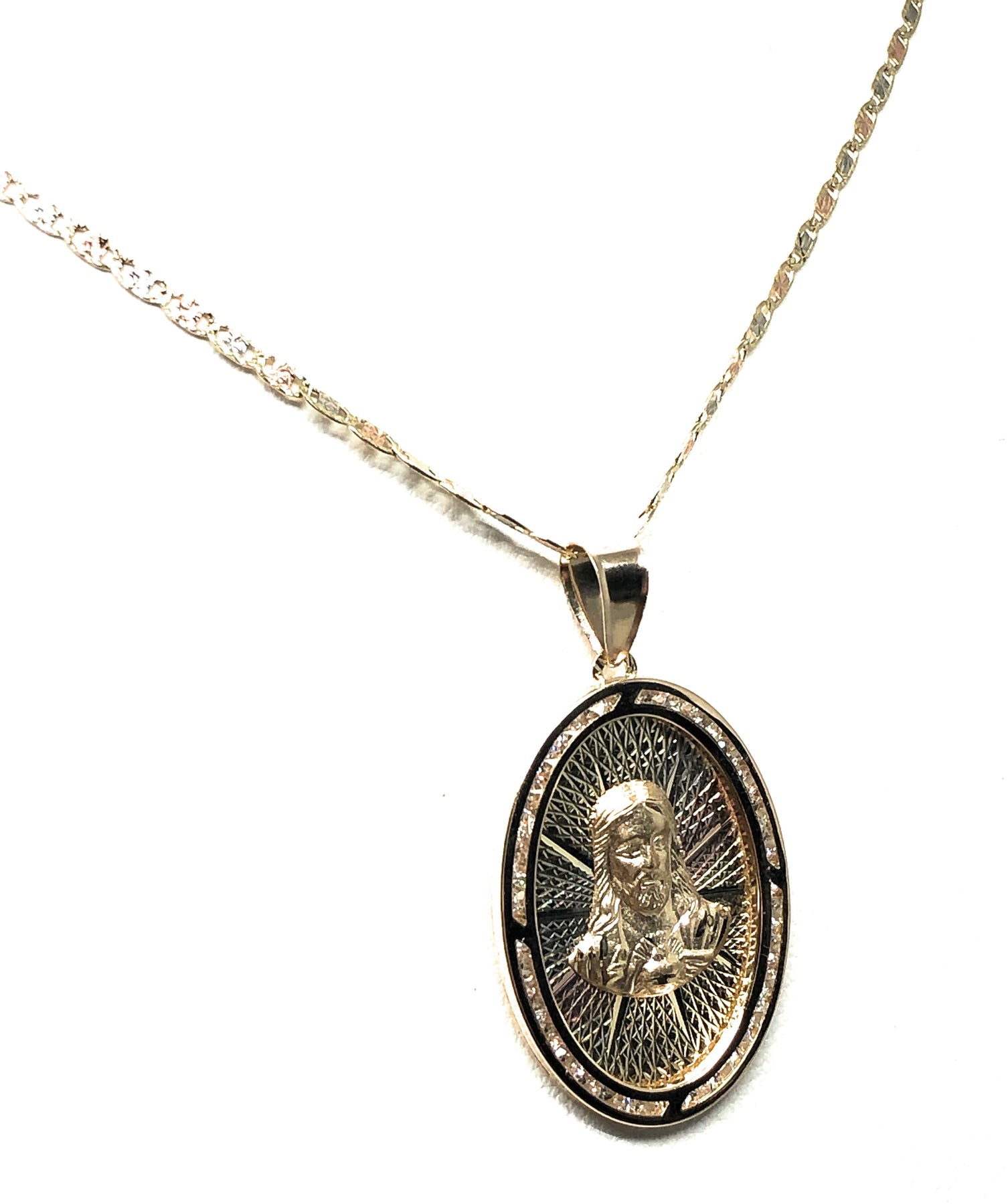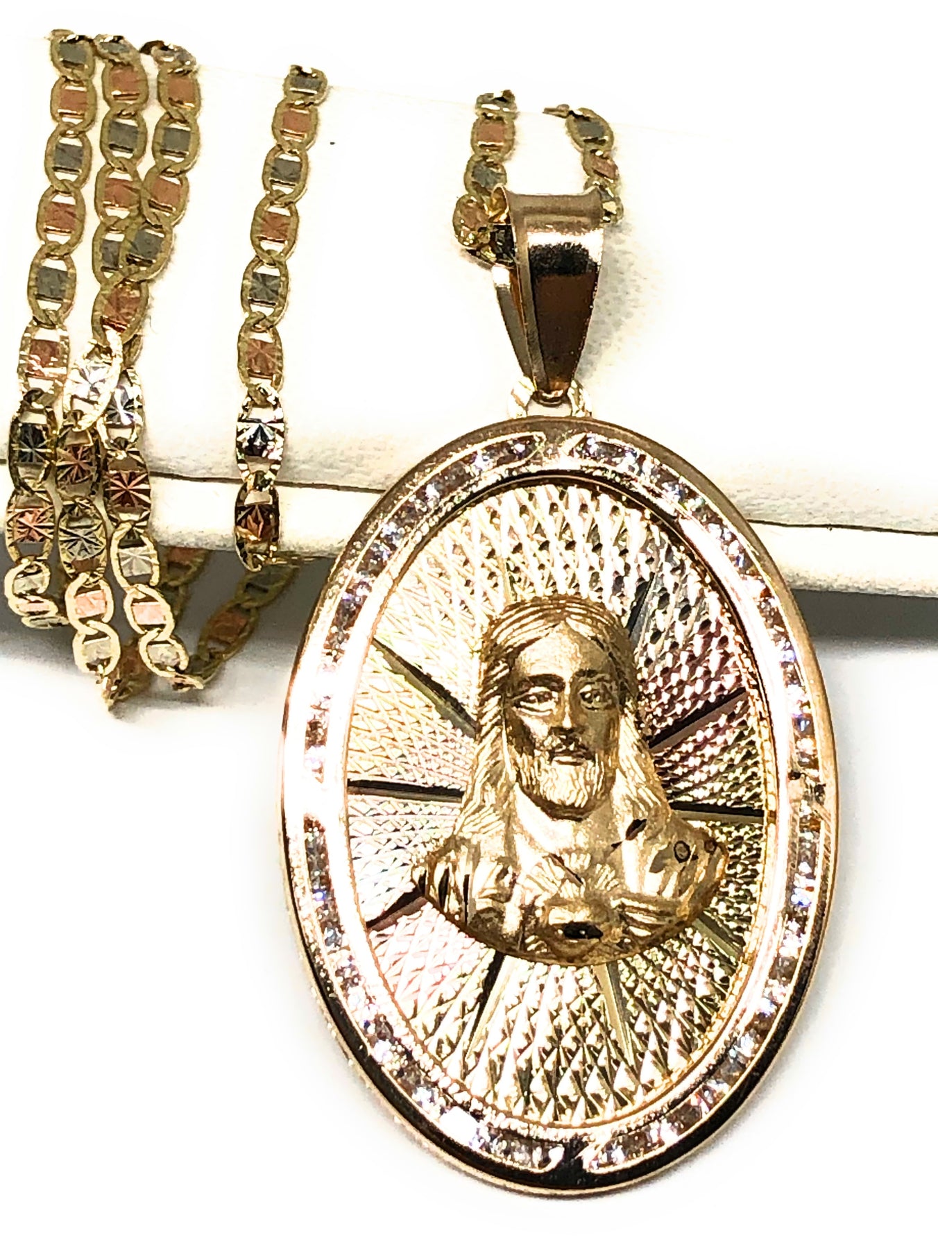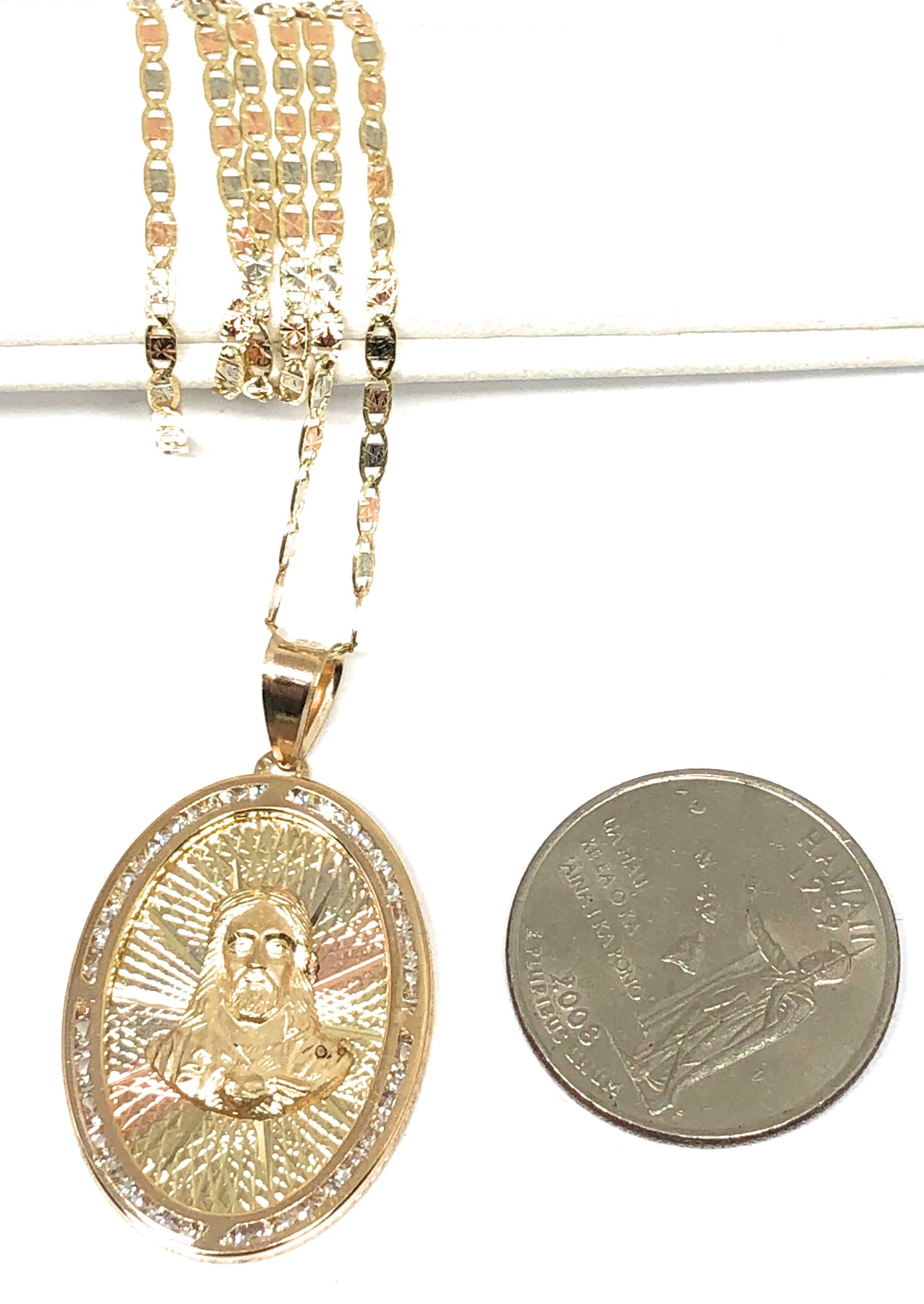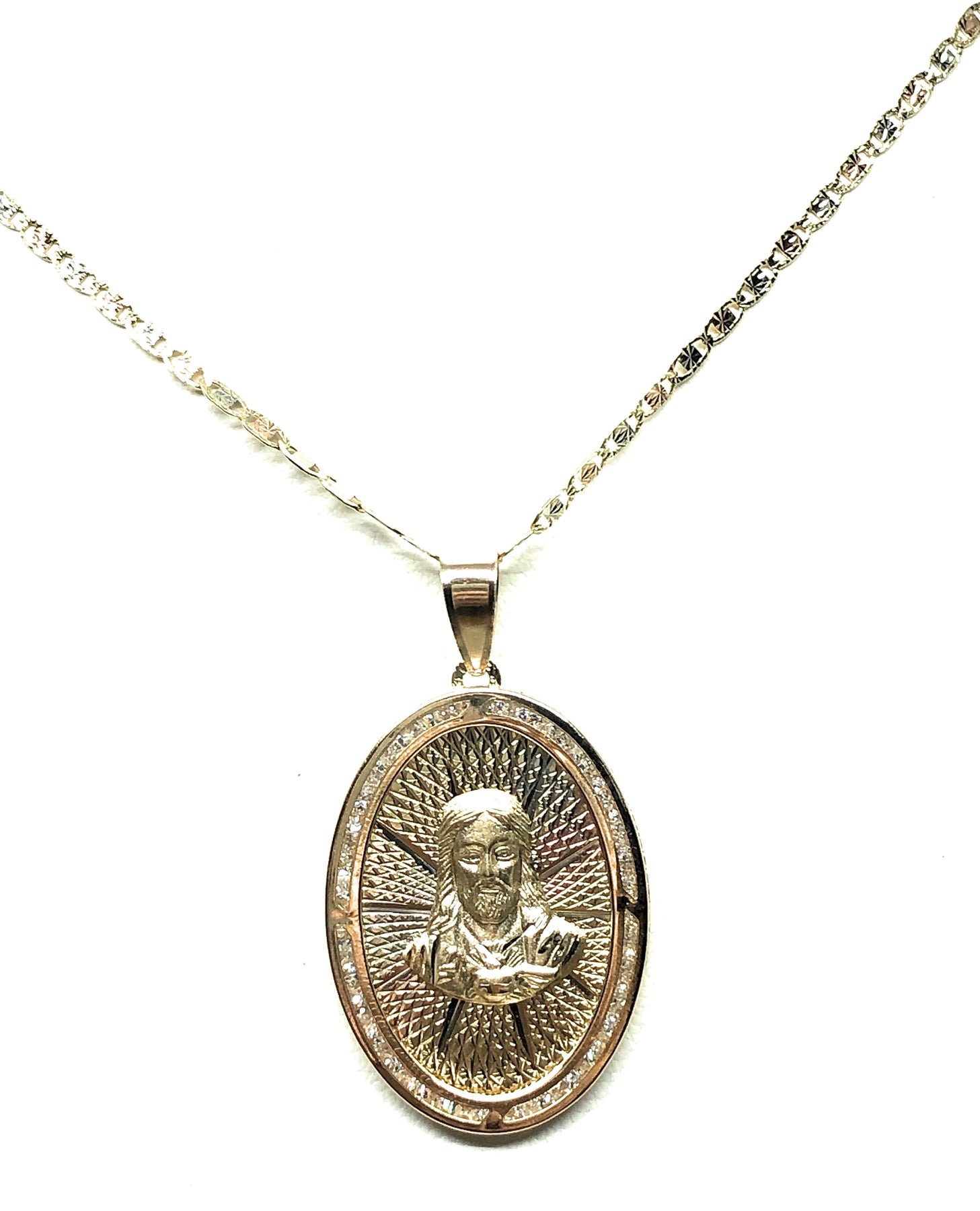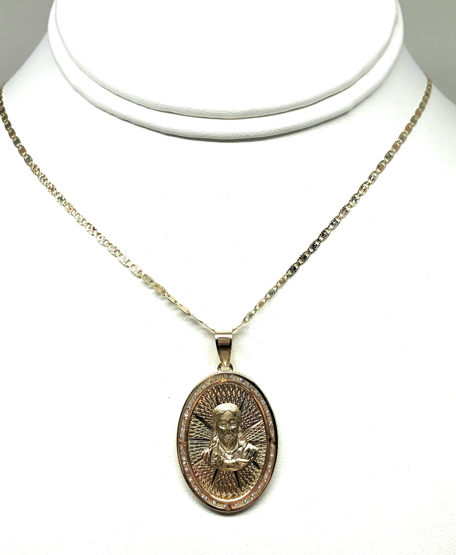 14k Solid Gold Tri-Color Jesus Sagrado Corazon Oval Pendant Necklace Valentina Chain