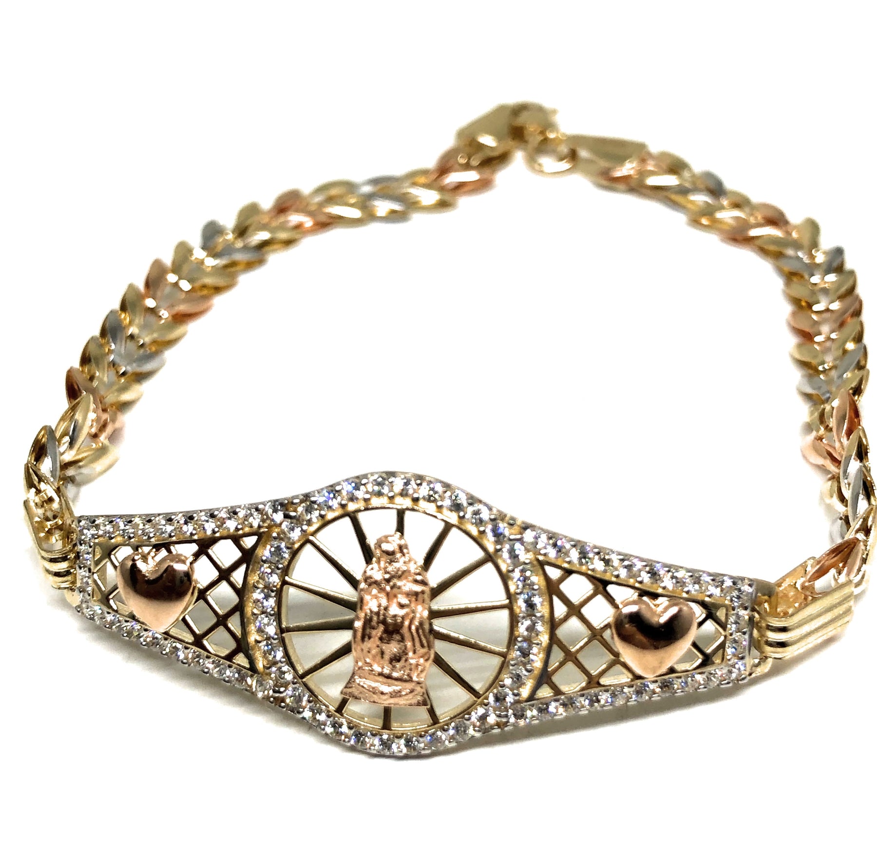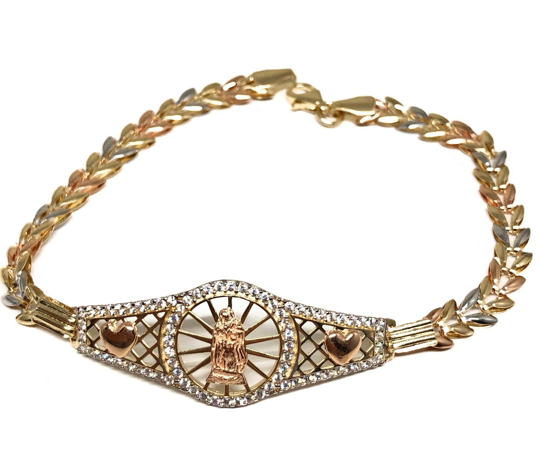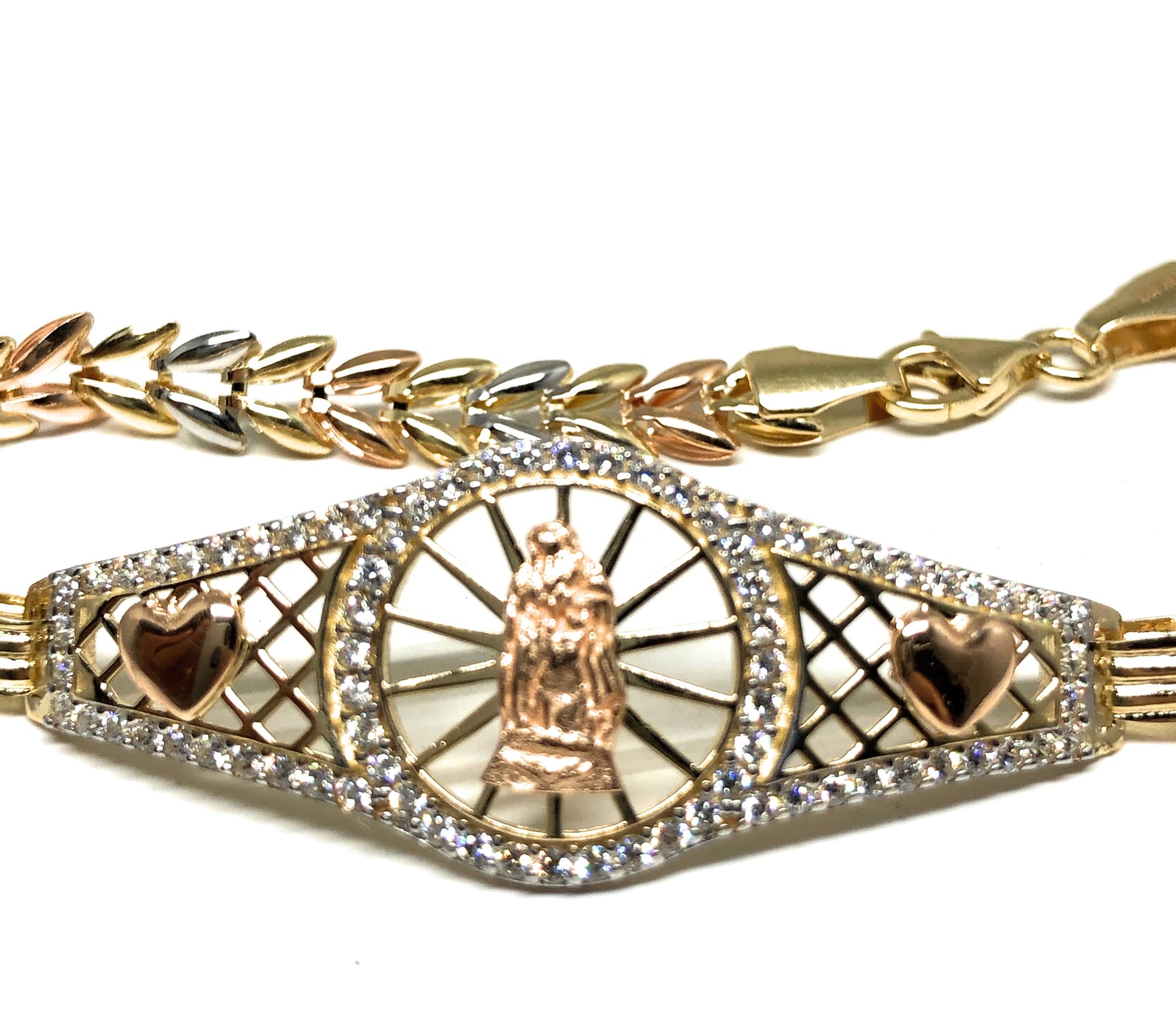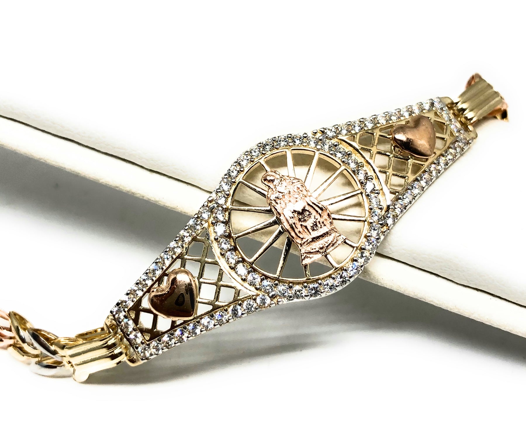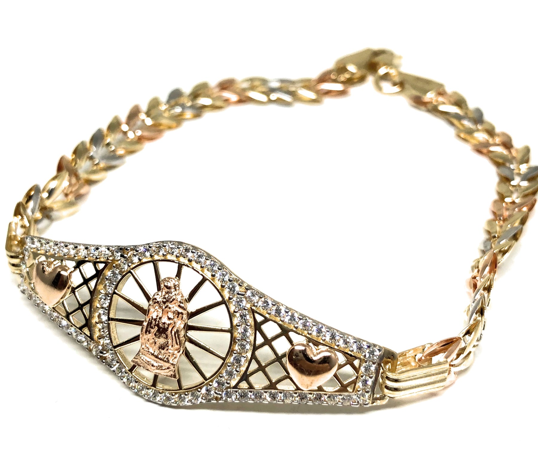 14k Solid Gold Tri-Color Virrgin Mary Brracelet Cubic Zirconia 7.2 inch Virrgen Guadalupe