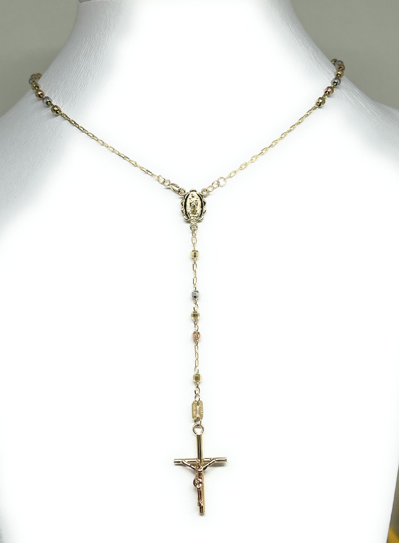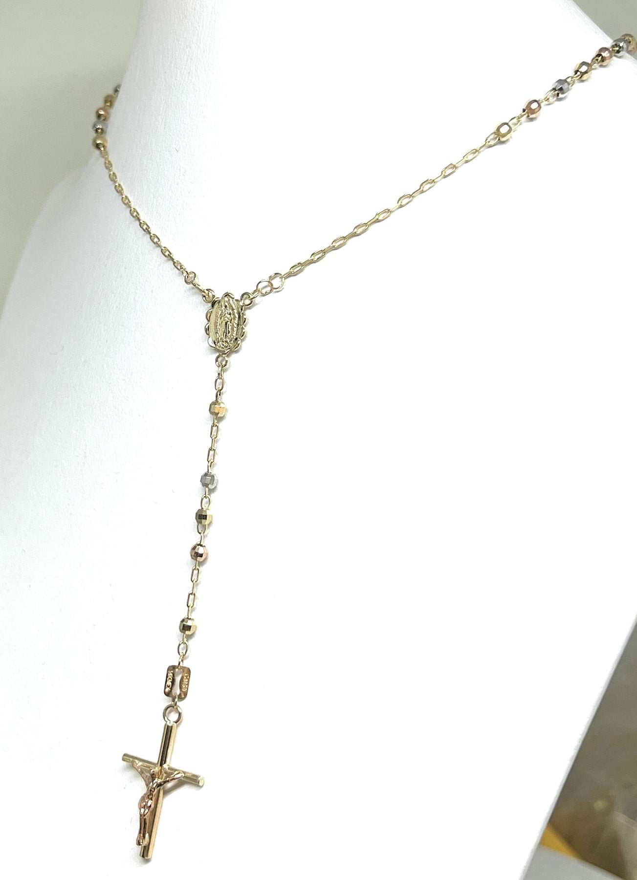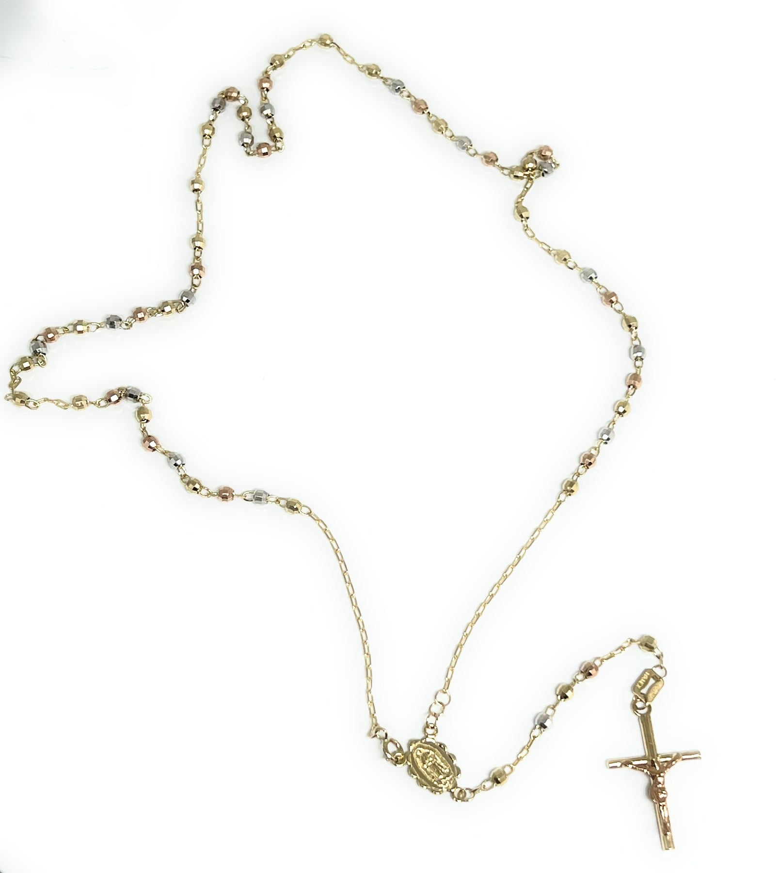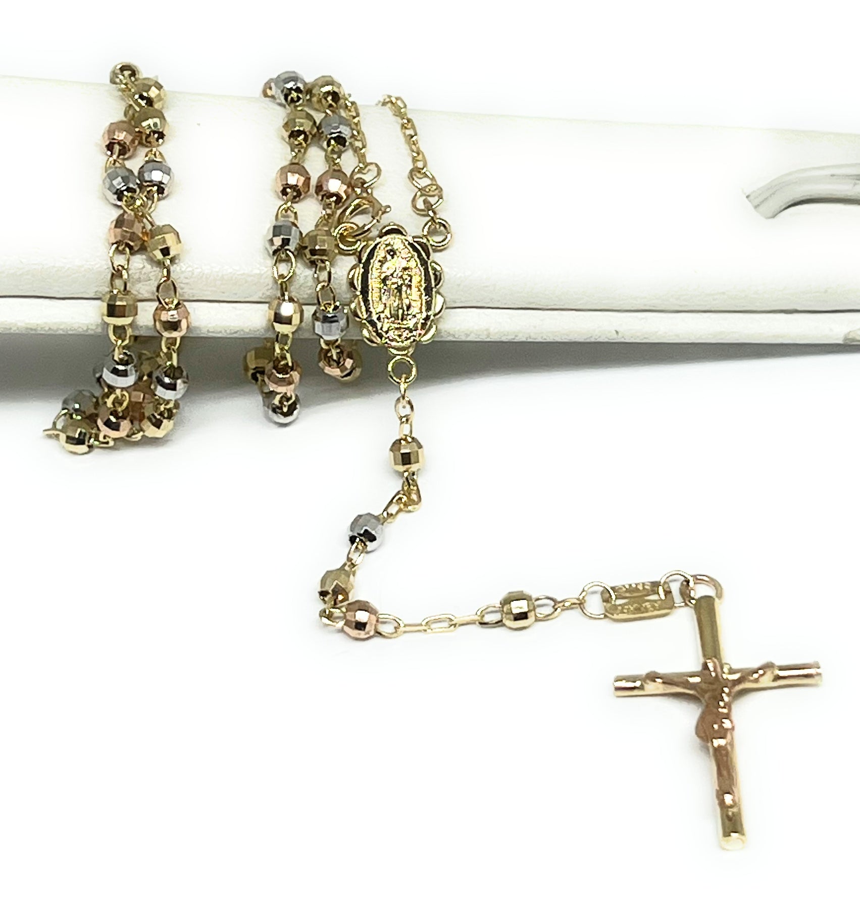 • Tri-Color Gold Virgin Mary CZ Crucfix rosary; 14k solid gold guaranteed.