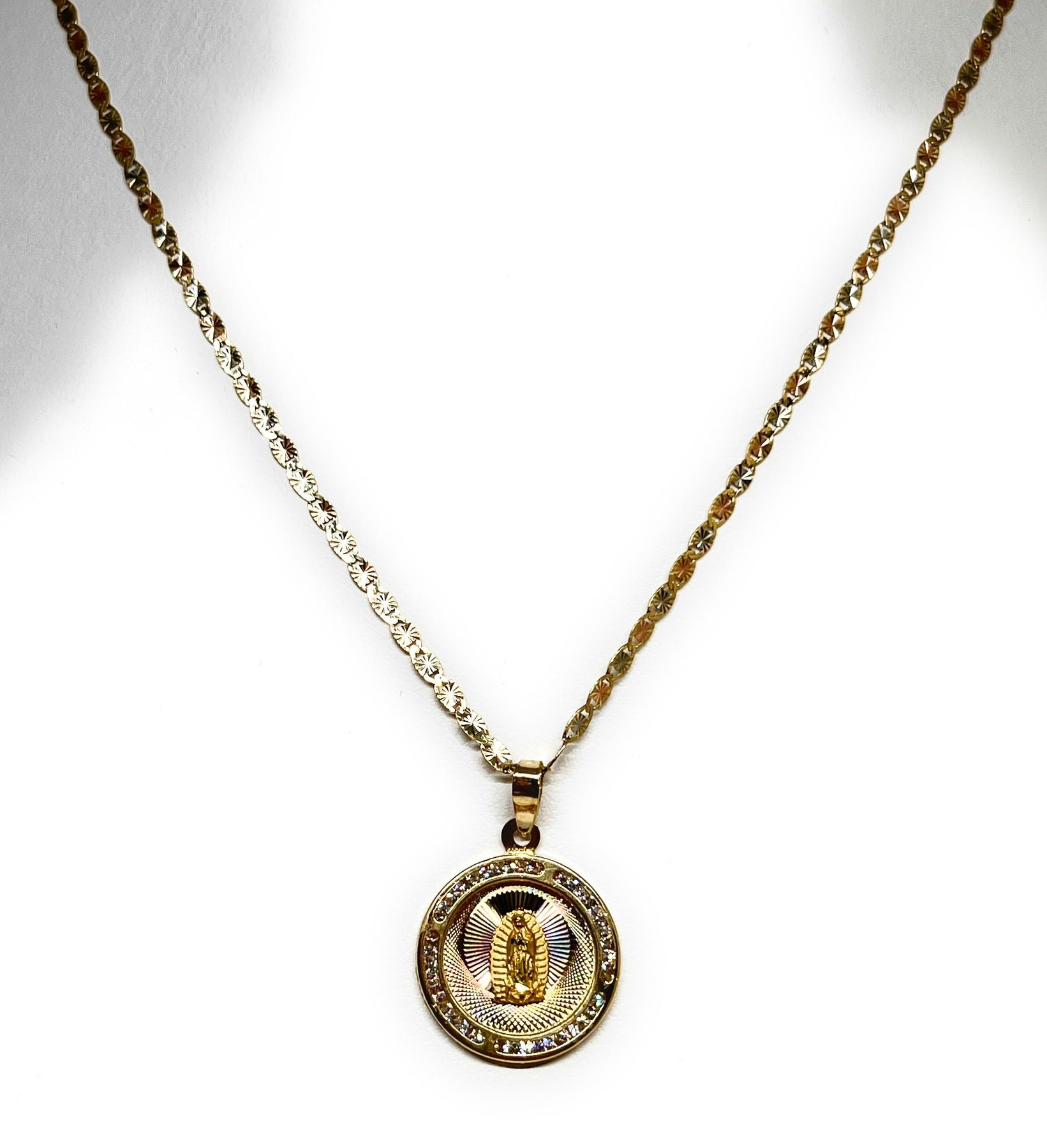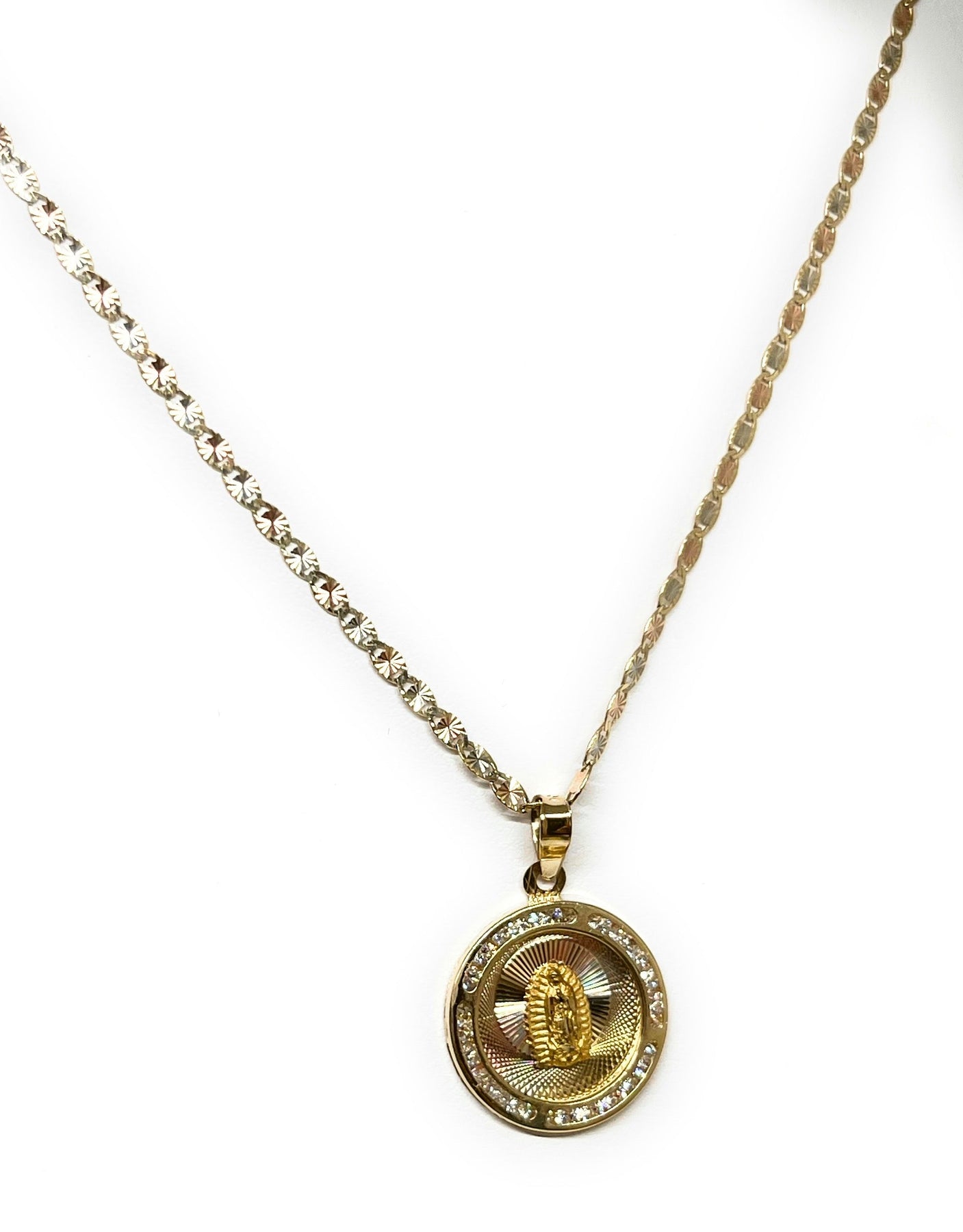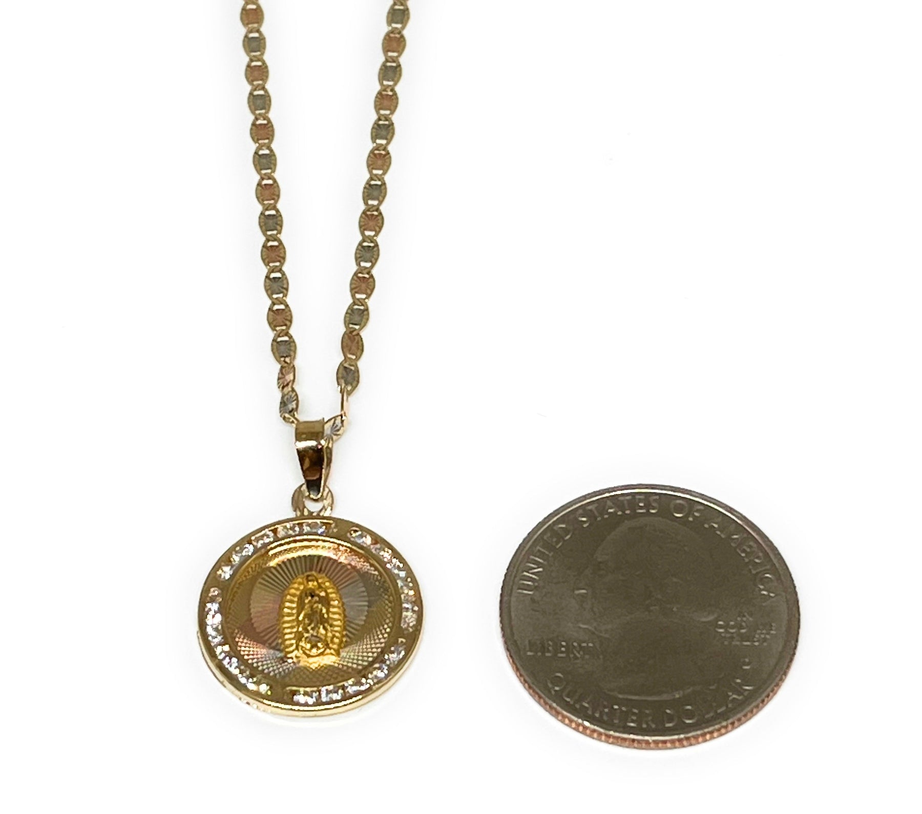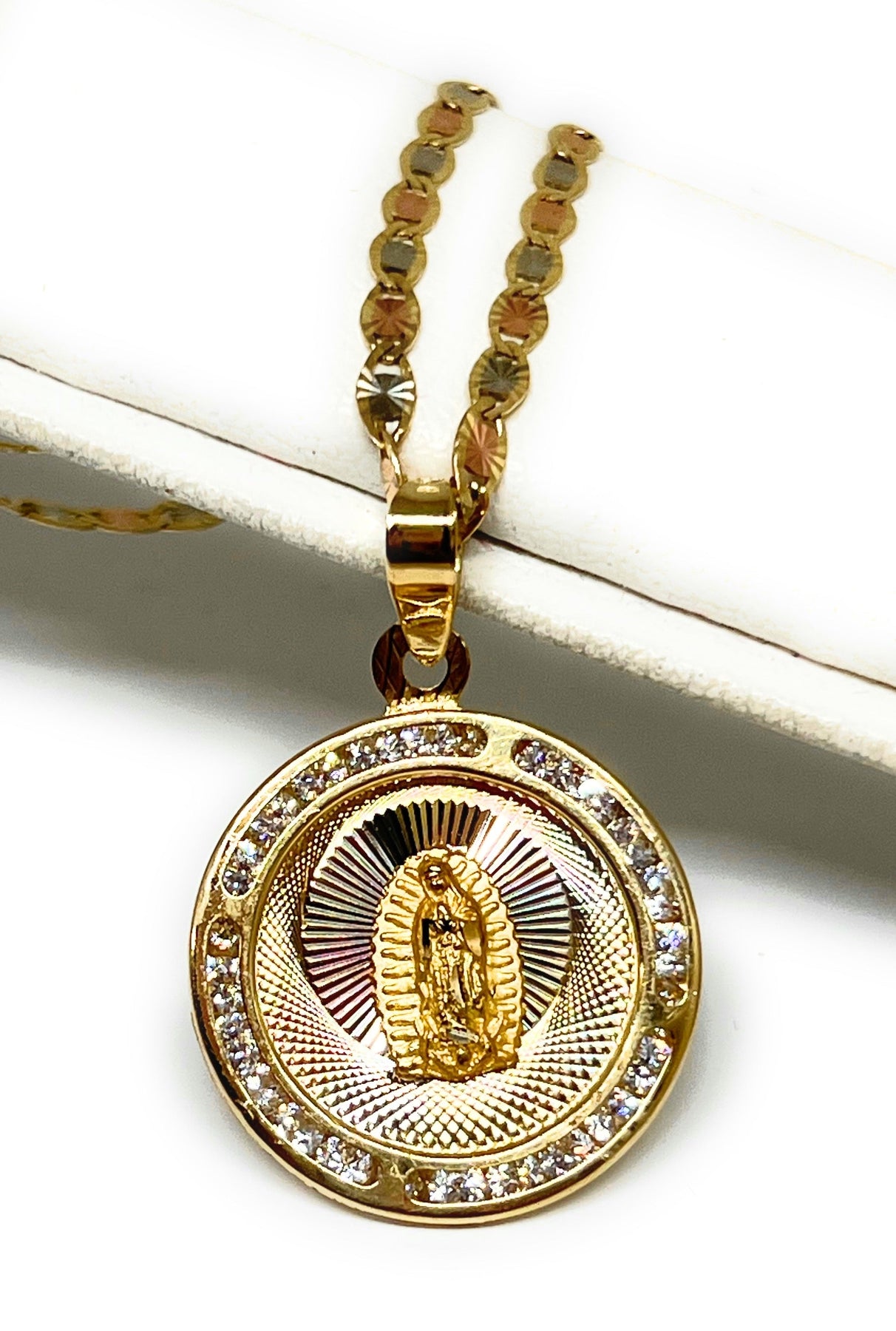 14k Solid Gold Tri-Color Virrgin Mary Round Pendant Necklace W/ CZ Virrgen Gaudalupe (MED, SM, XS)