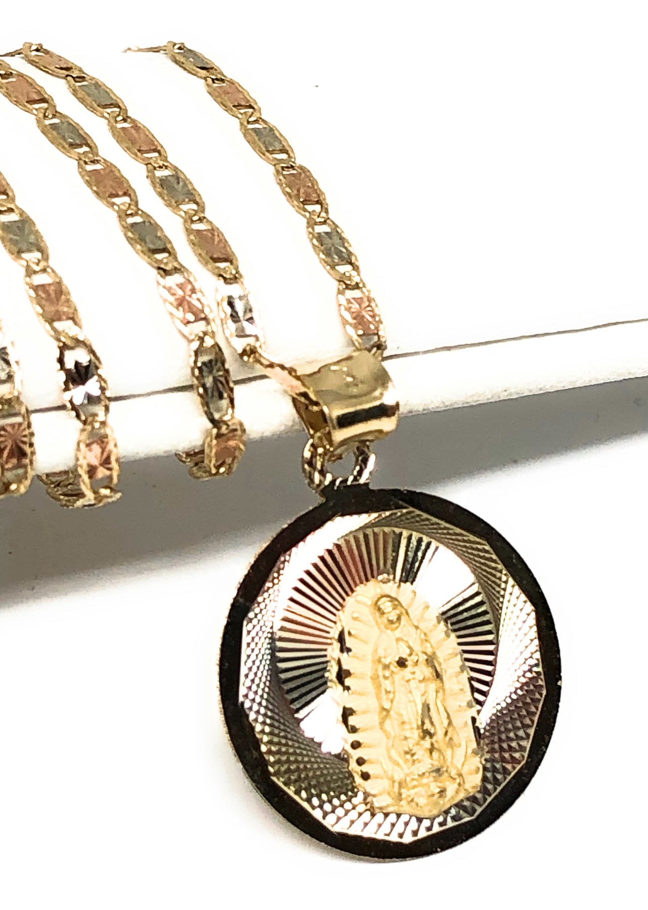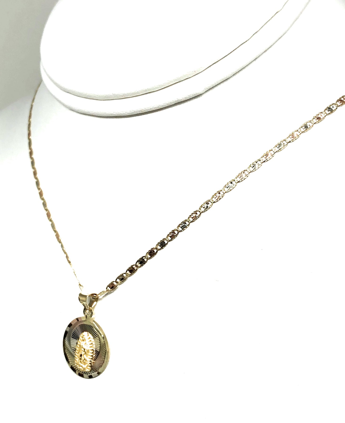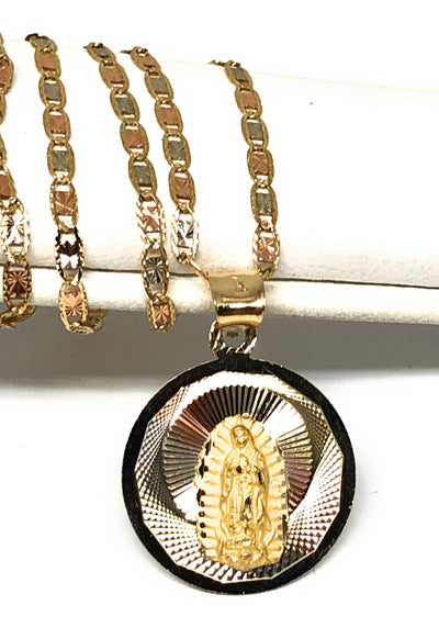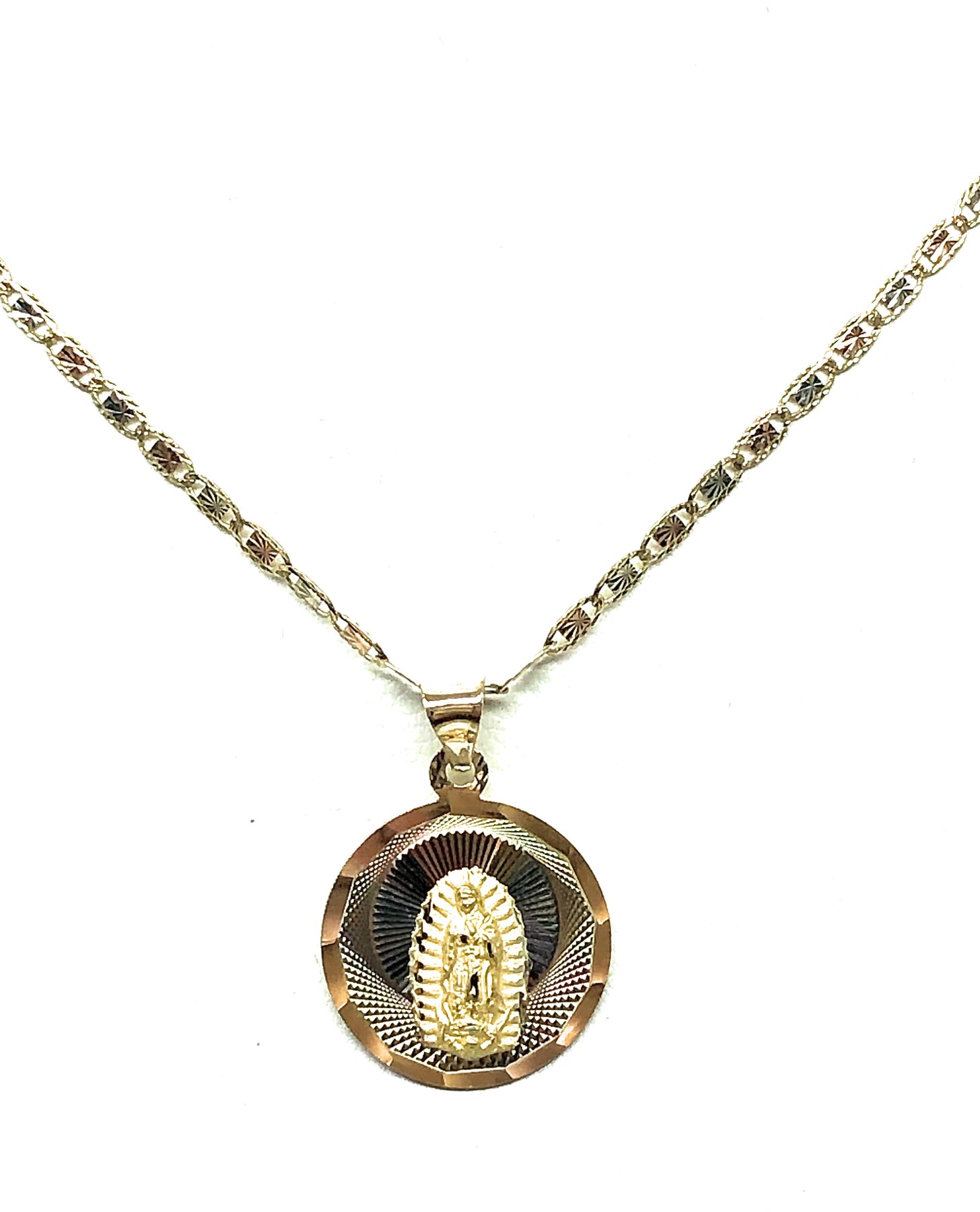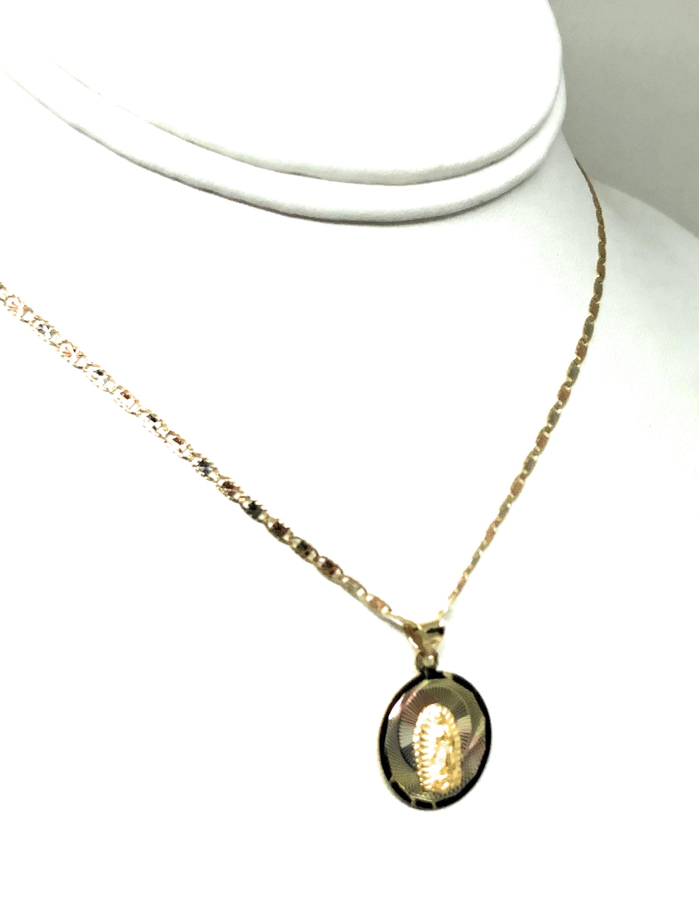 The classic Virgin Mary depiction is displayed with beautiful attention to detail and made of 14 karat solid gold guaranteed. The pendant and chain have beautifully designed vibrant colors and textures that makes the image come out. This is a high quality 14 karat solid gold product.