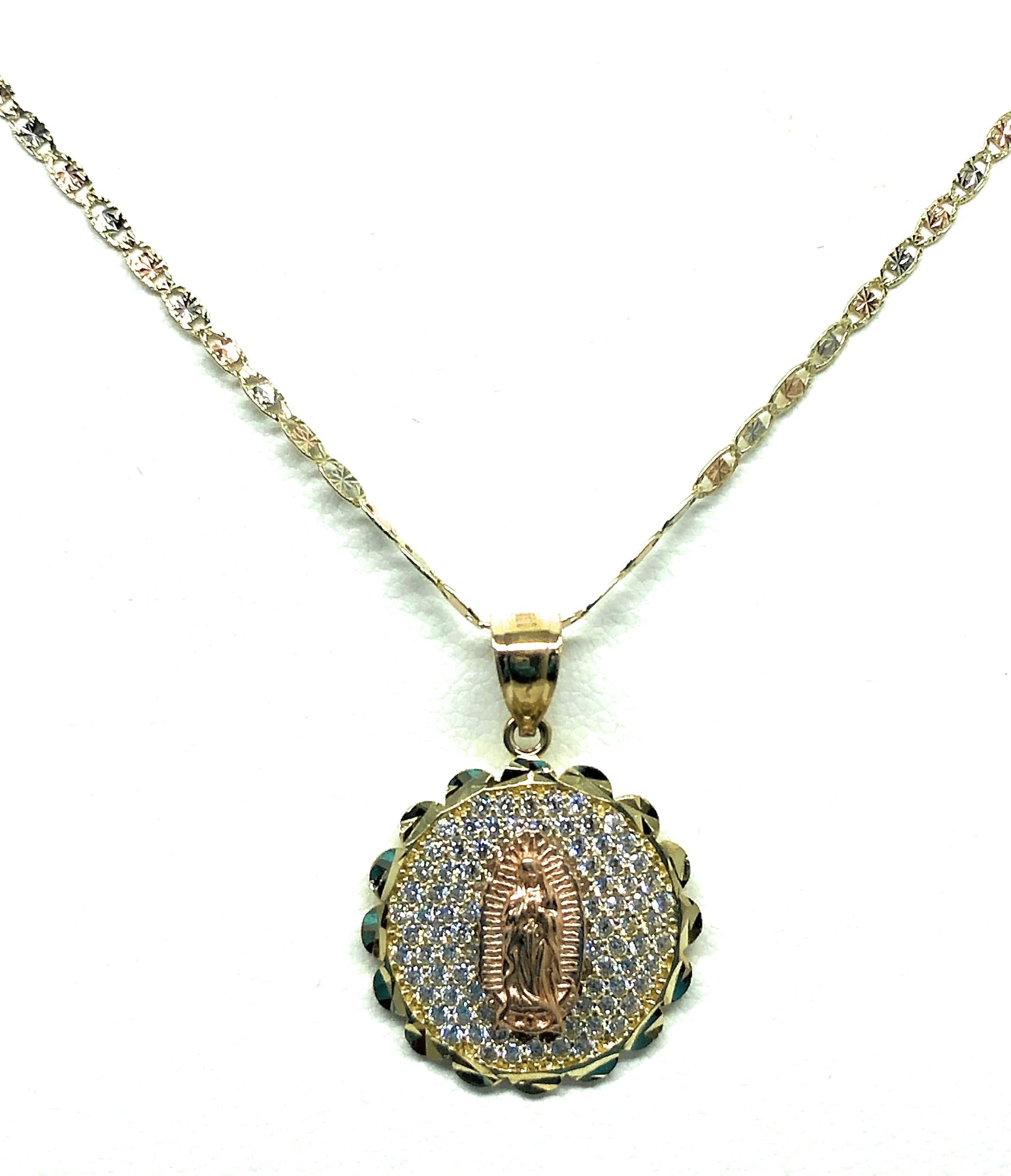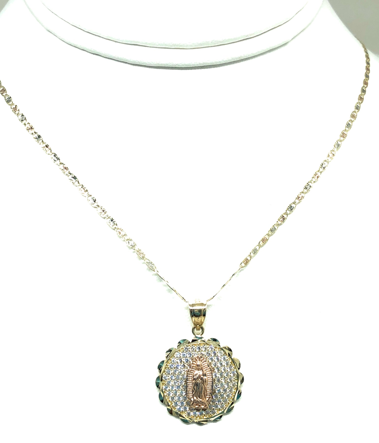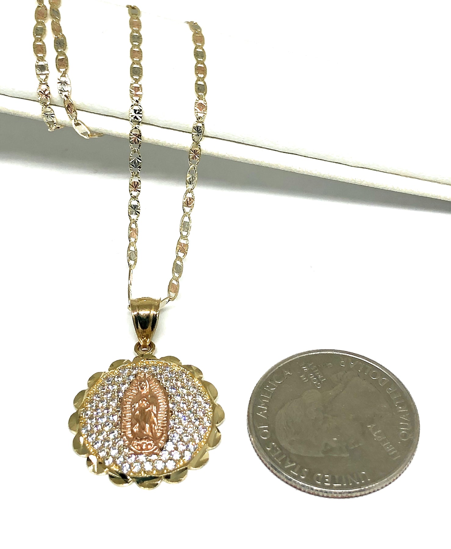 14k Solid Gold Virrgin Mary CZ Round Pendant Virrgen Guadalupe Valentina Chain