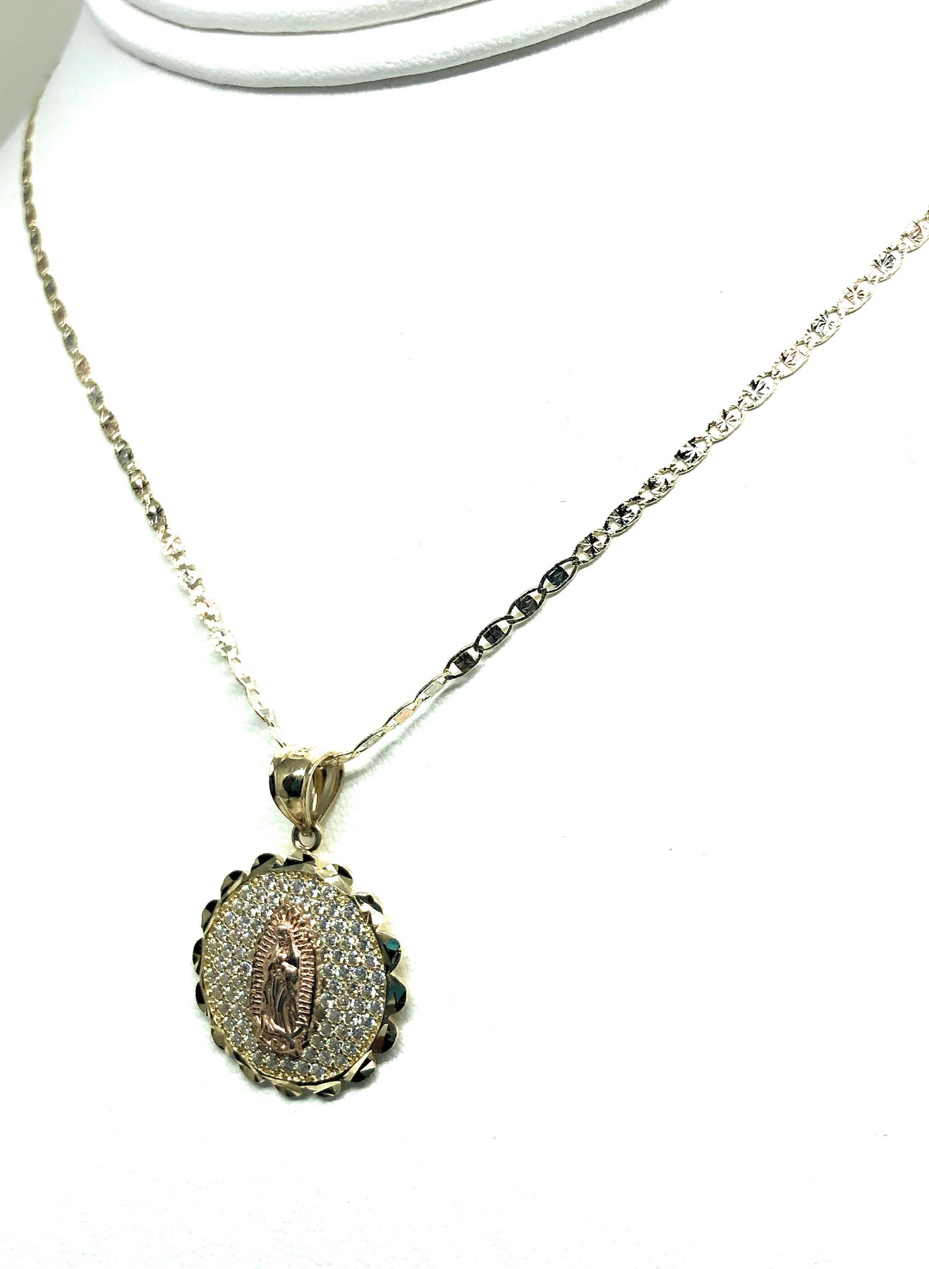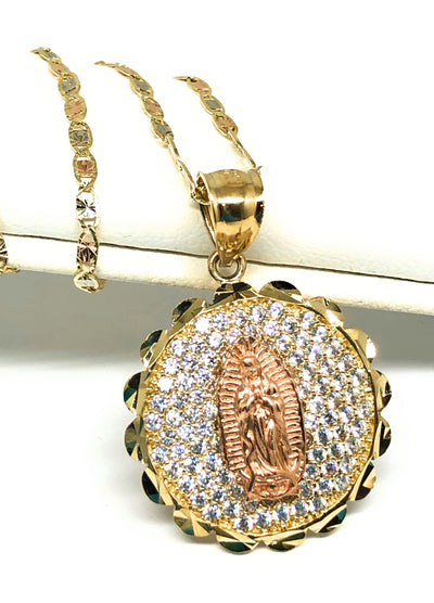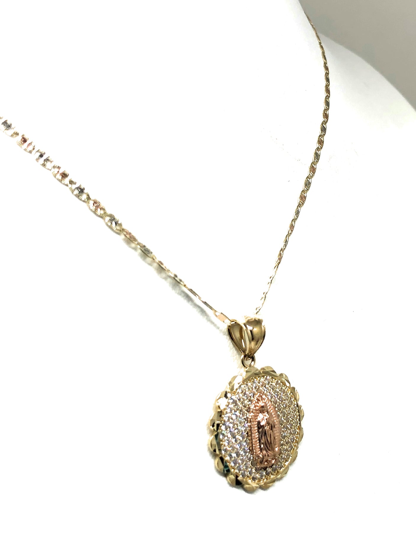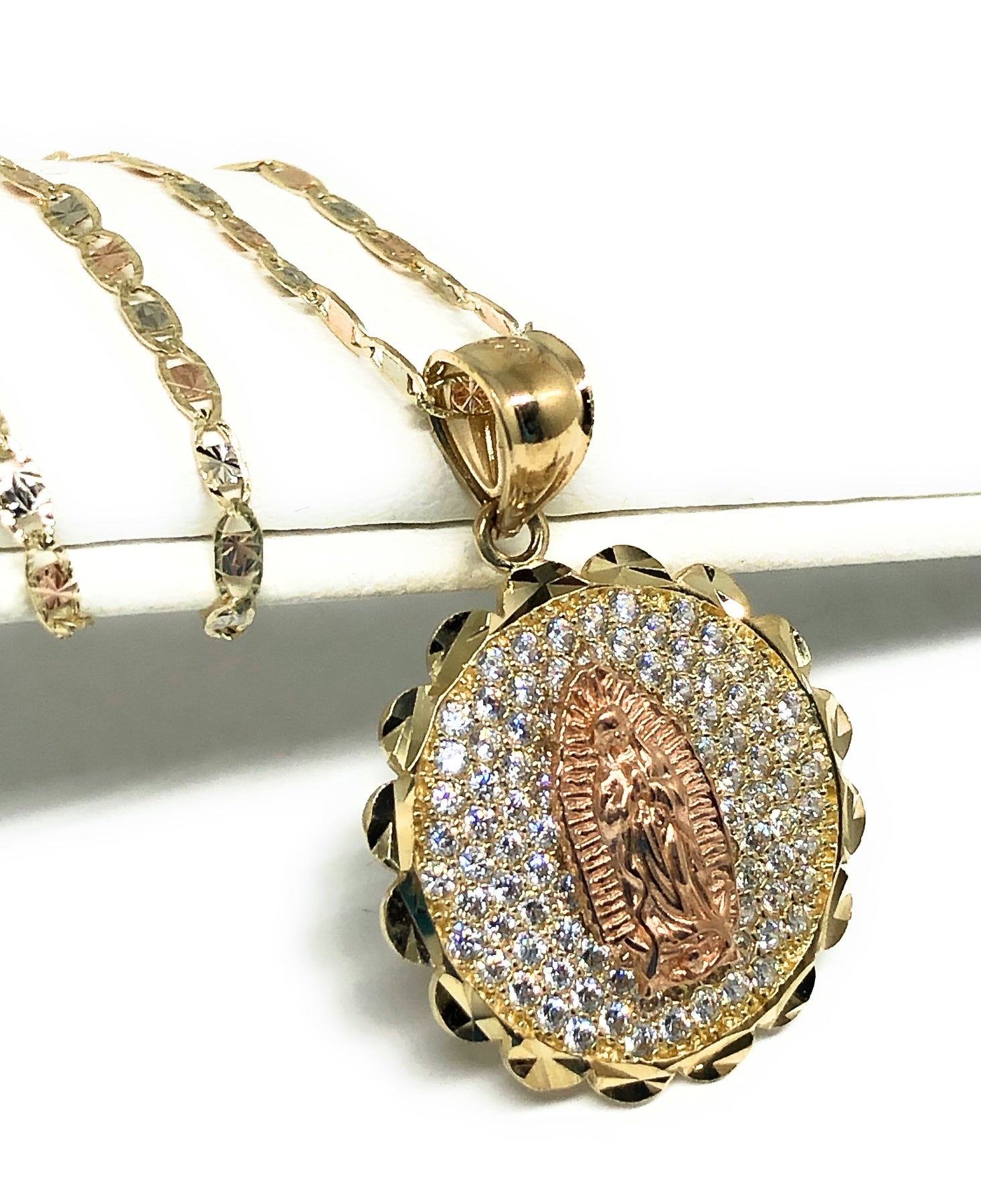 14k Solid Gold Virrgin Mary CZ Round Pendant Virrgen Guadalupe Valentina Chain