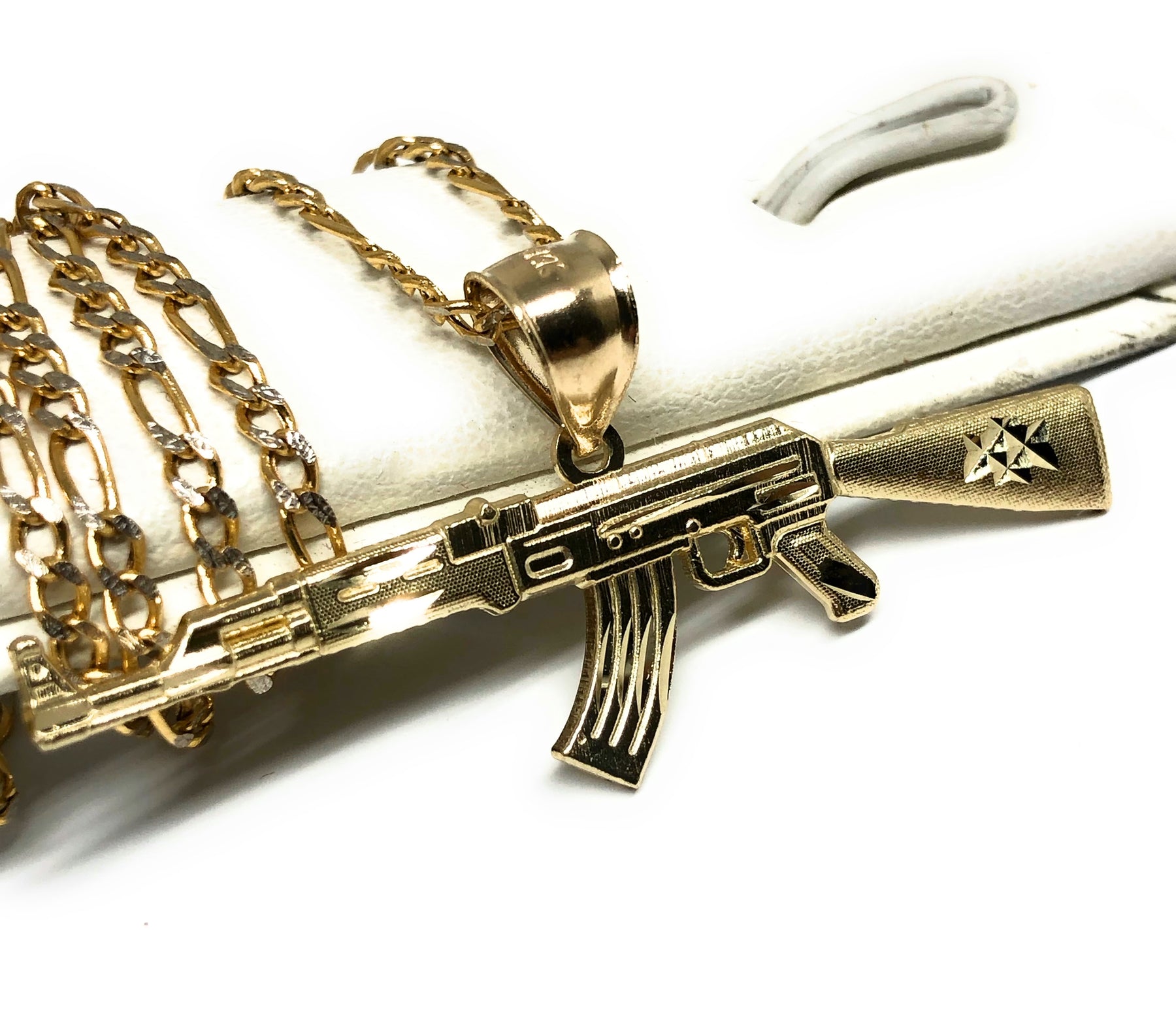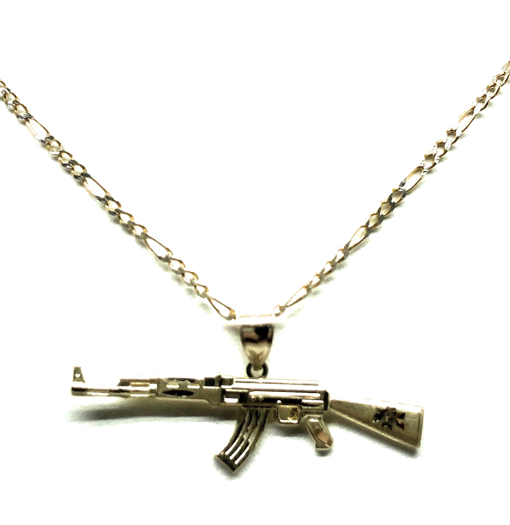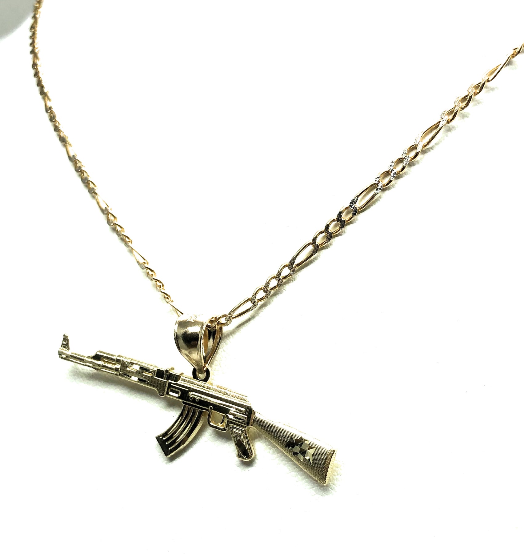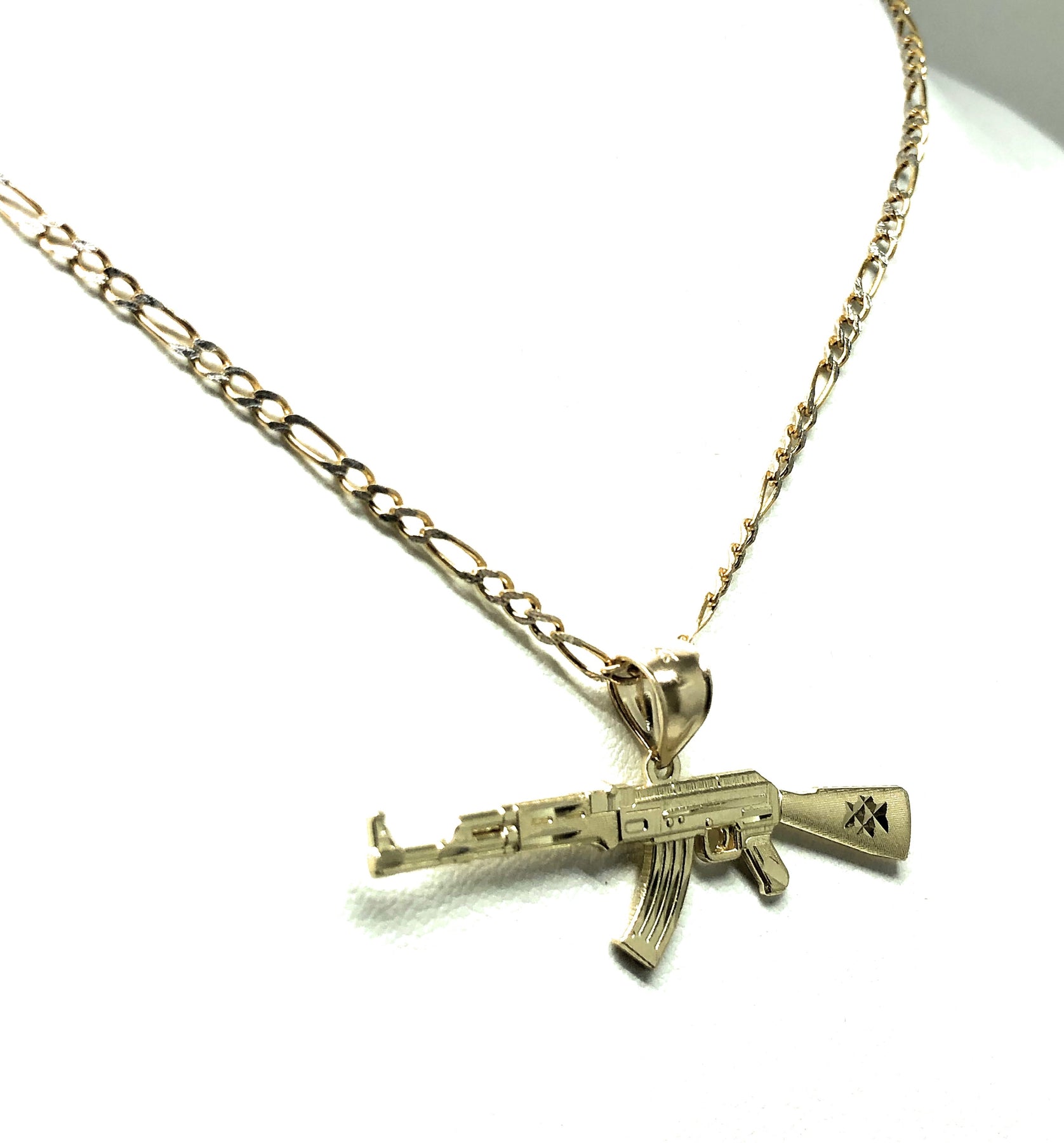 - Machine gun pendant and chain and 14k solid gold guaranteed.