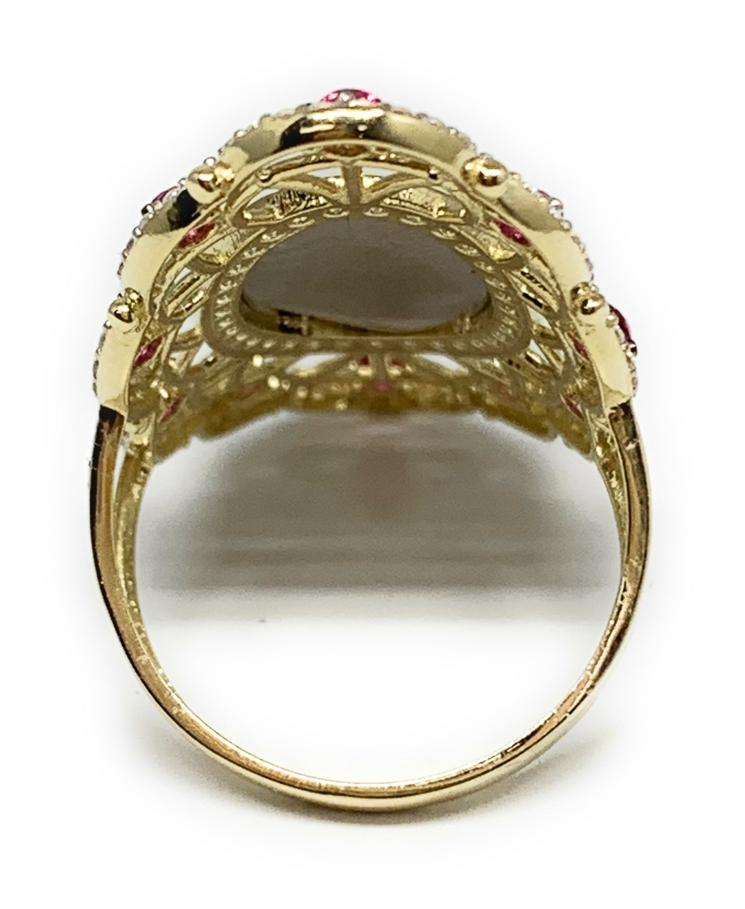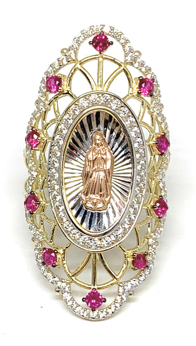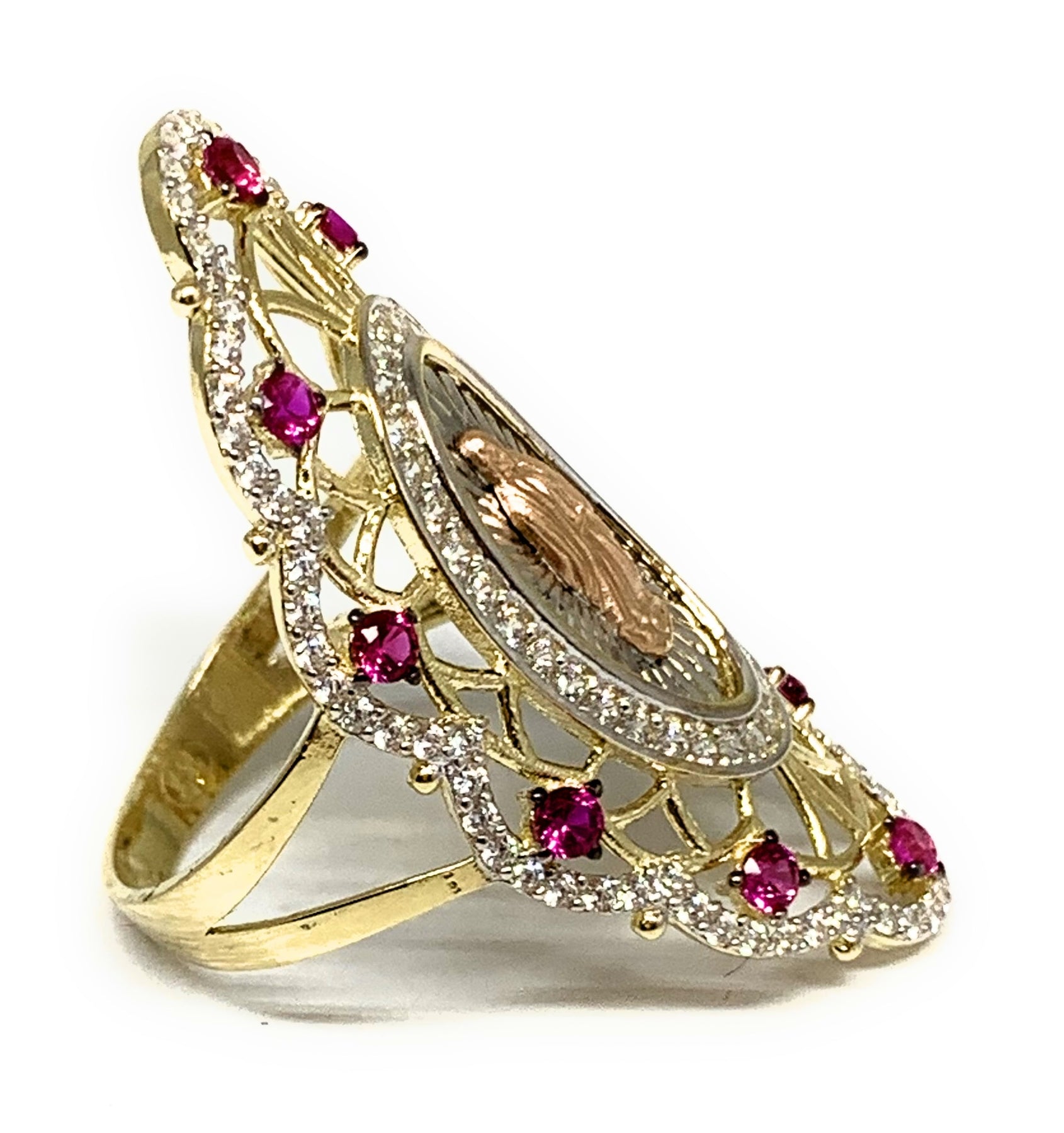 14k Solid Gold Tri-Color Virrgin Mary Red CZ Fancy Elegant Filigran Long Oval Ring