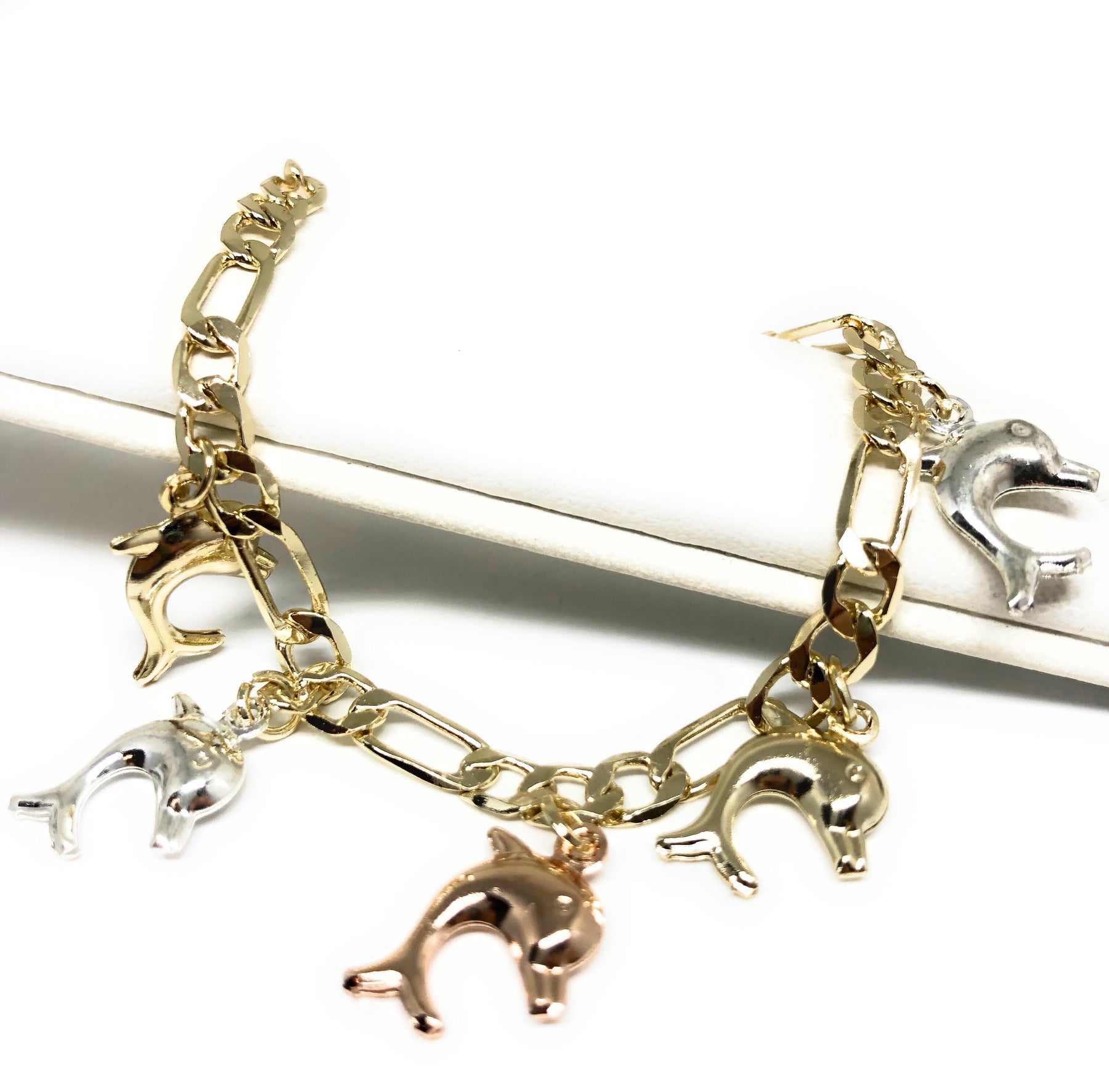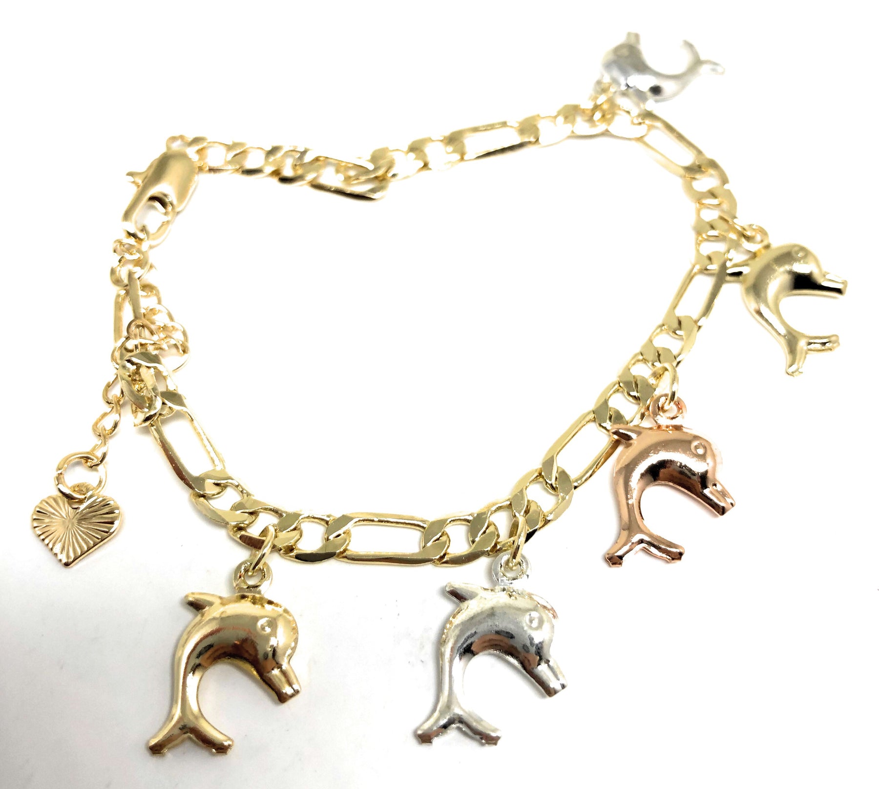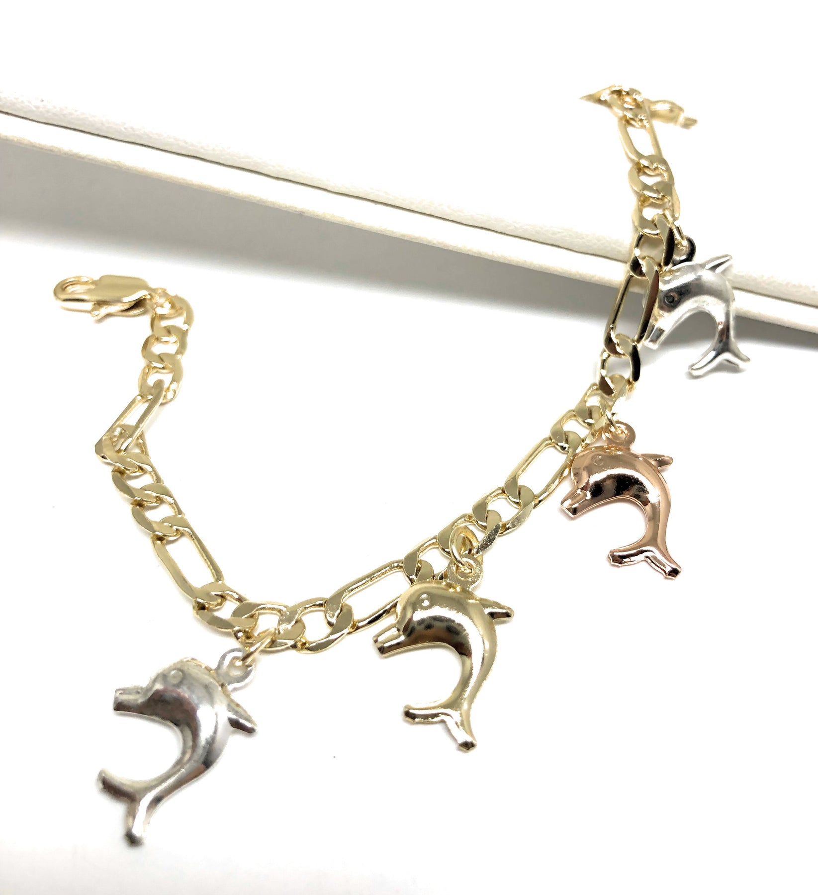Gold Plated Tri-Color Dolphin Charm Bracelet 8”