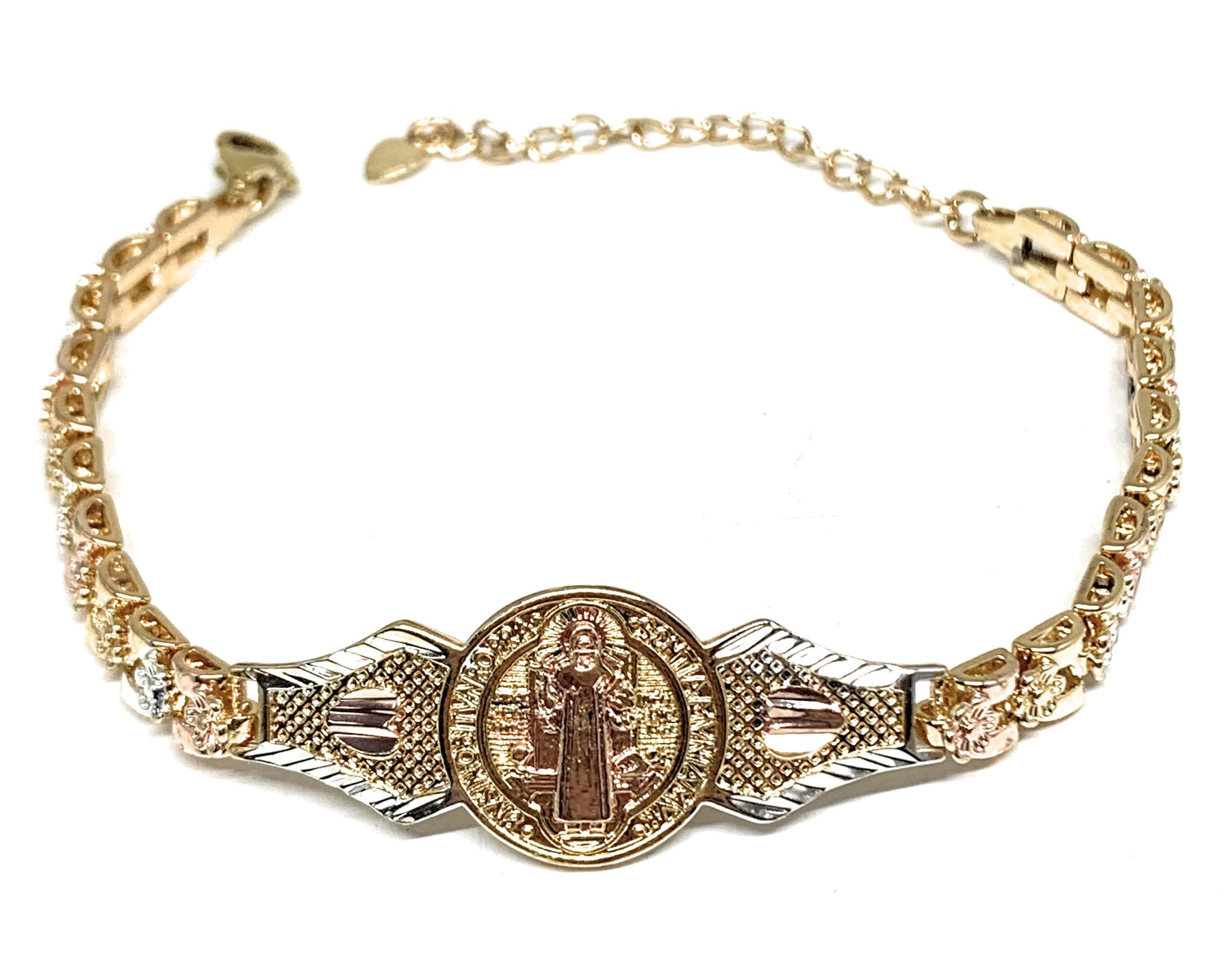 Gold Plated Tri-Color Saint Benedict Bracelet San Benito Pulsera Oro Laminado 8"