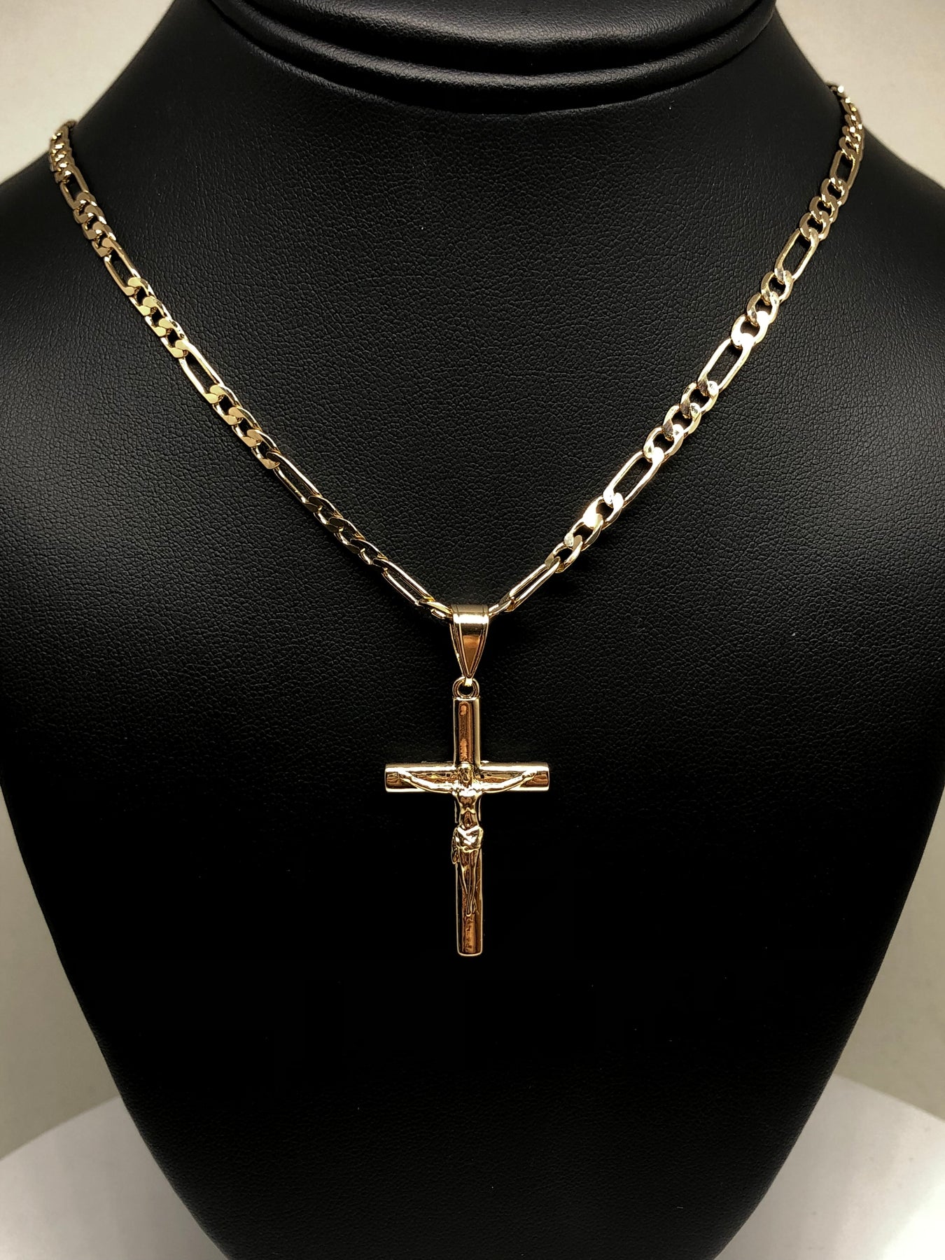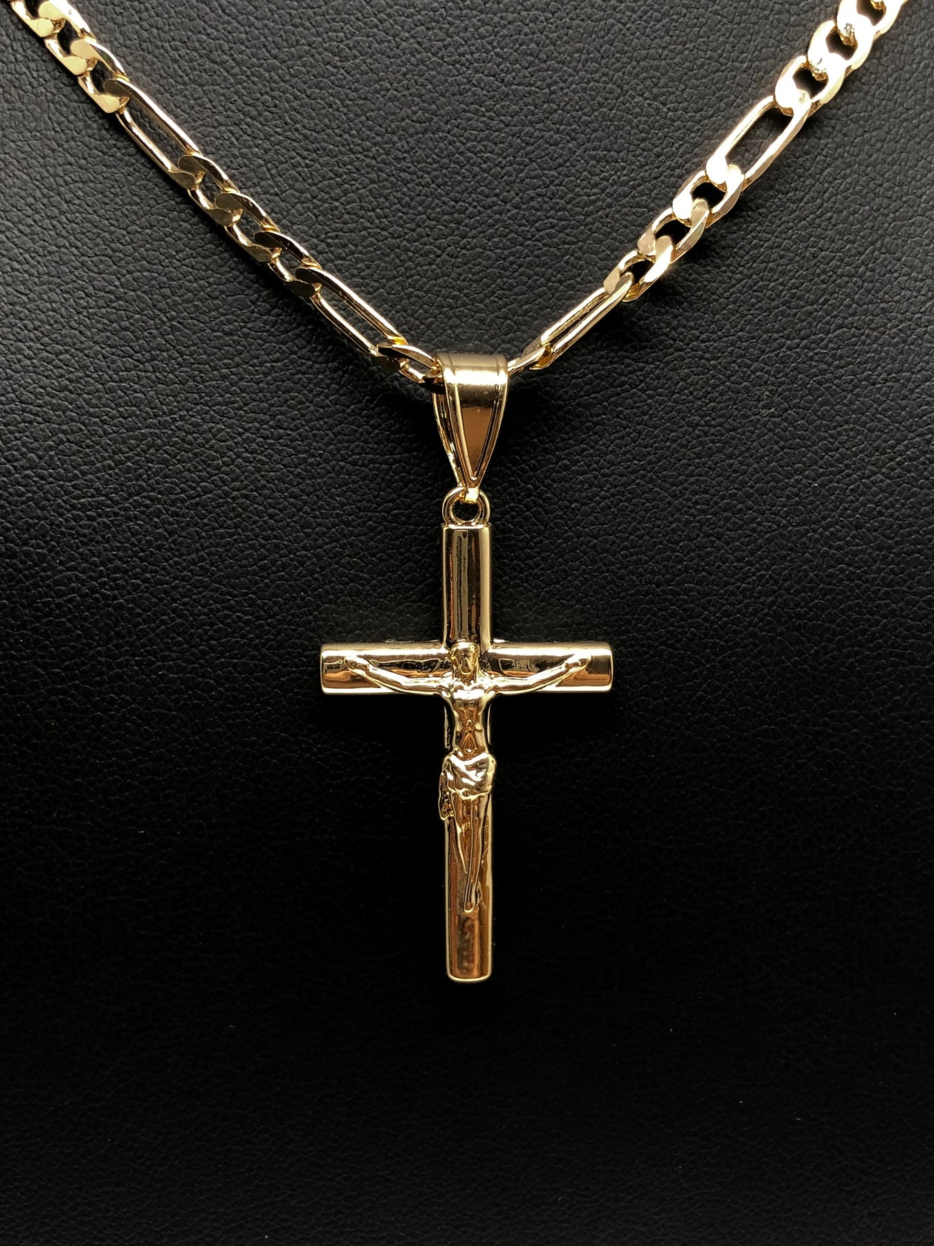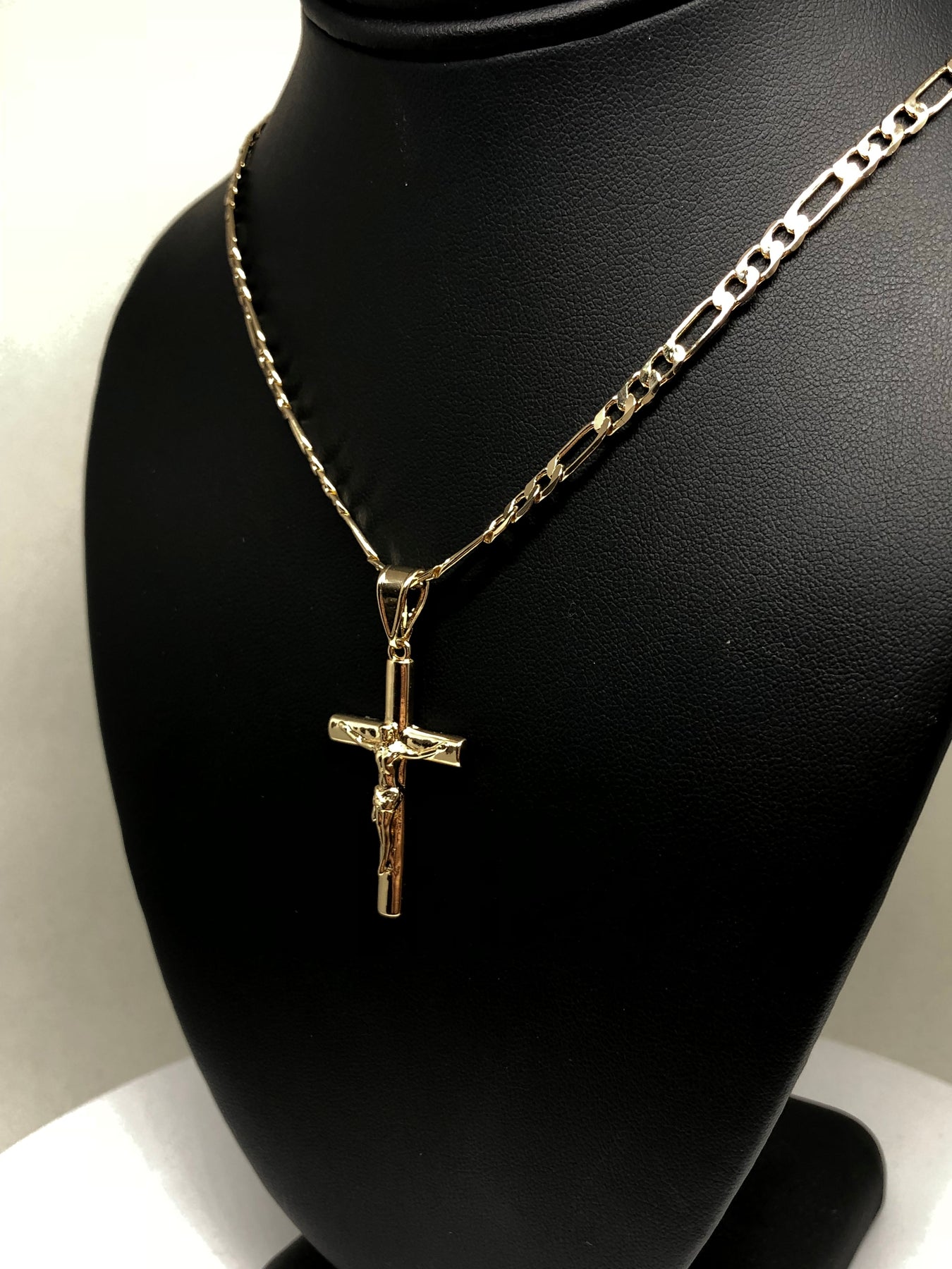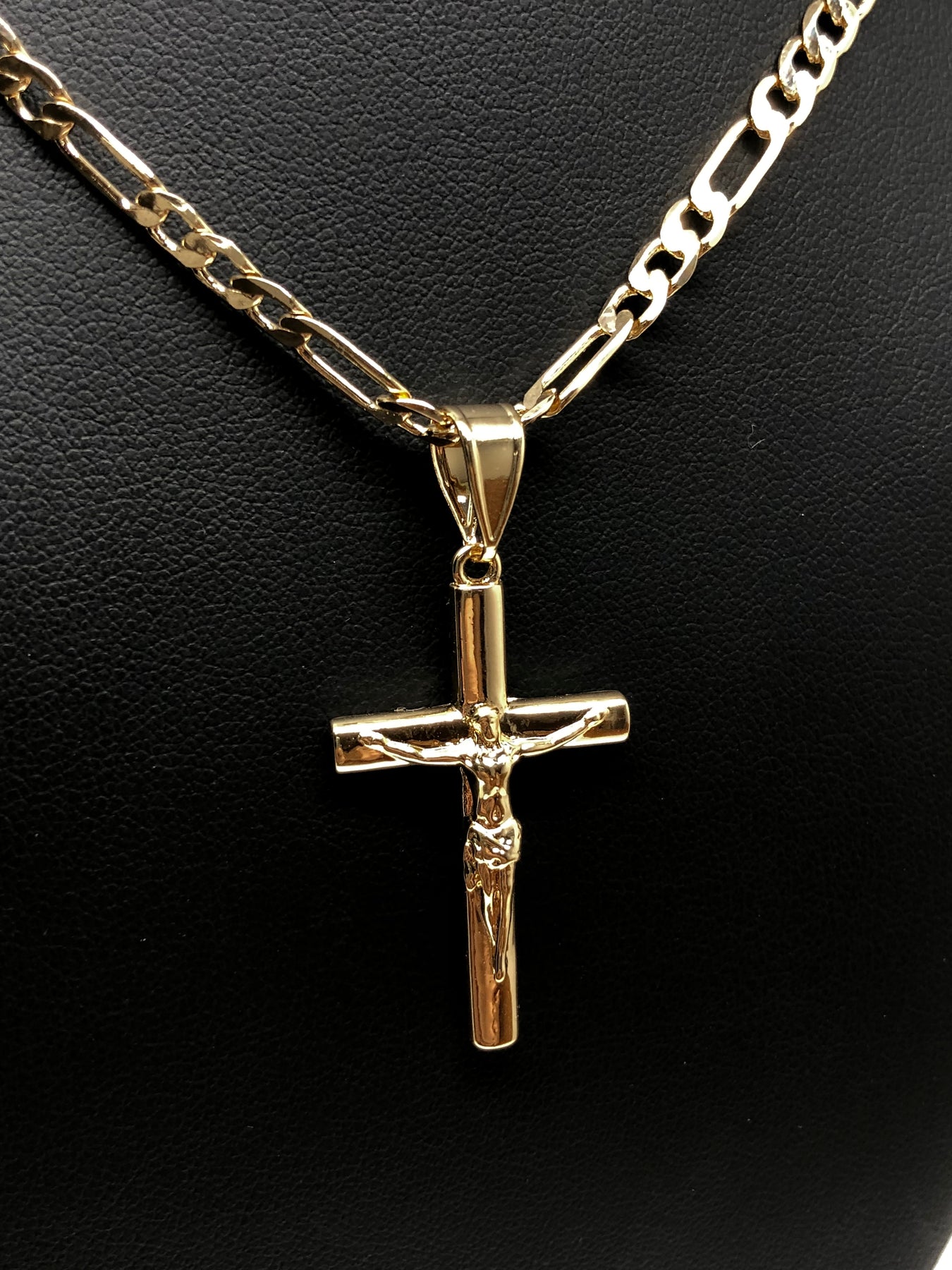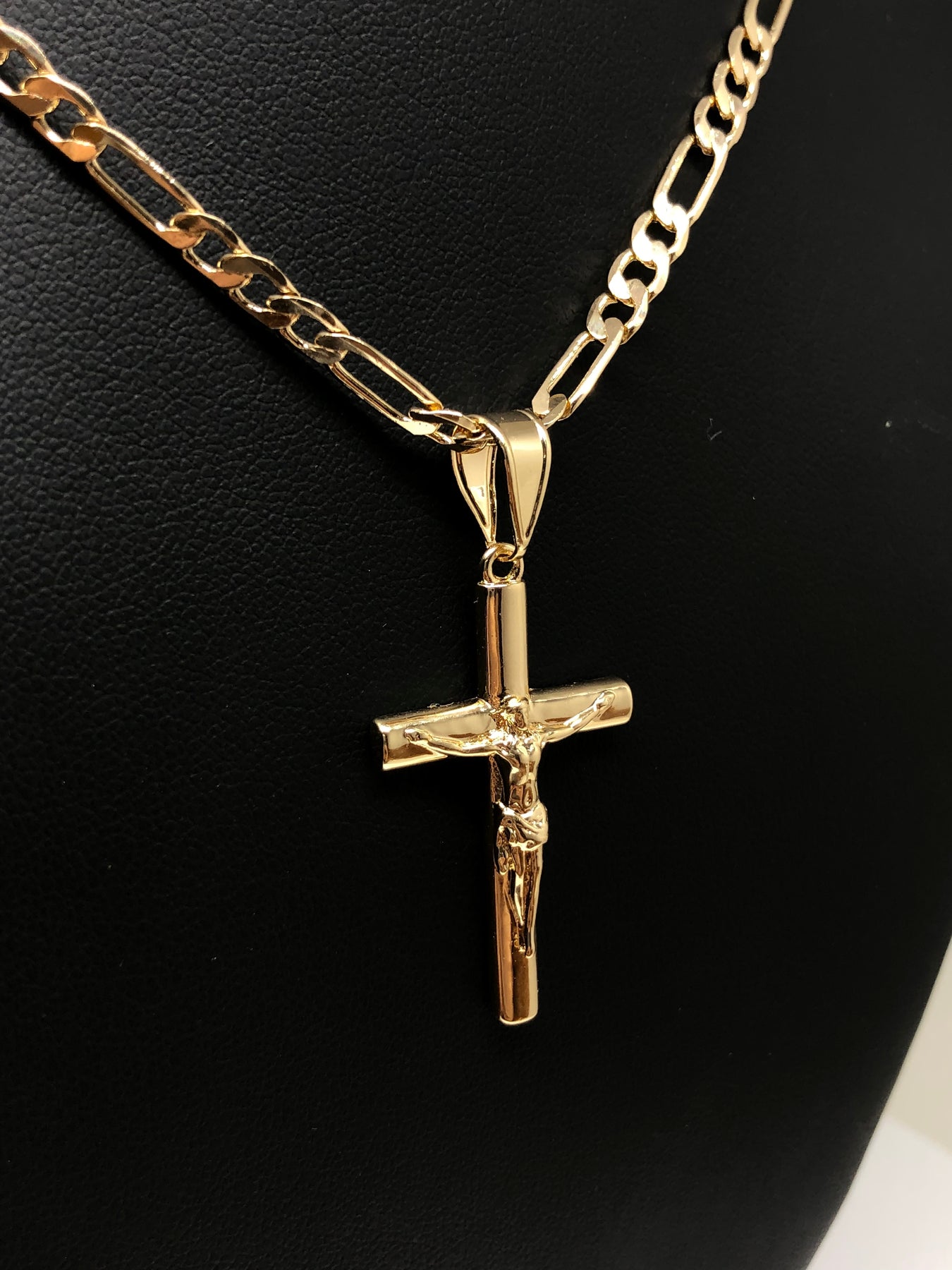 • Brand new gold laminated 24 inch Figaro chain with Jesus cross Crucifix and white stones.