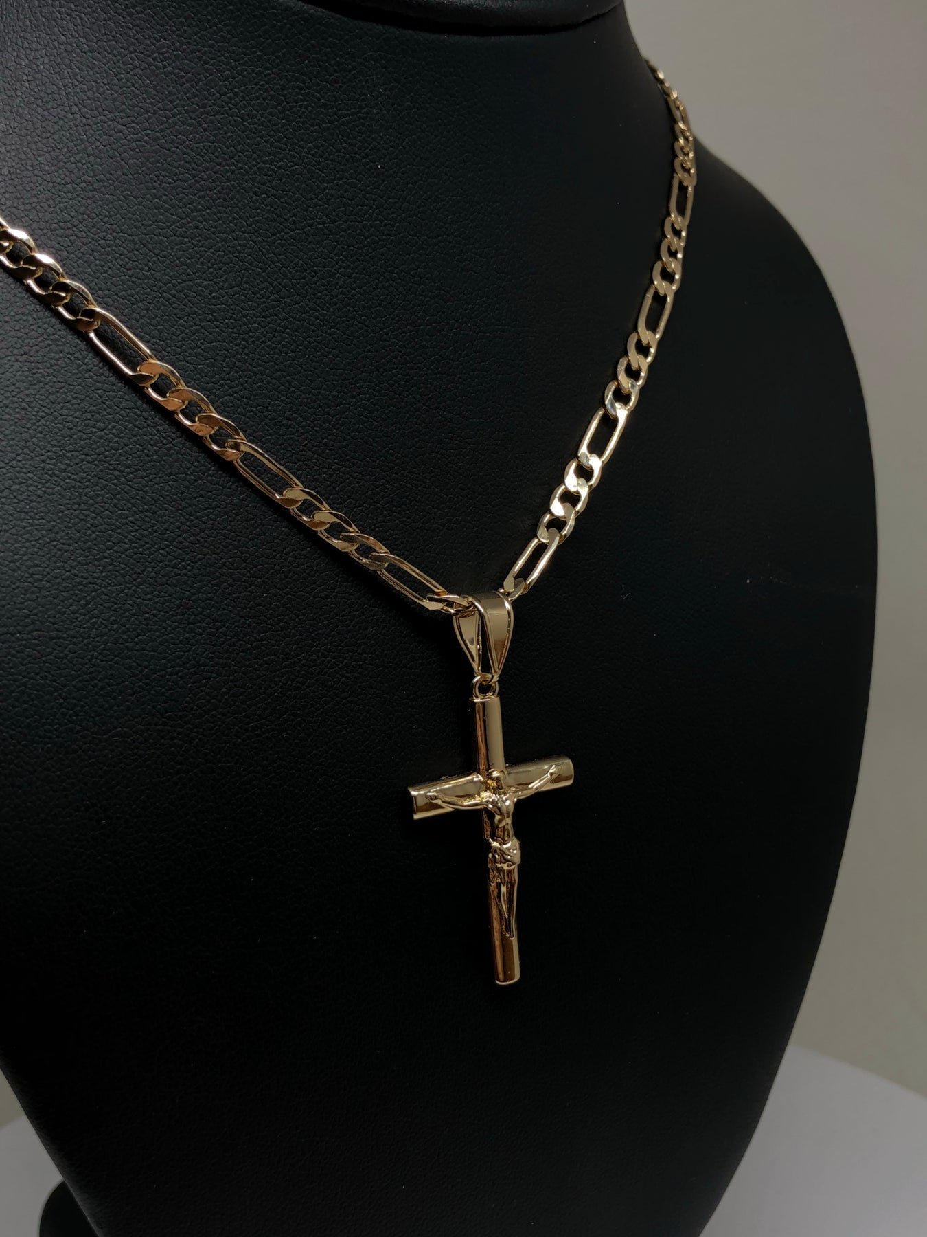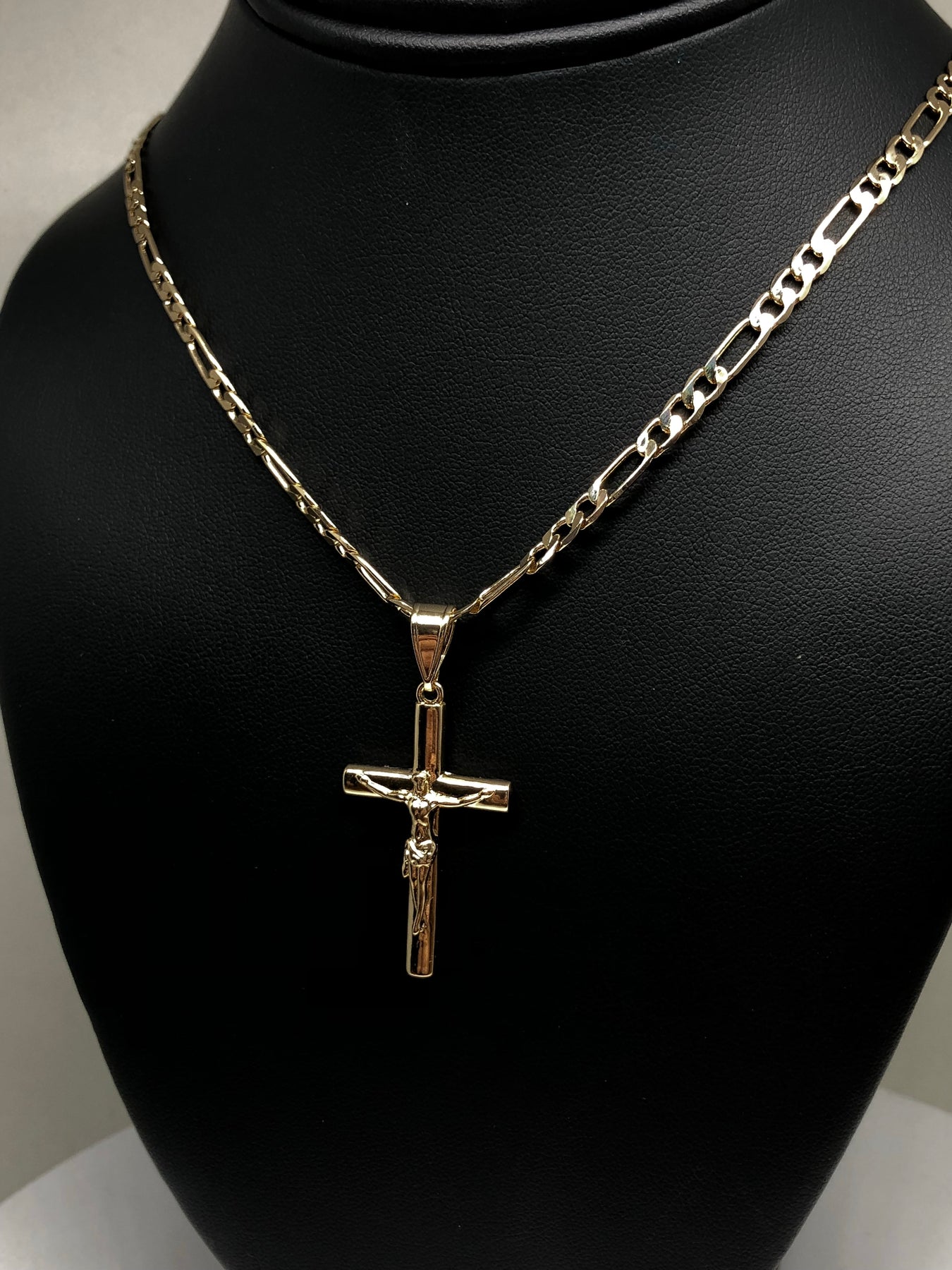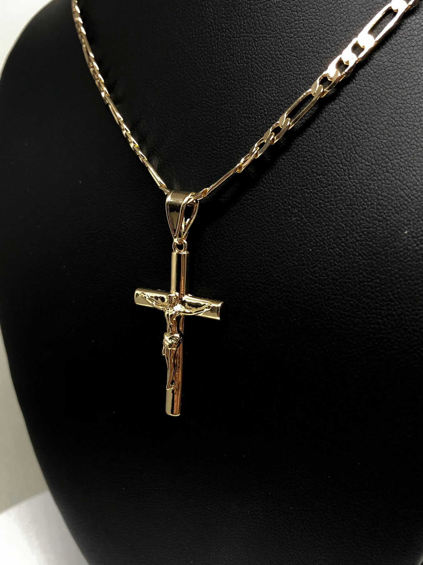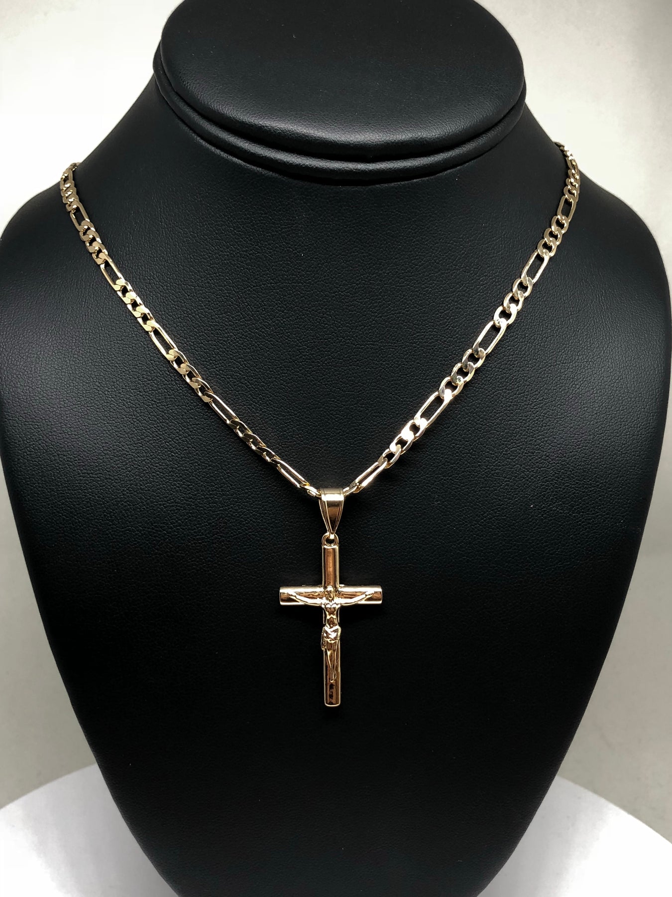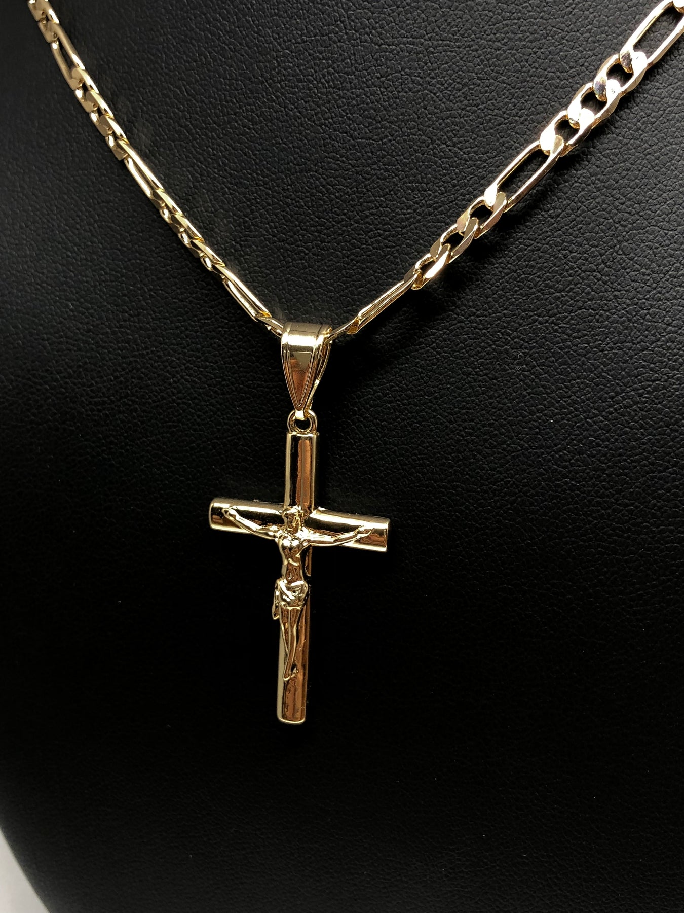 • Brand new gold laminated 24 inch Figaro chain with Jesus cross Crucifix and white stones.