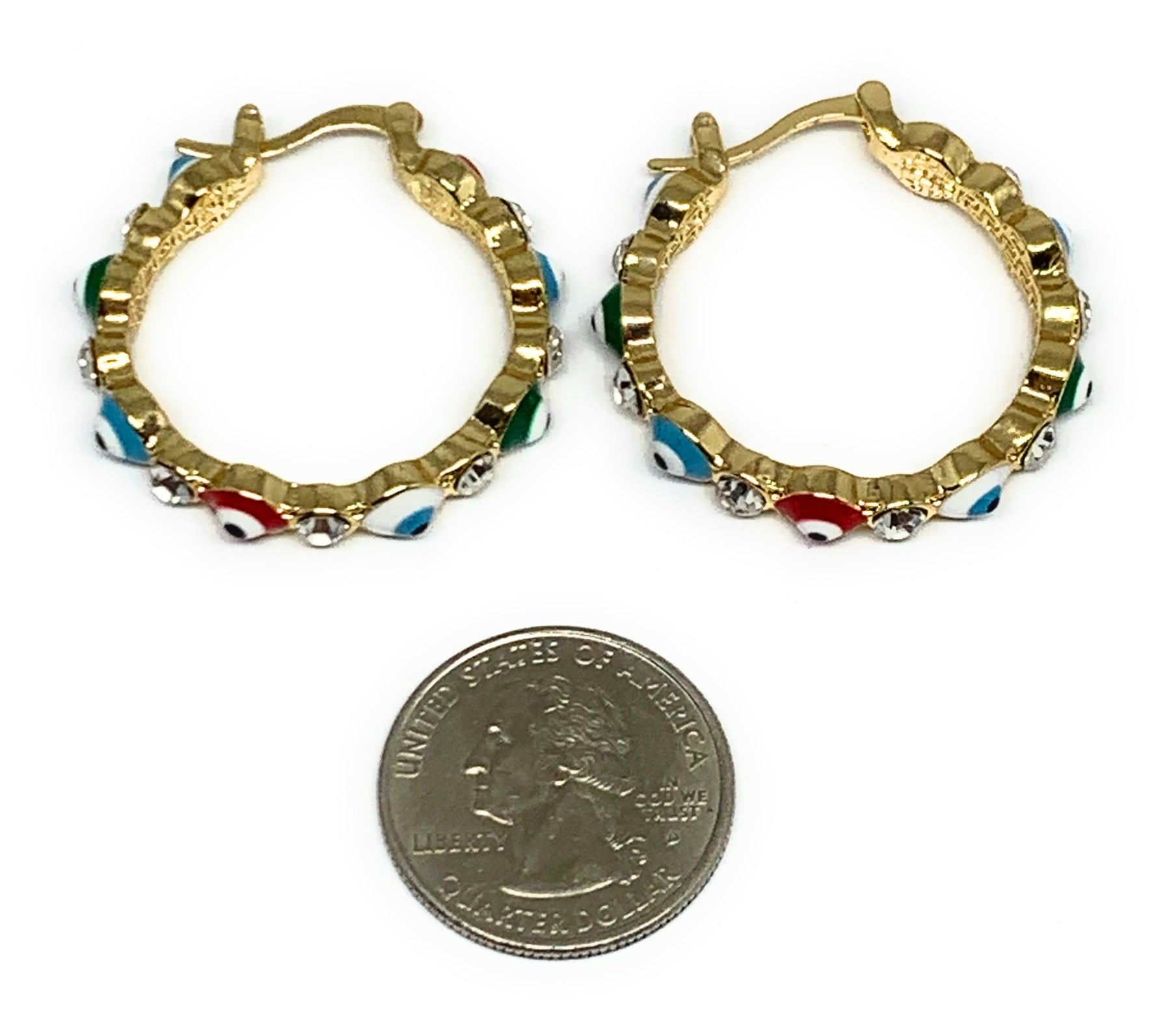 Gold Plated Evil Eye MULTI-COLOR Hoop Earrings Aretes Arracadas (1.25 INCH)