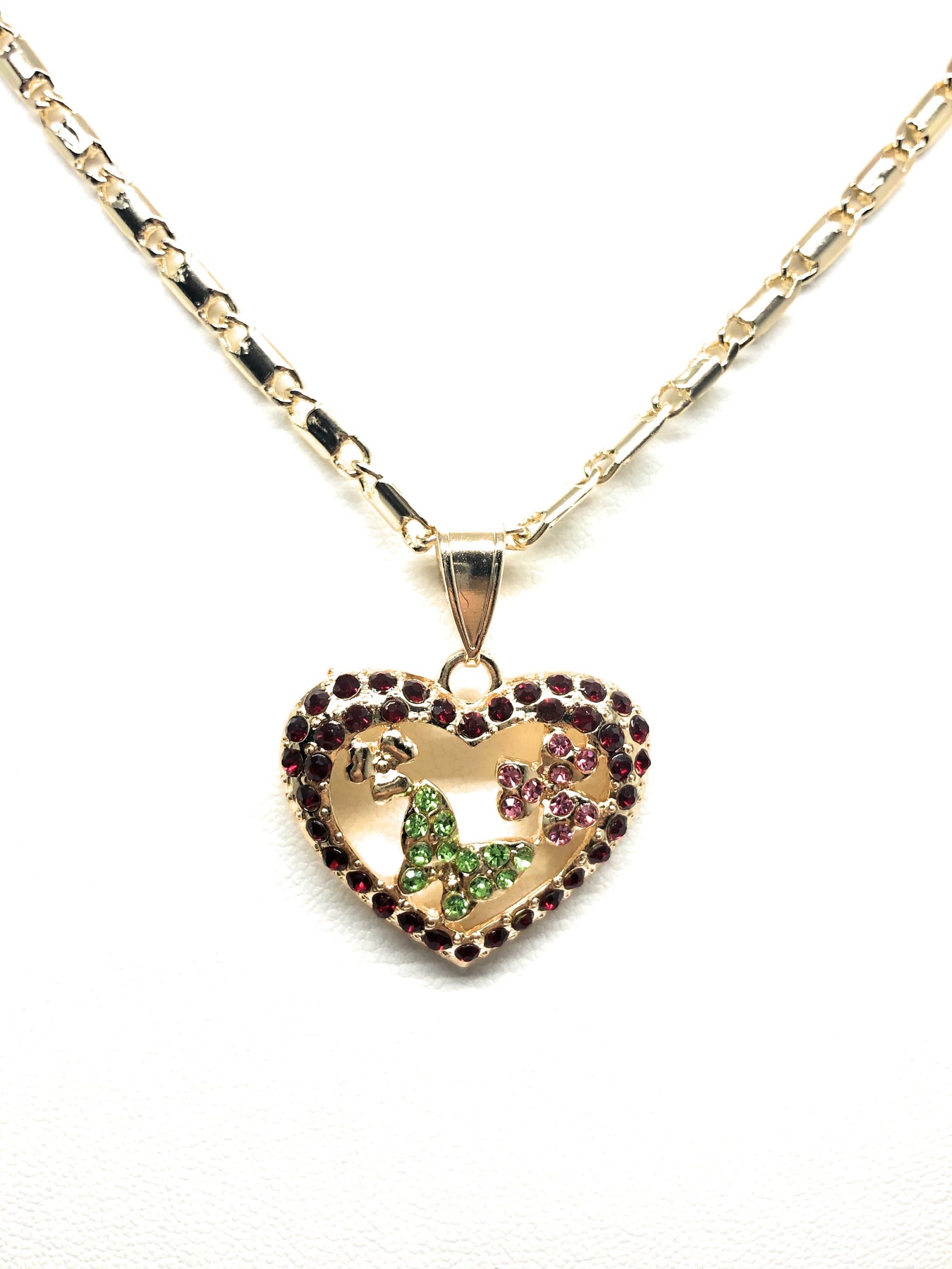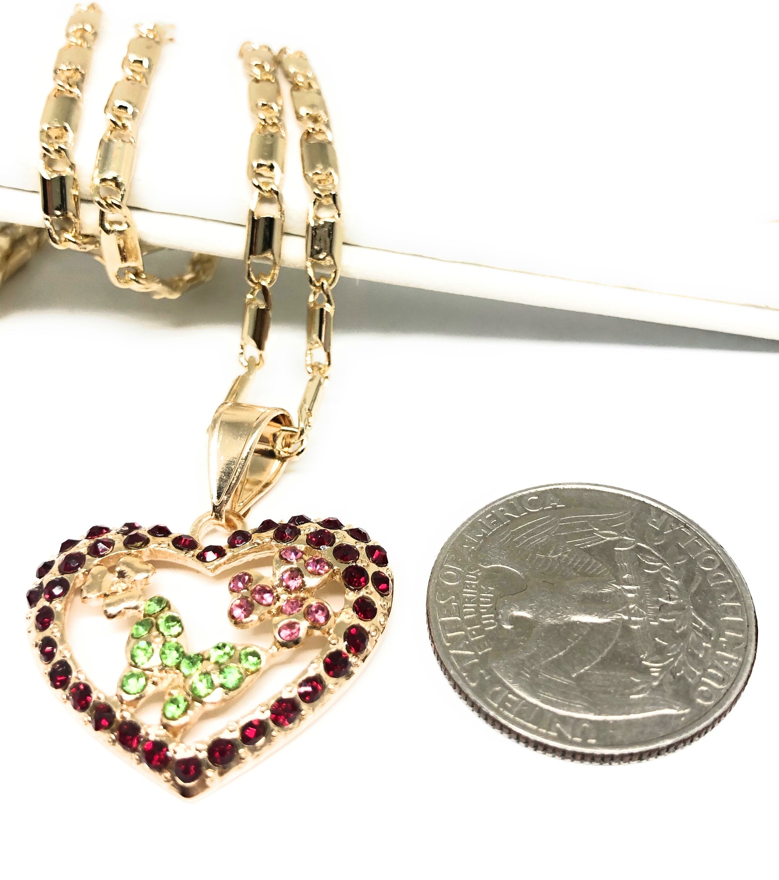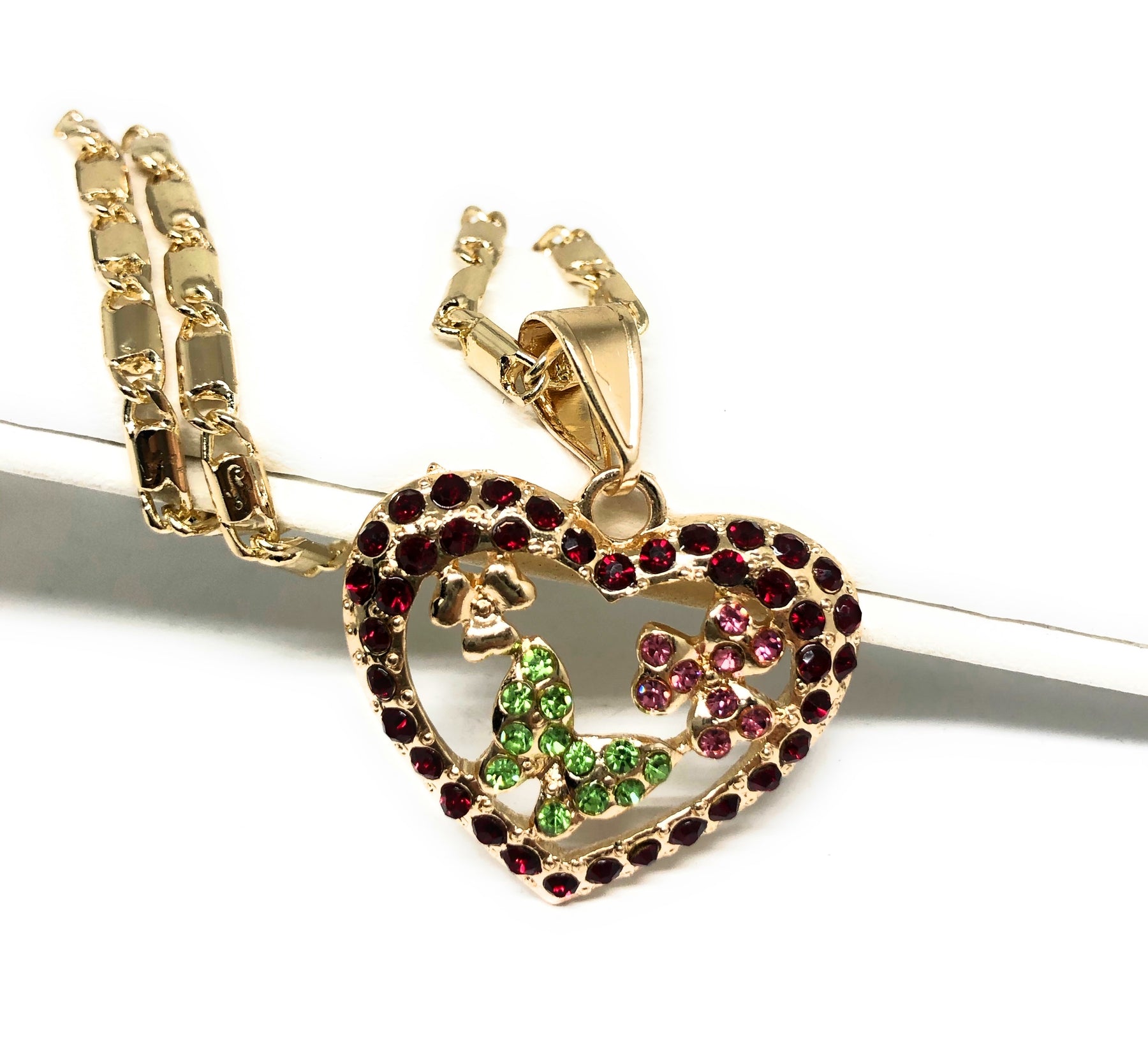 • Heart Shaped Pendant with Butterfly and flower Rhinestones shapes comes with 24 inch Valentina chain with 4mm width.