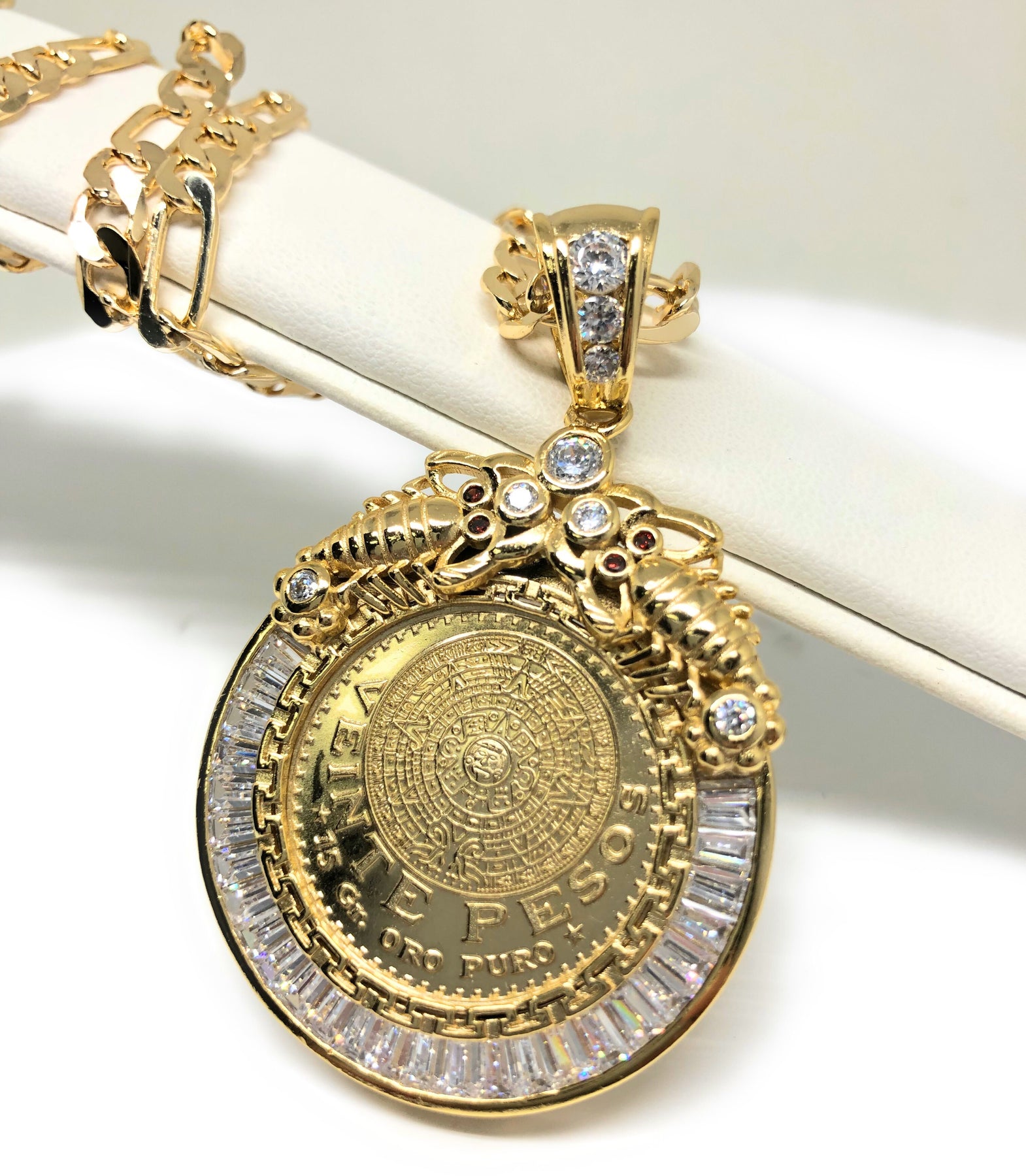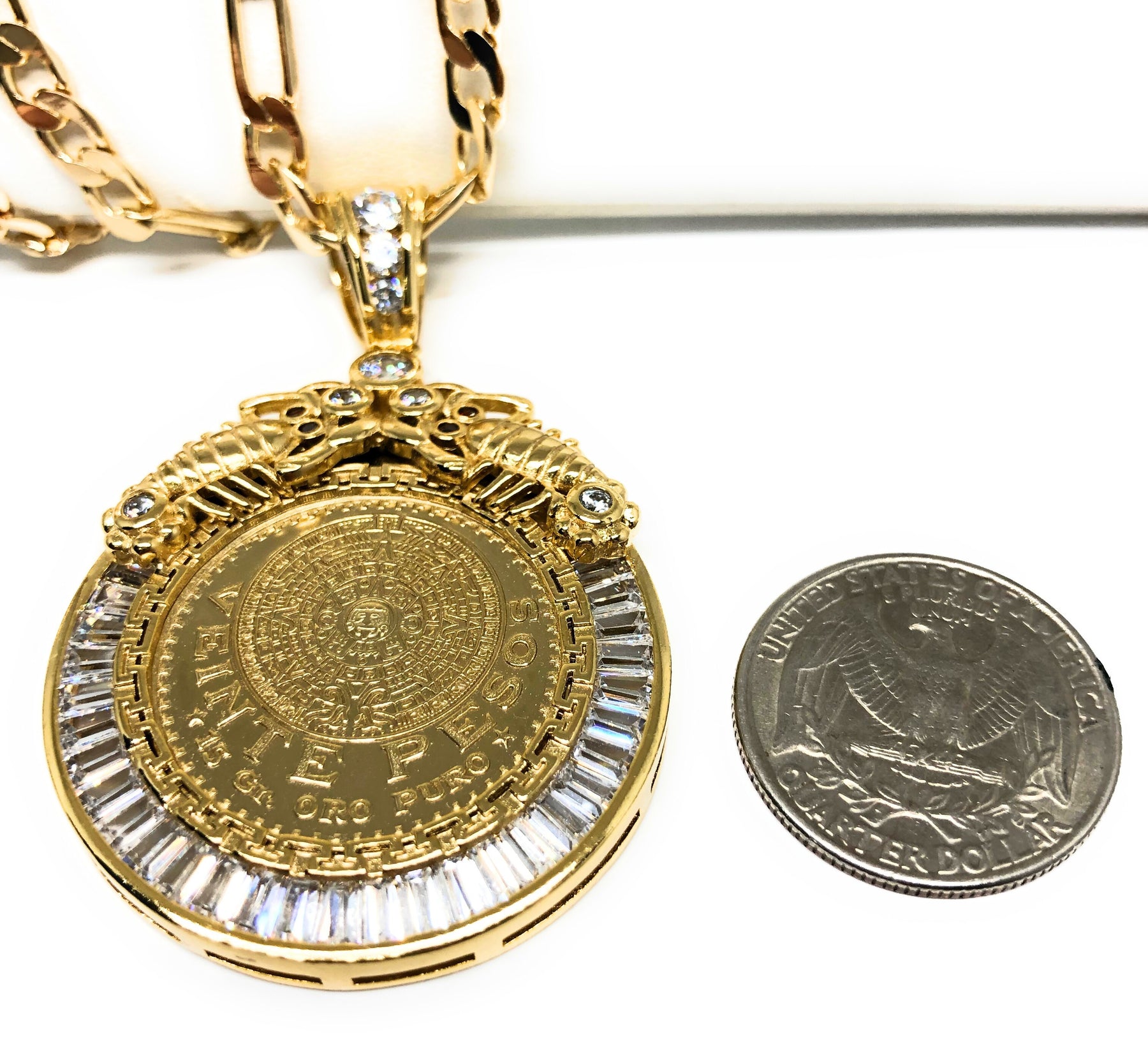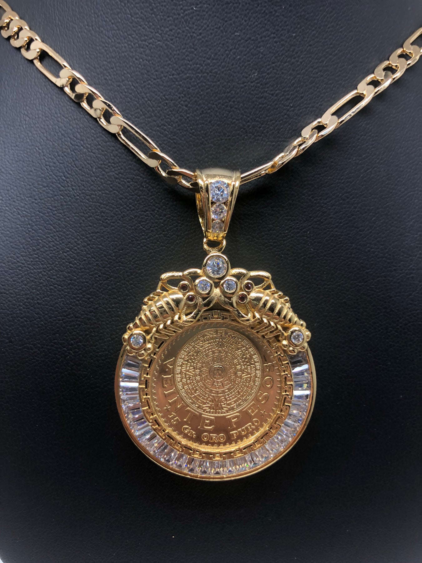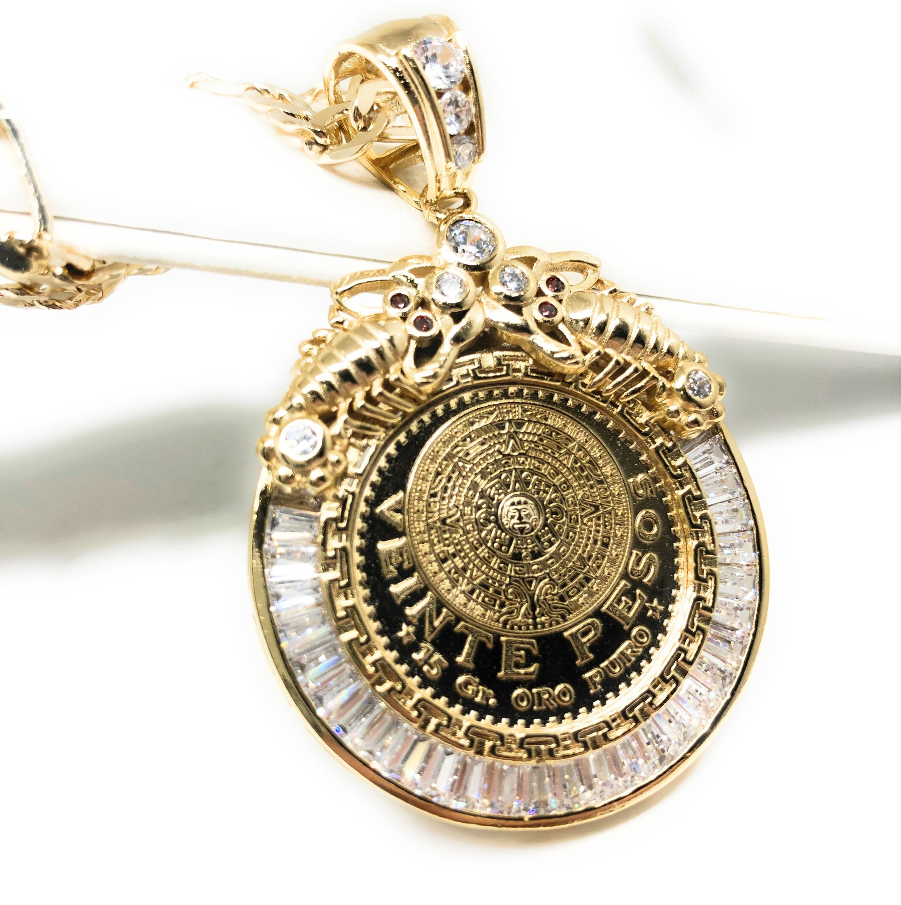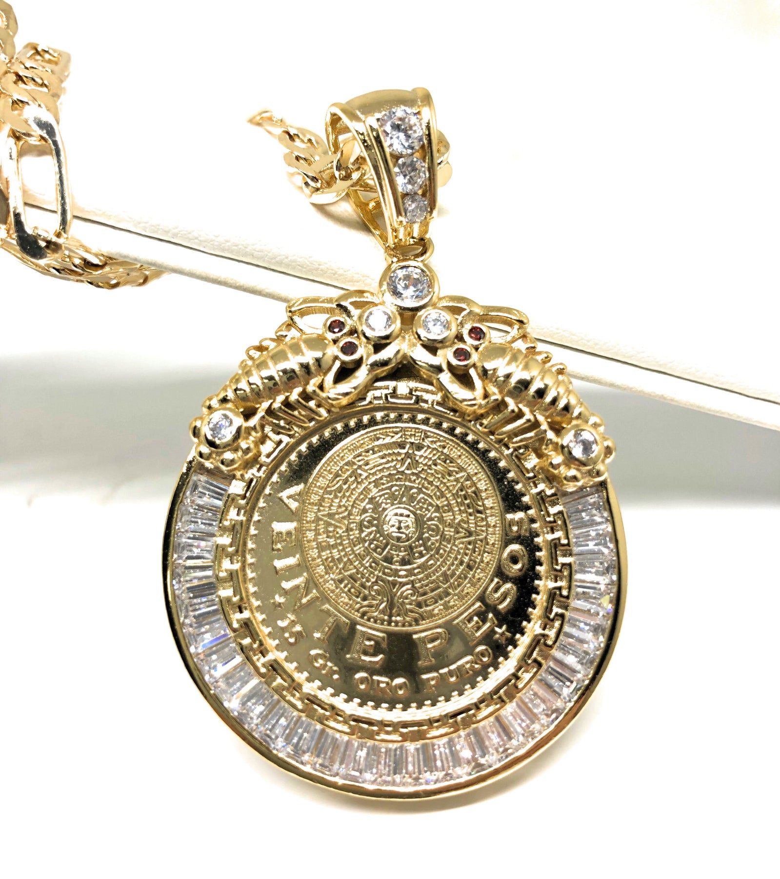 Gold Plated Mexican 20 Pesos Coin Aztec Calendar Scorpion CZ Oro Laminado Con Cadena Figaro 26" 5mm
