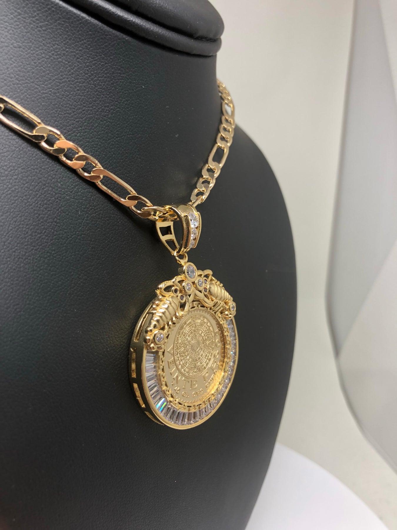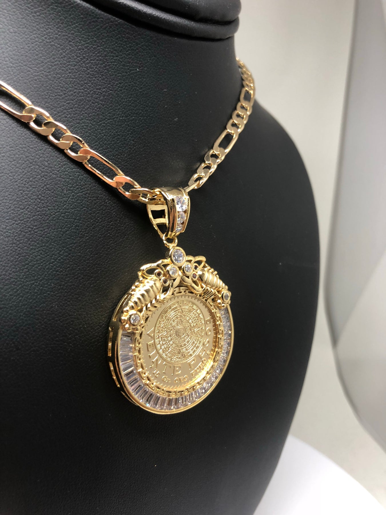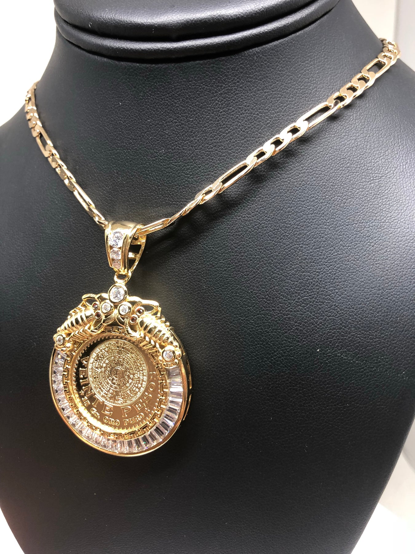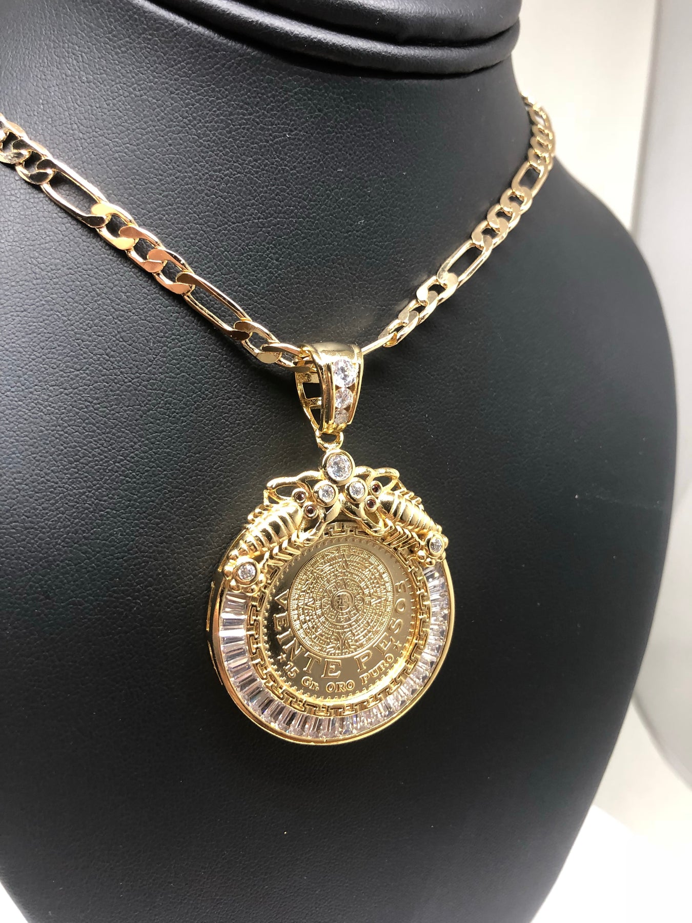 Gold Plated Mexican 20 Pesos Coin Aztec Calendar Scorpion CZ Oro Laminado Con Cadena Figaro 26" 5mm