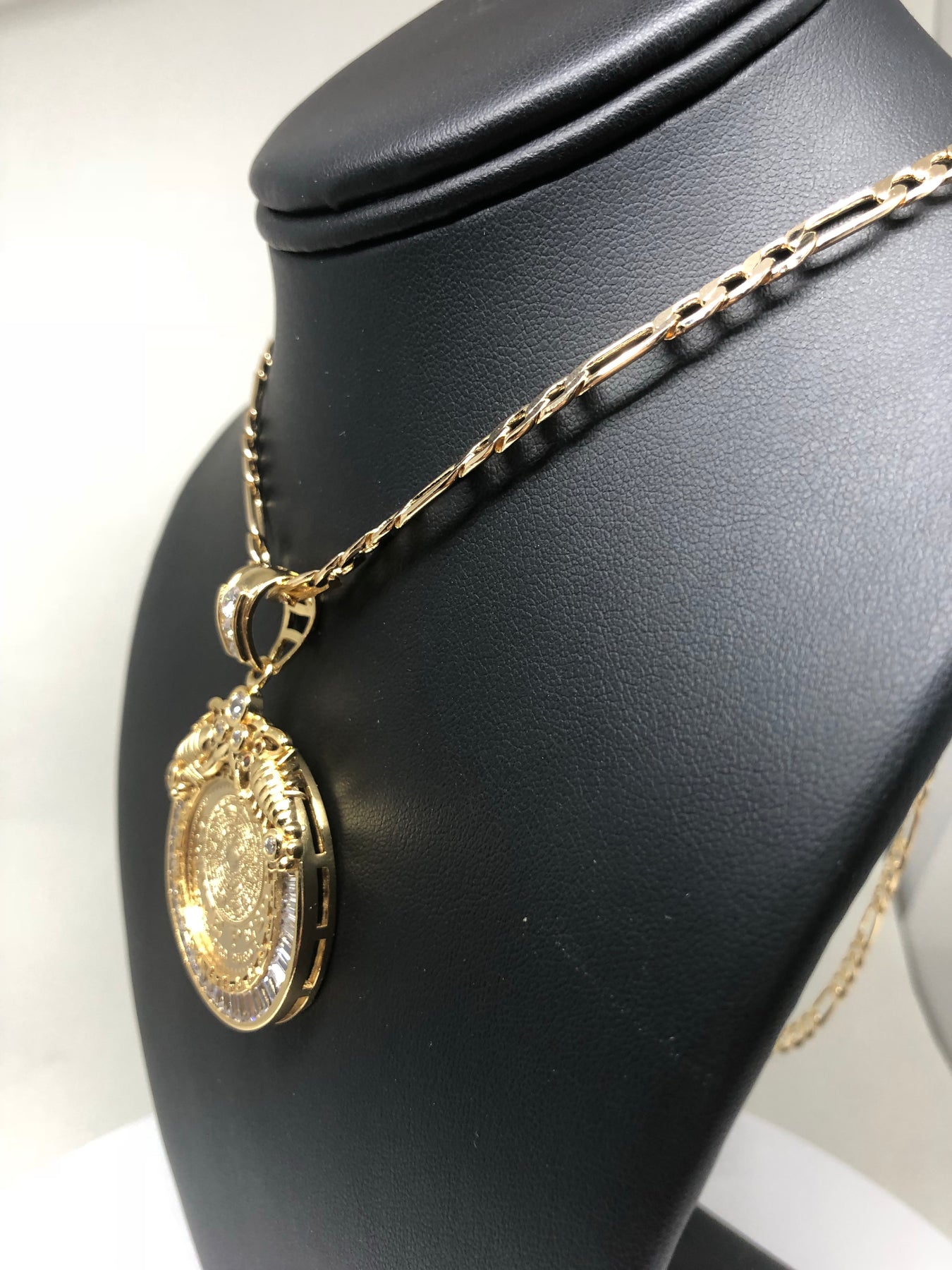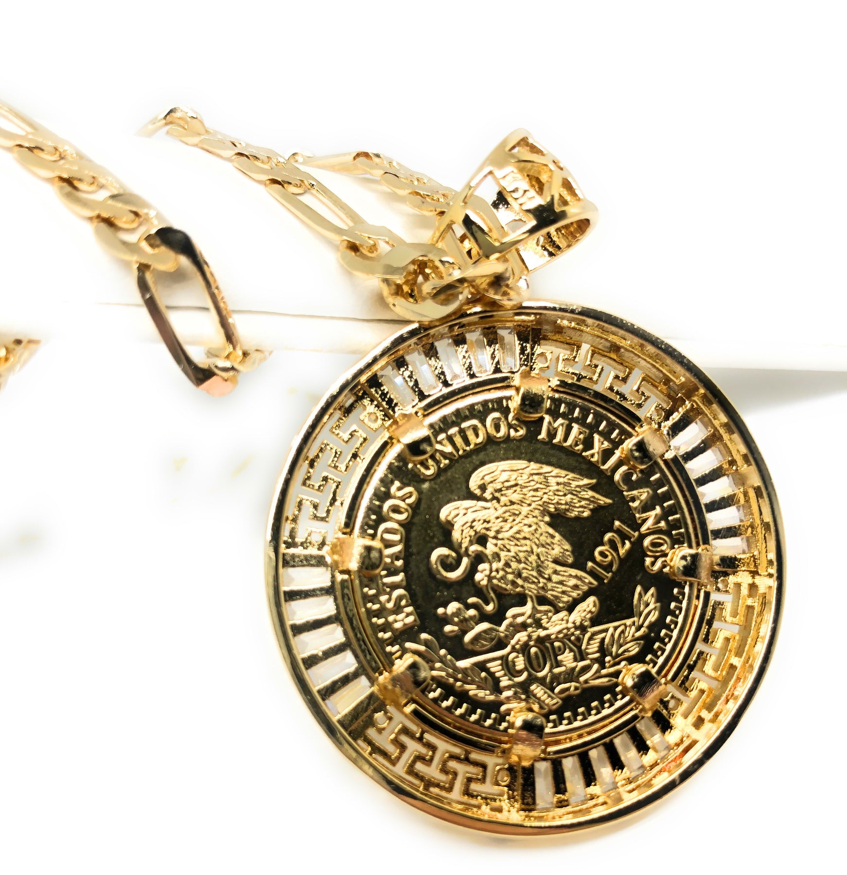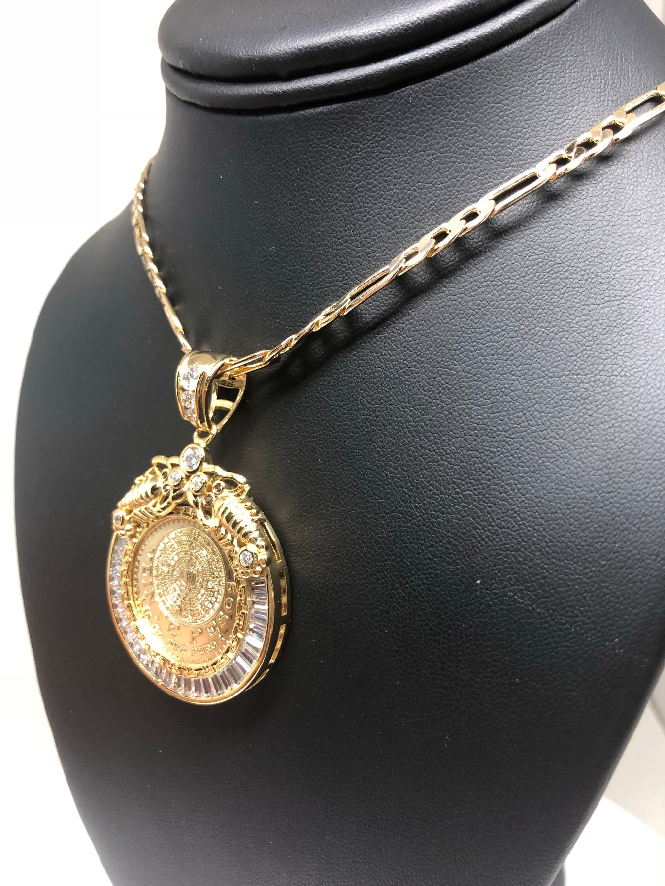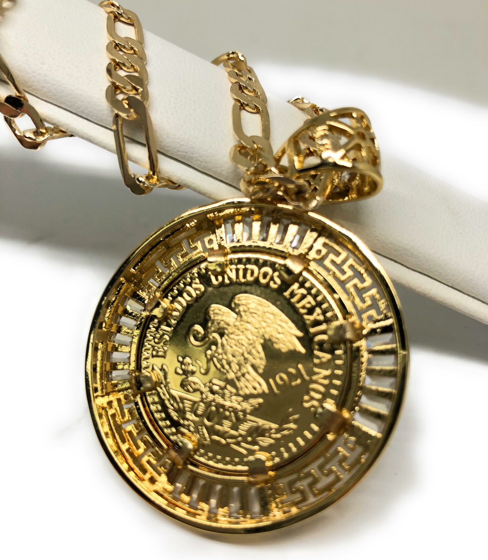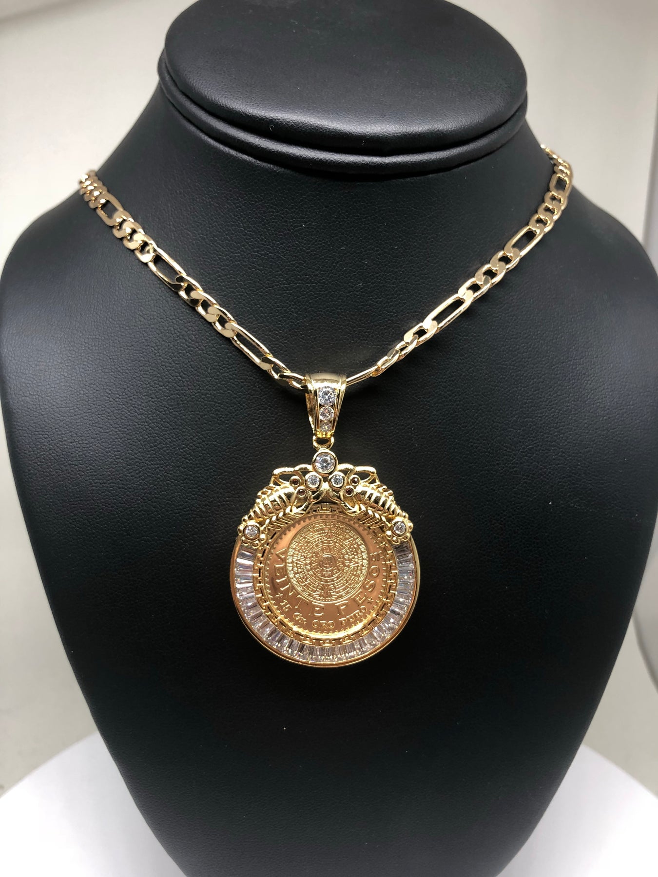 Gold Plated Mexican 20 Pesos Coin Aztec Calendar Scorpion CZ Oro Laminado Con Cadena Figaro 26" 5mm