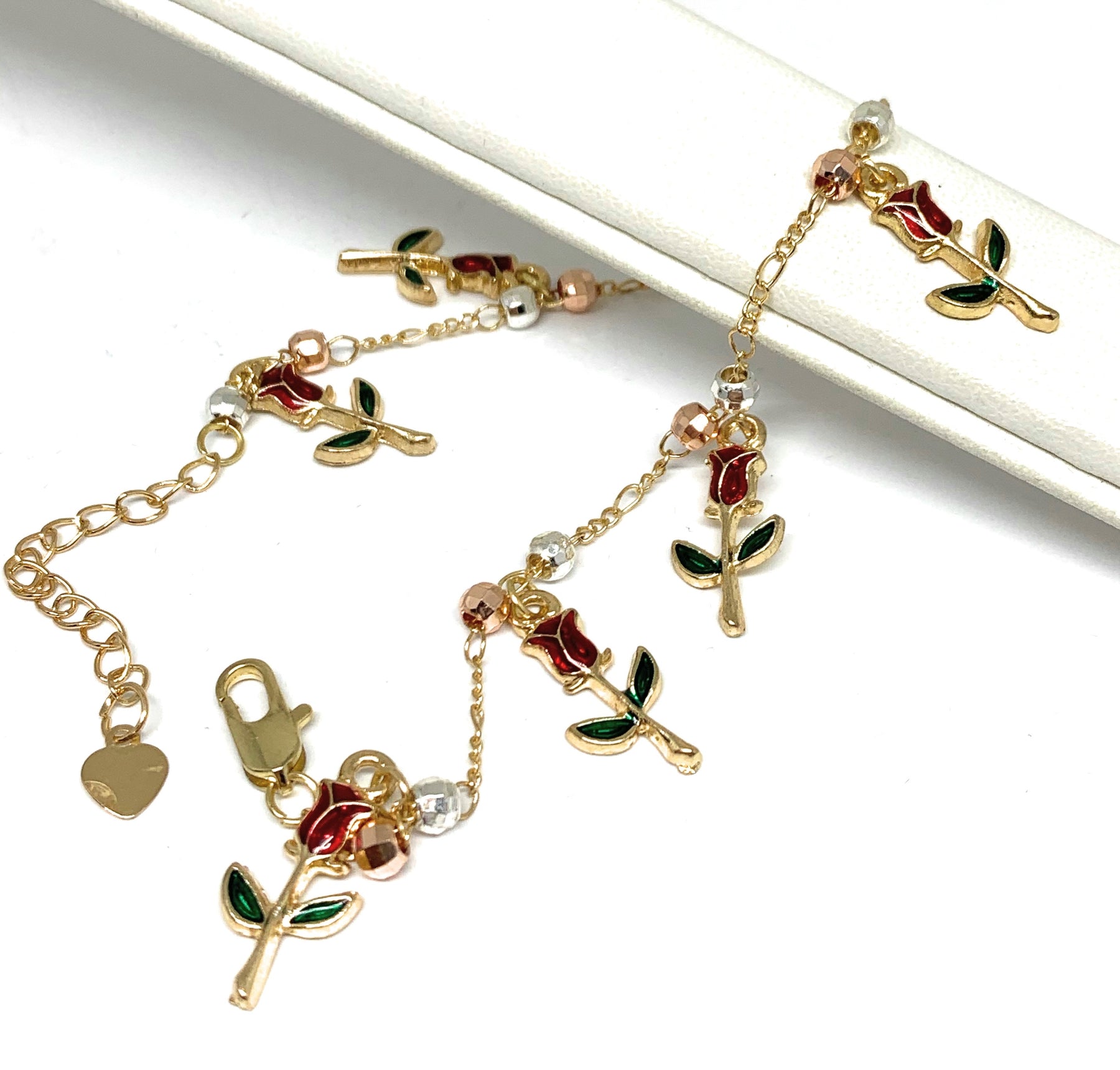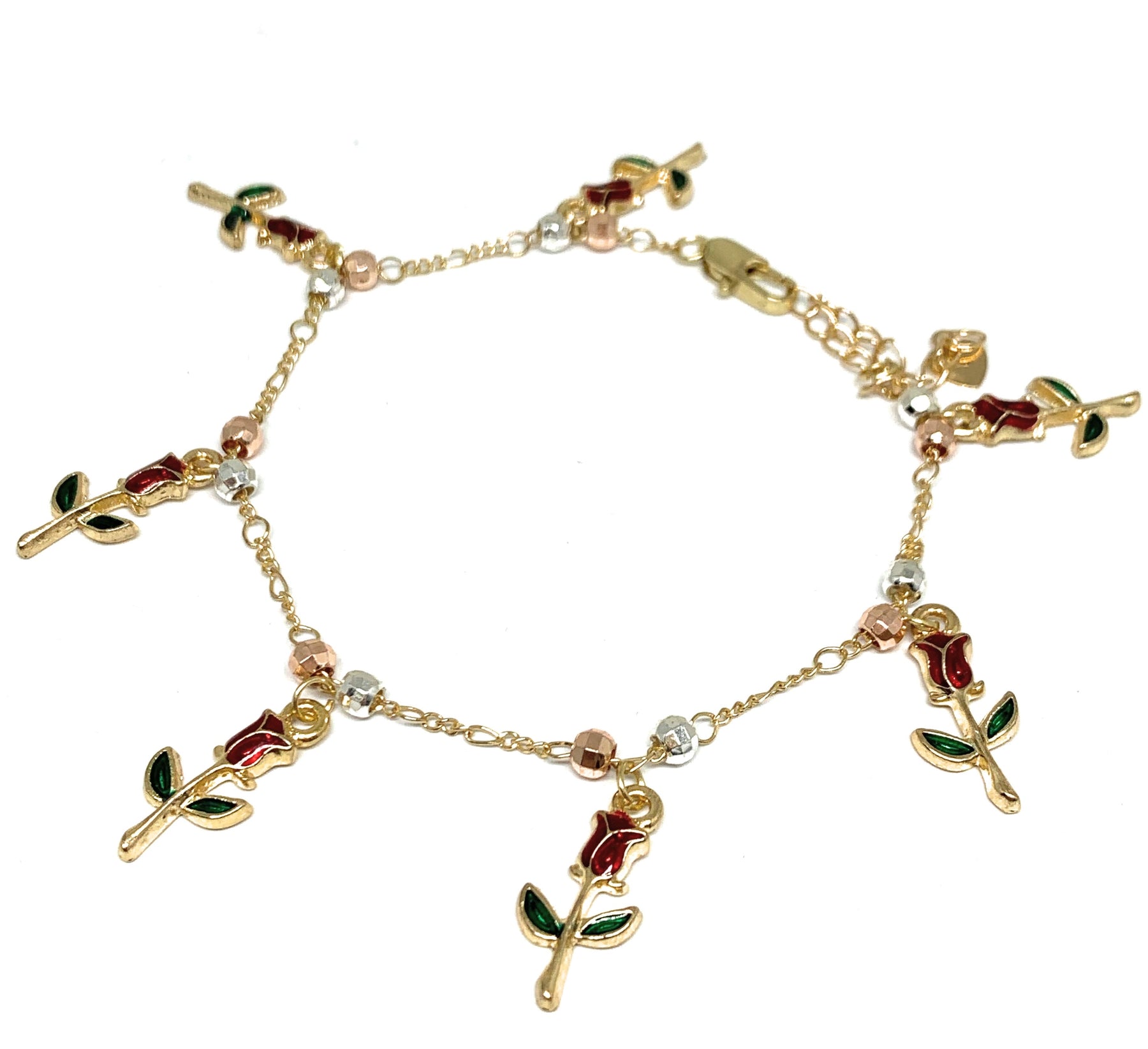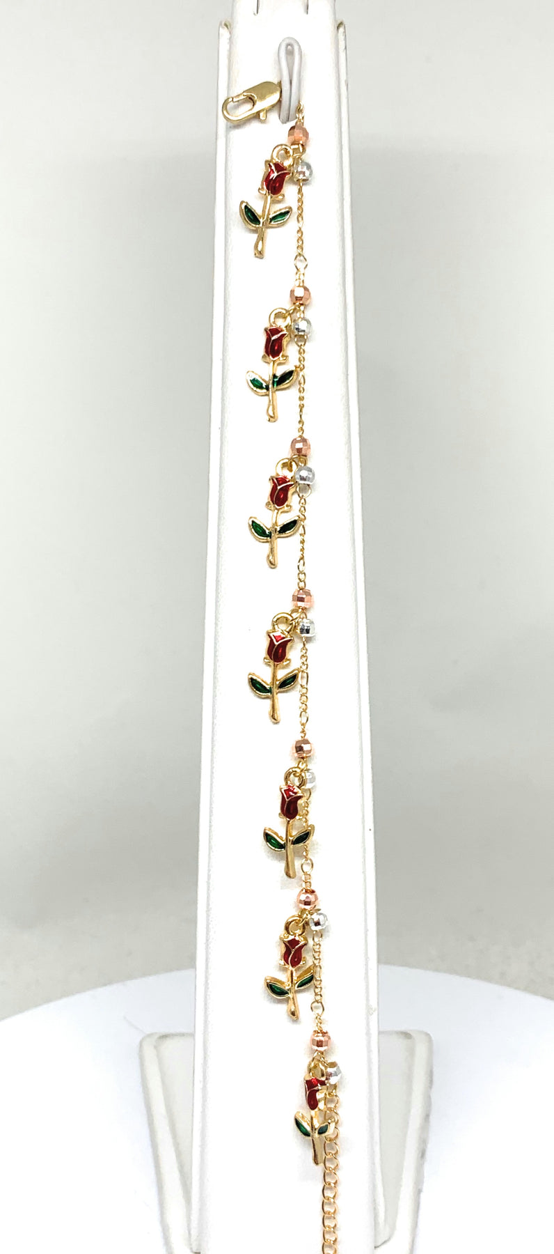 Gold Plated Rose Charms Tri-Color Bracelet 9”