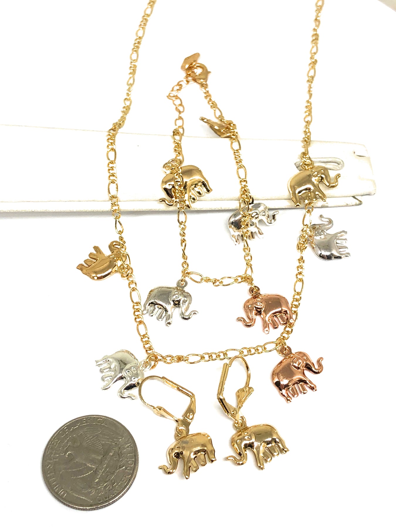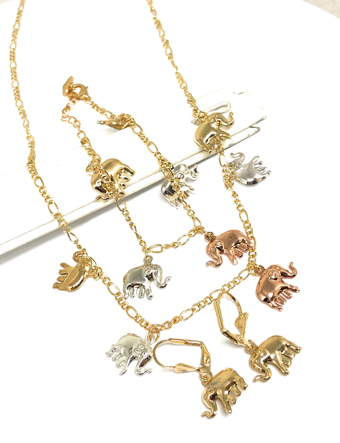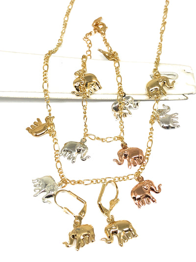Gold Plated Tri-Color Elephant Charm SET (NECKLACE, EARRINGS, BRACELET)