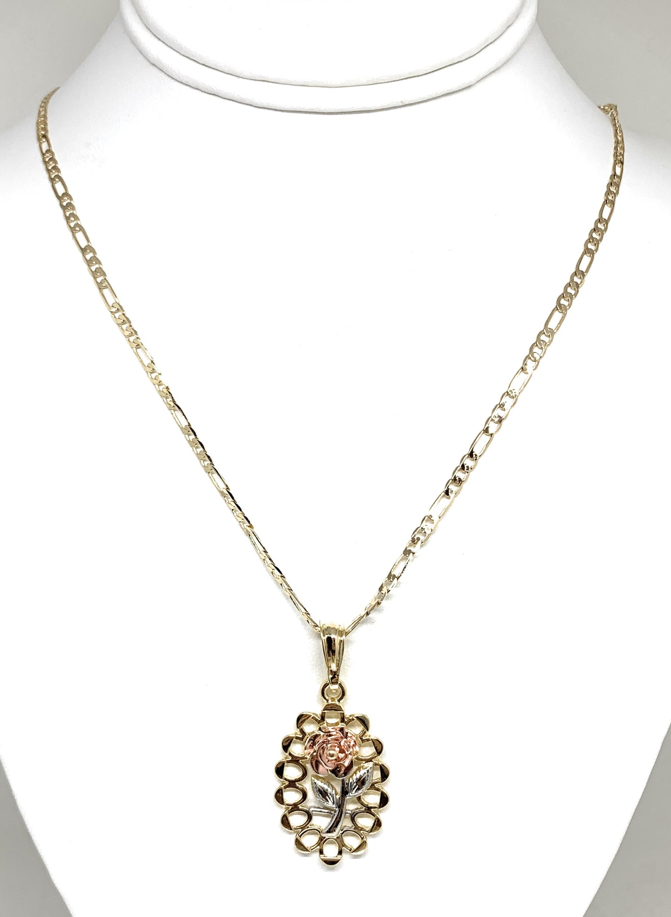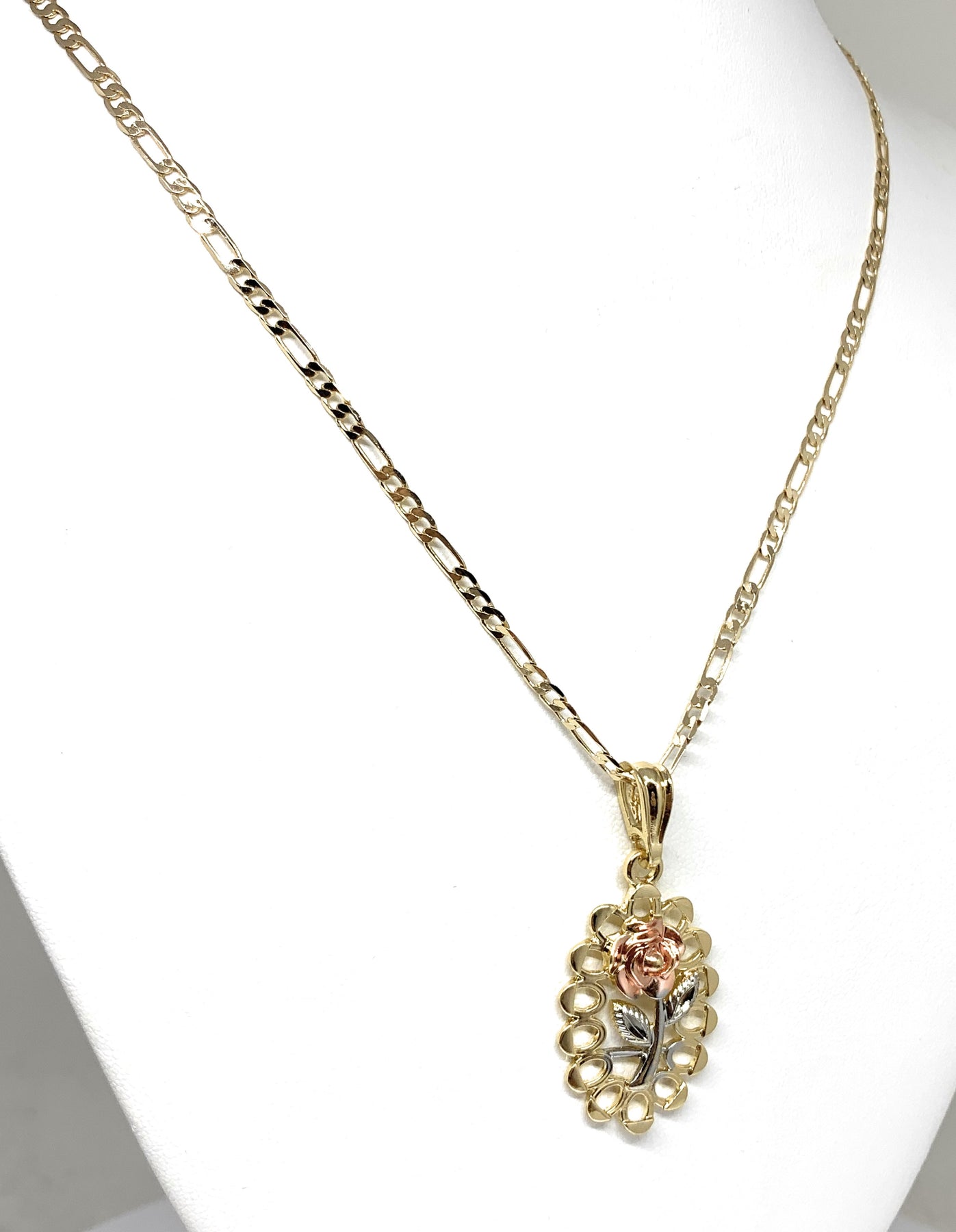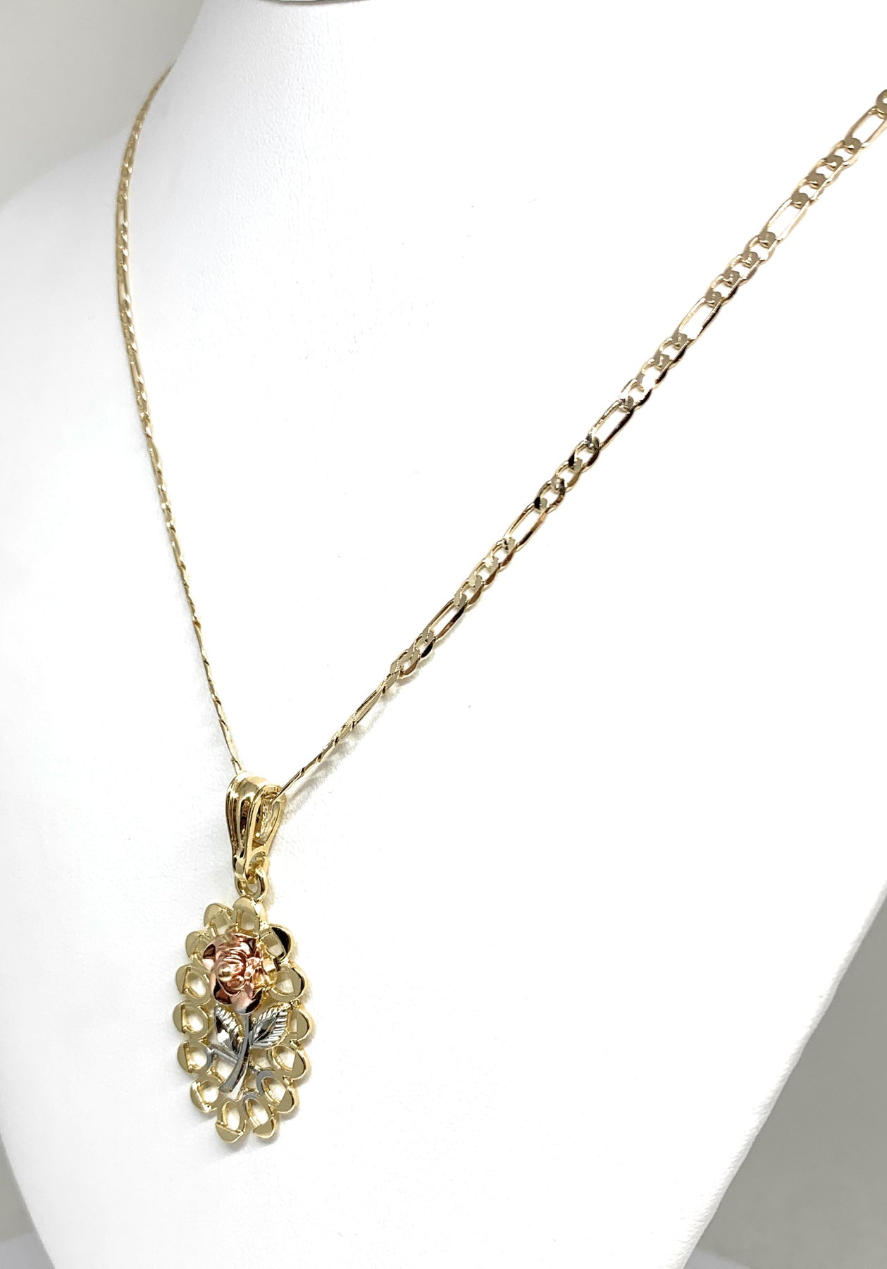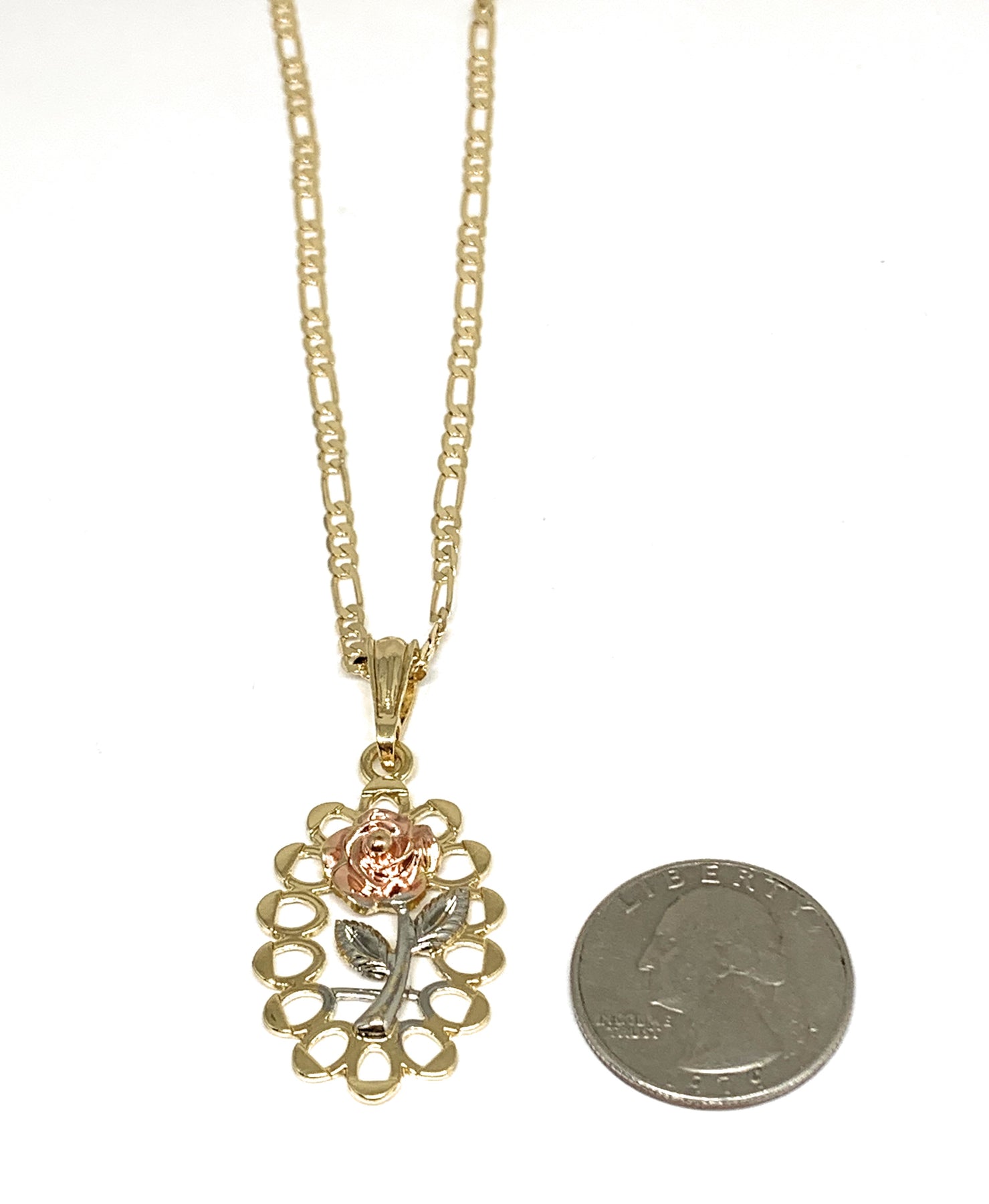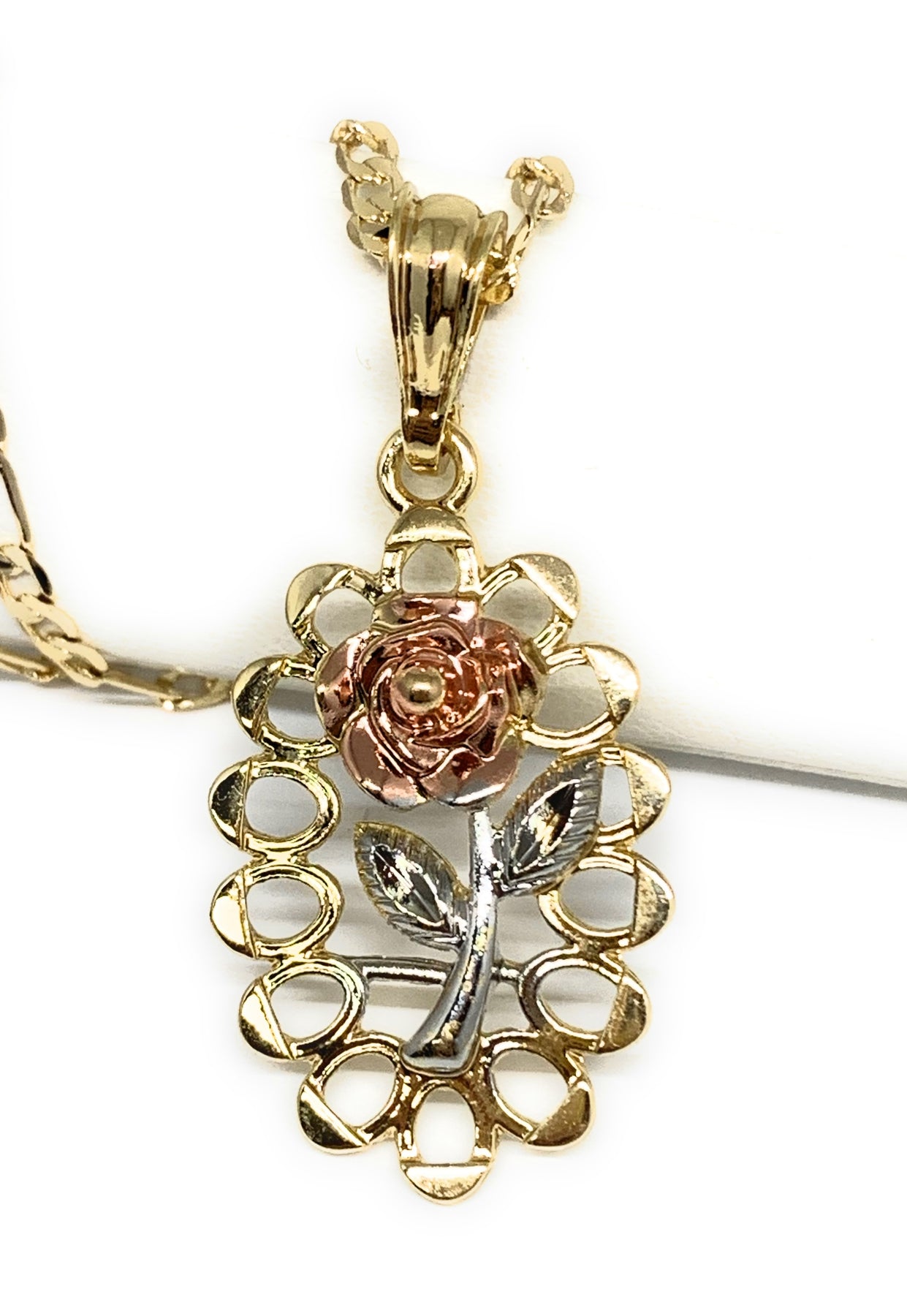 Gold Plated Tri-Color Oval Rose Pendant Necklace Chain 24” Flor Pendant