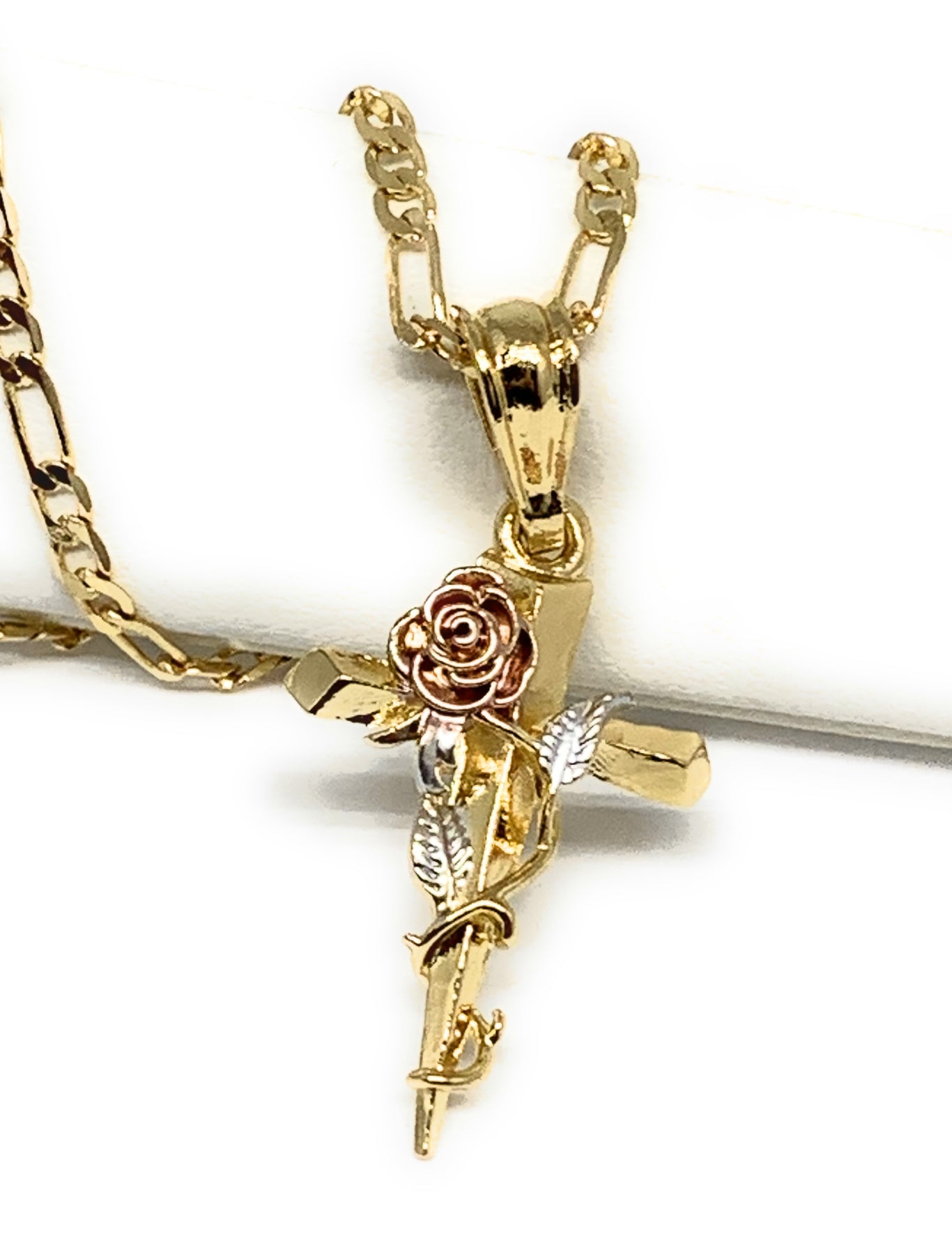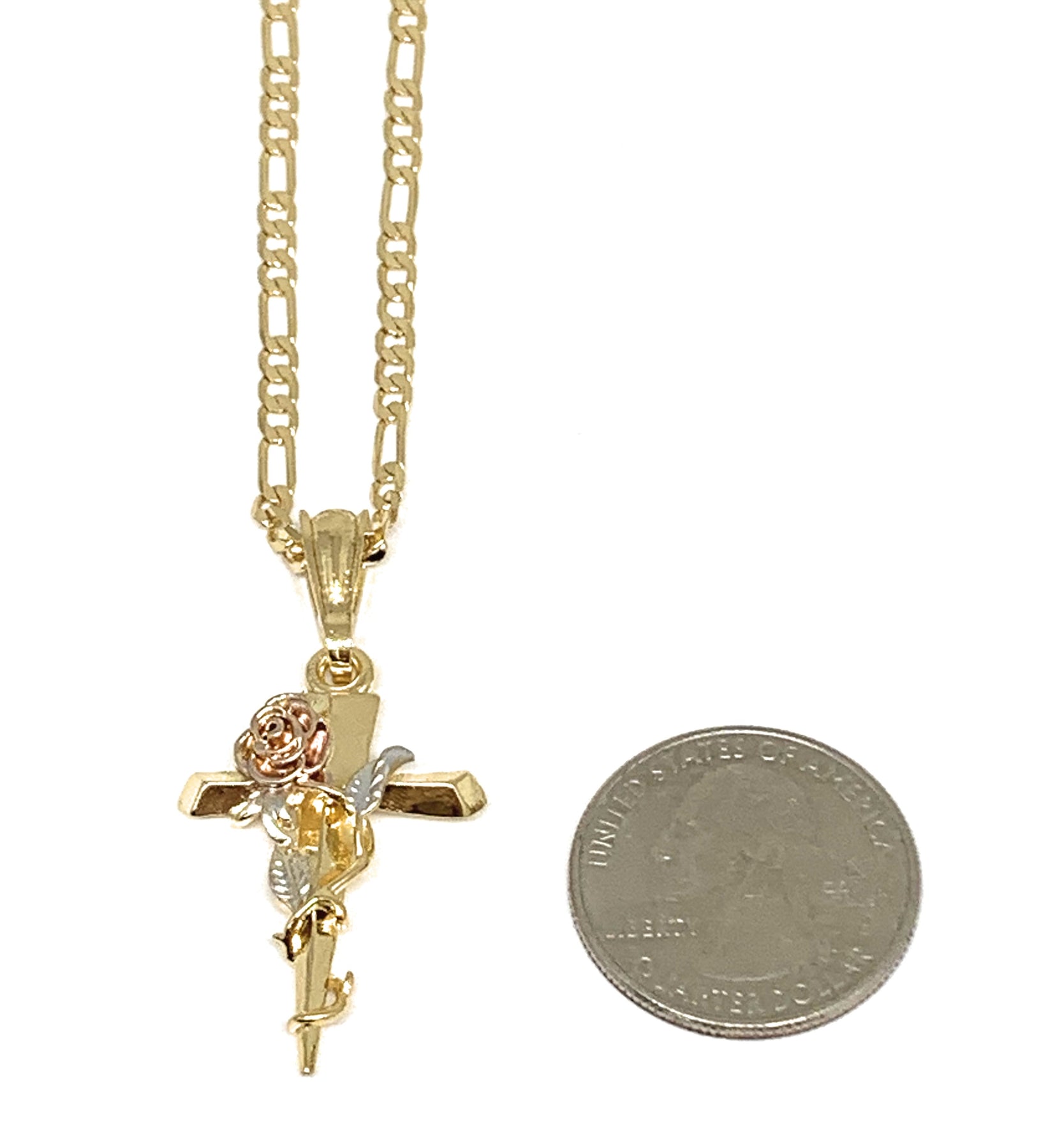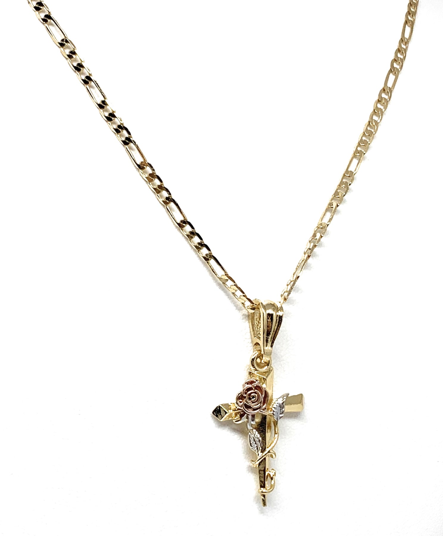 Gold Plated Tri-Color Rose Cross Crucifix 24" Chain Cruz Crucifijo
