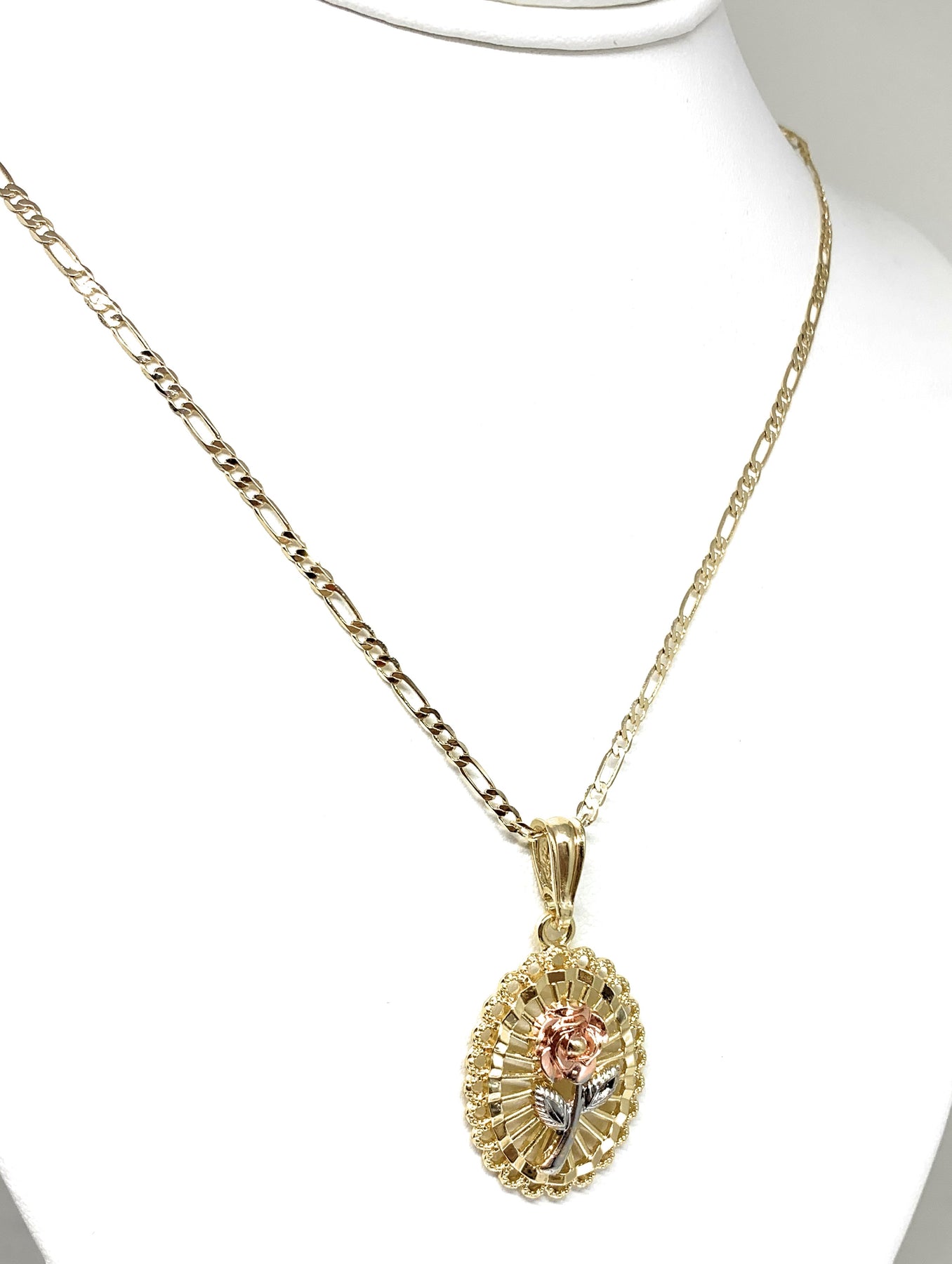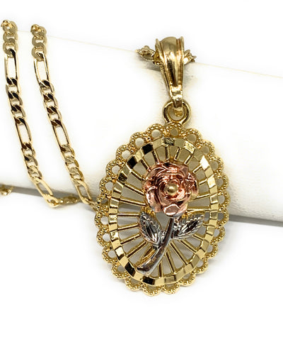 Gold Plated Tri-Color Rose Filigran Pendant Necklace Chain 24” Flor Pendant