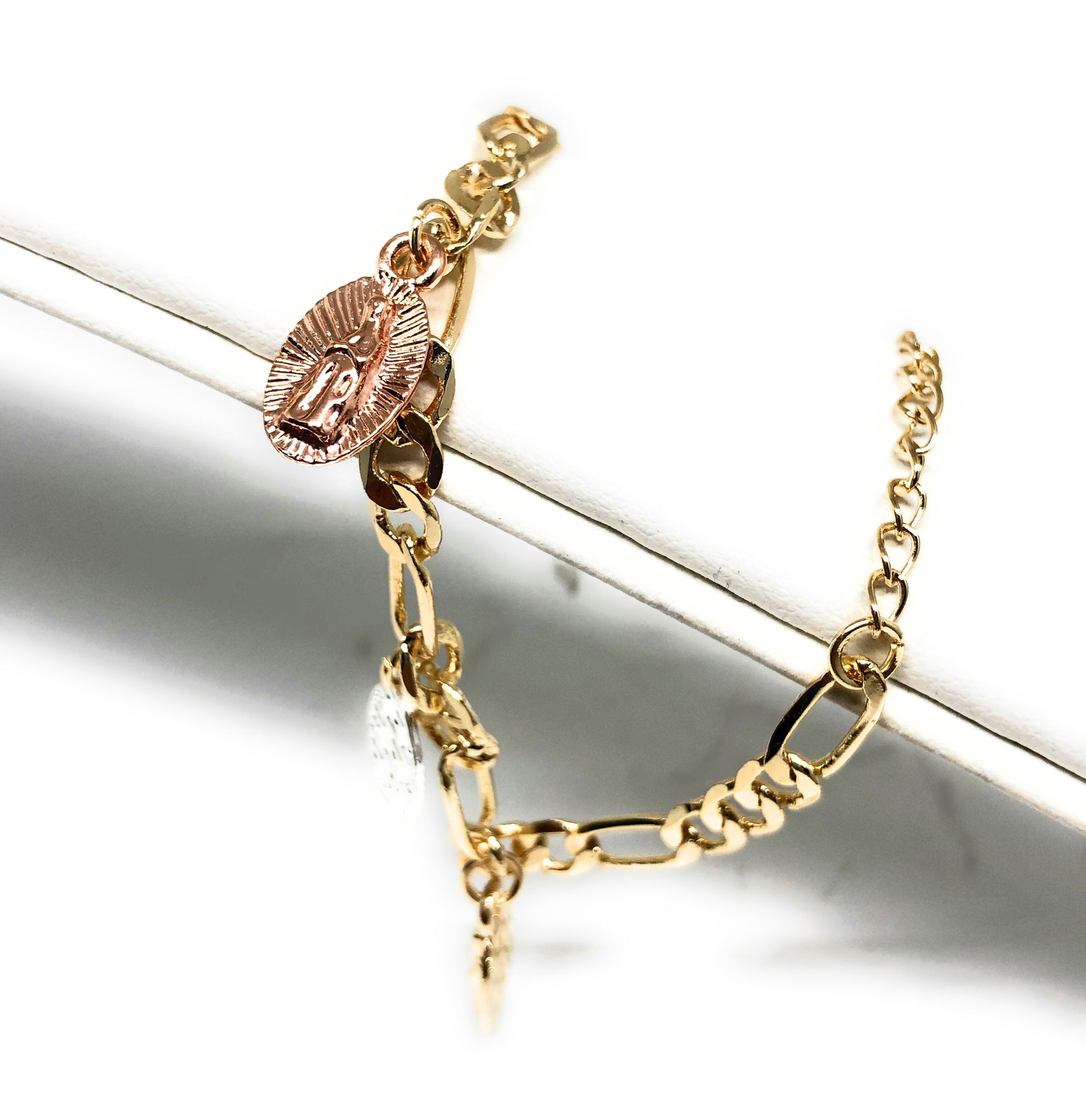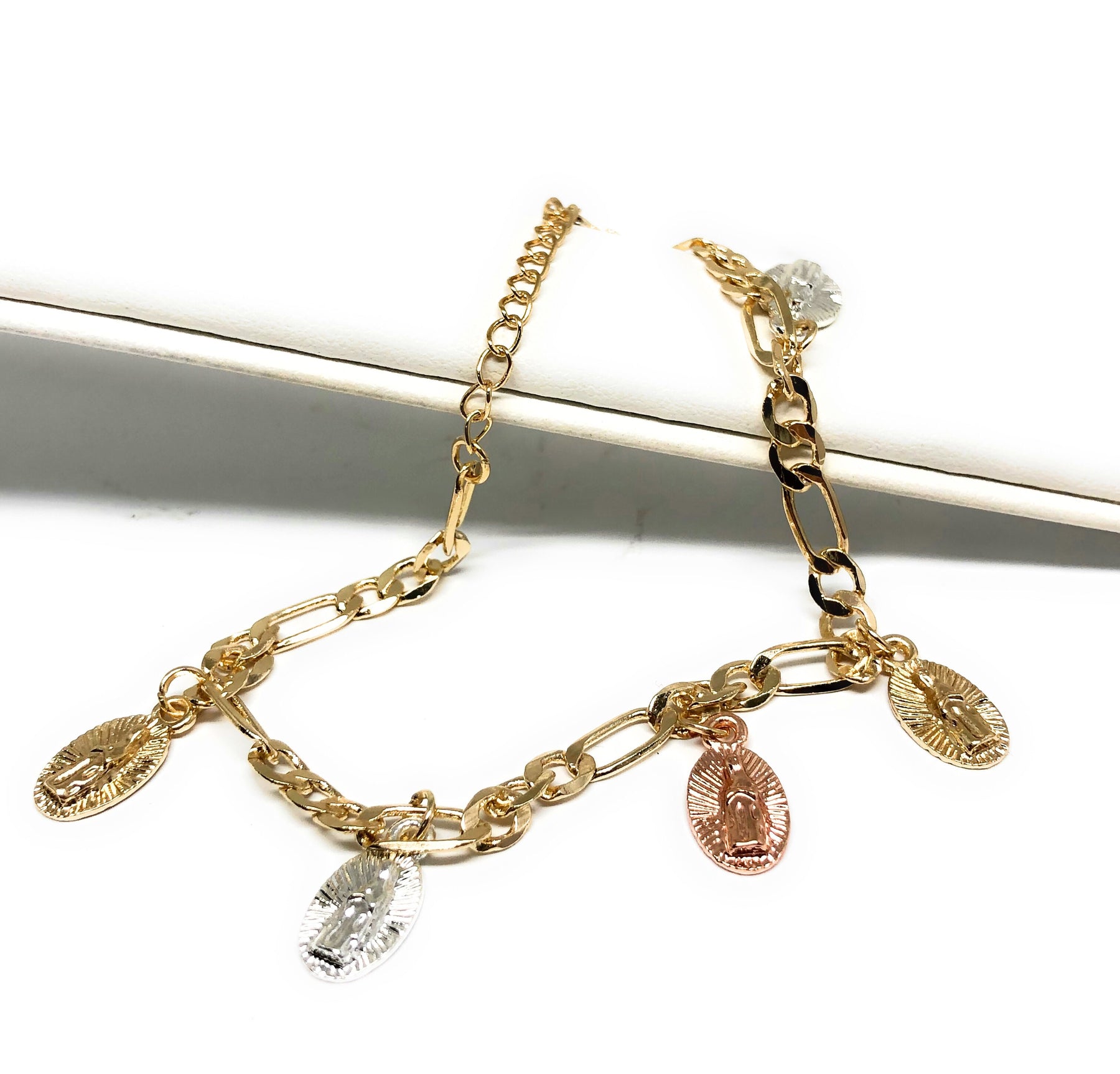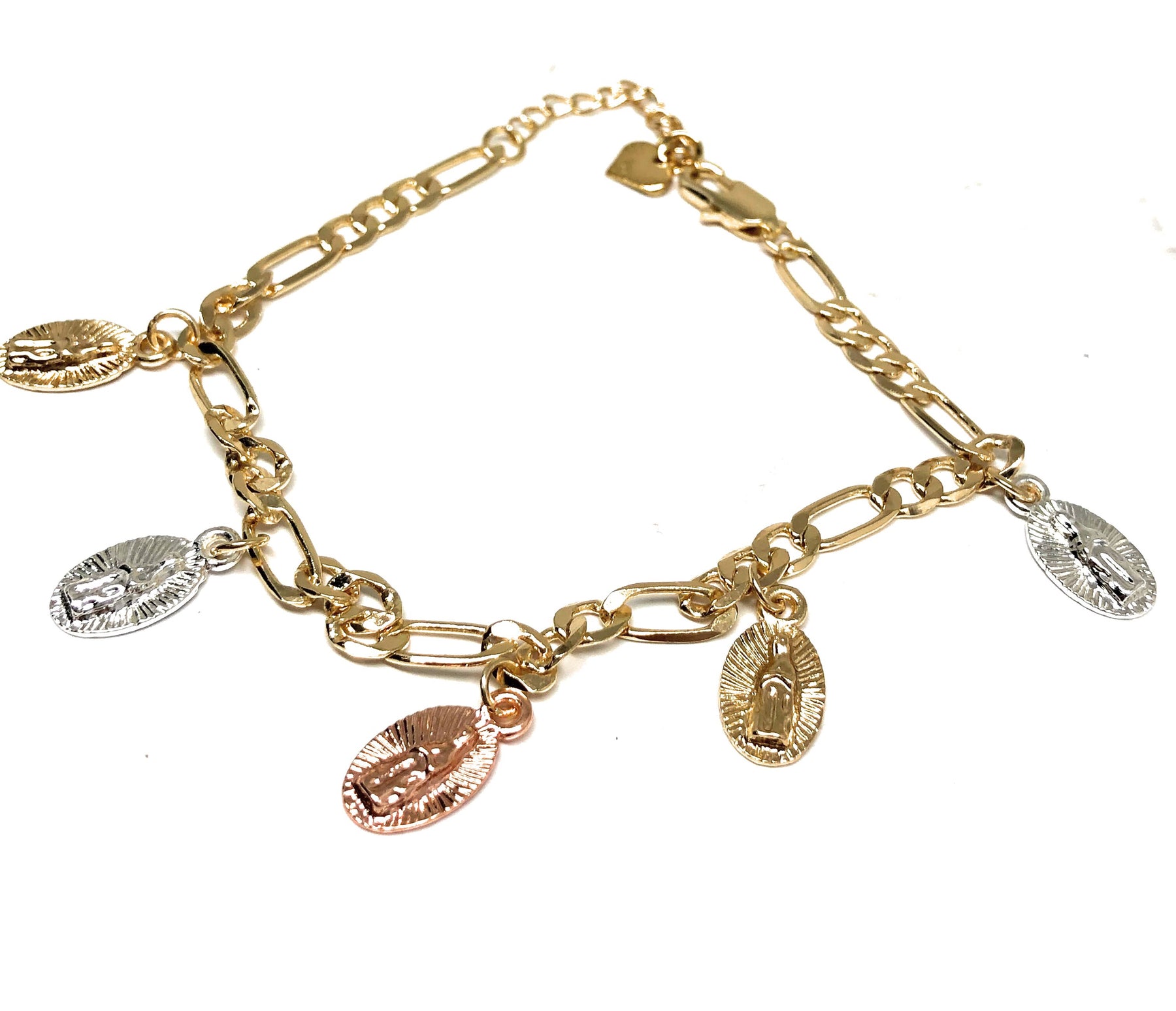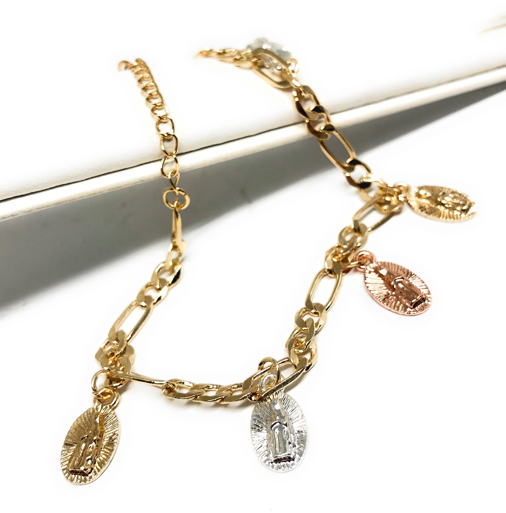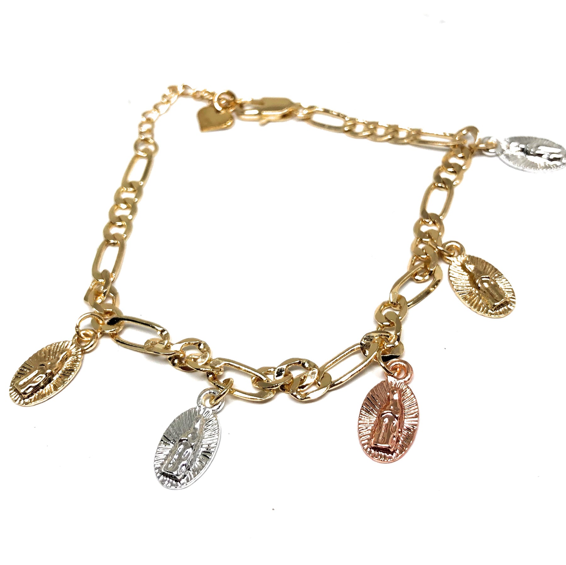 Gold Plated Tri-Color Virgin Mary Bracelet Virgen De Guadalupe Pulsera Tres Colores 8”