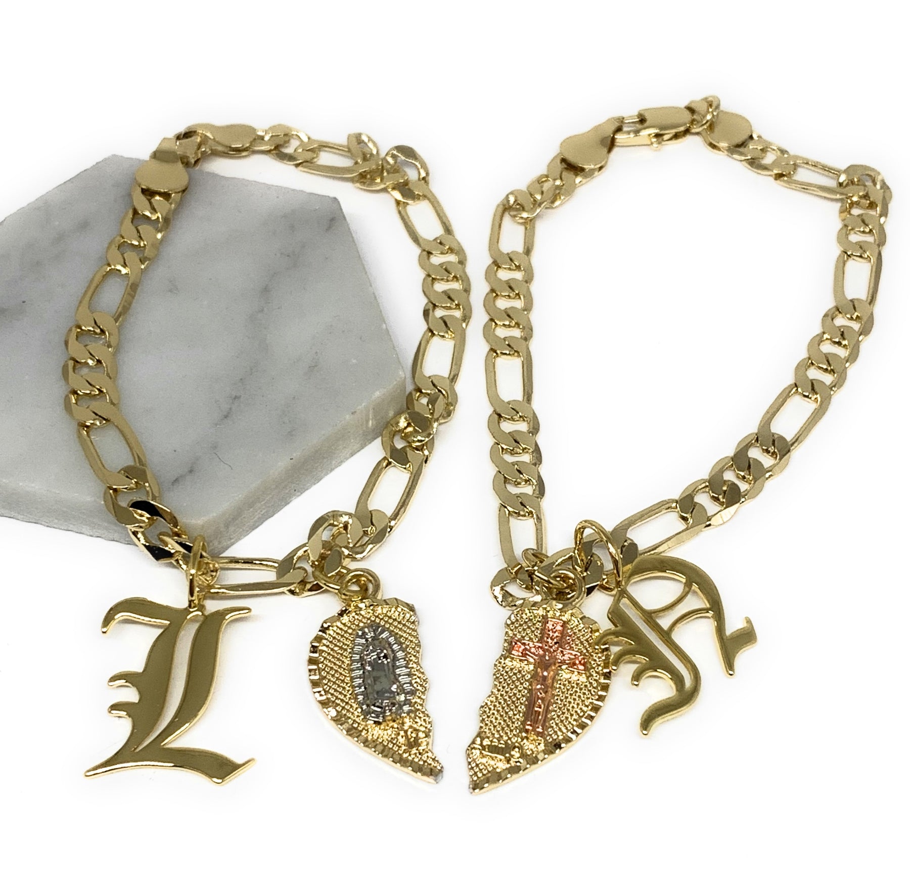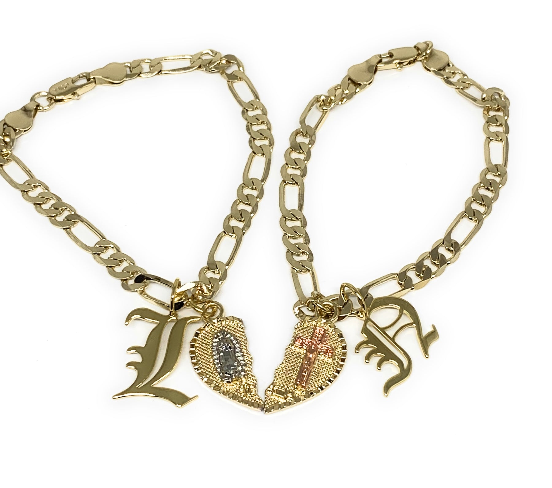 GOLD PLATED TRI-COLOR VIRGIN MARY & CHRIST "TE AMO" HEART SPLIT PENDANT & OLD ENGLISH INITIAL LETTER TWO BRACELET SET 7.5”