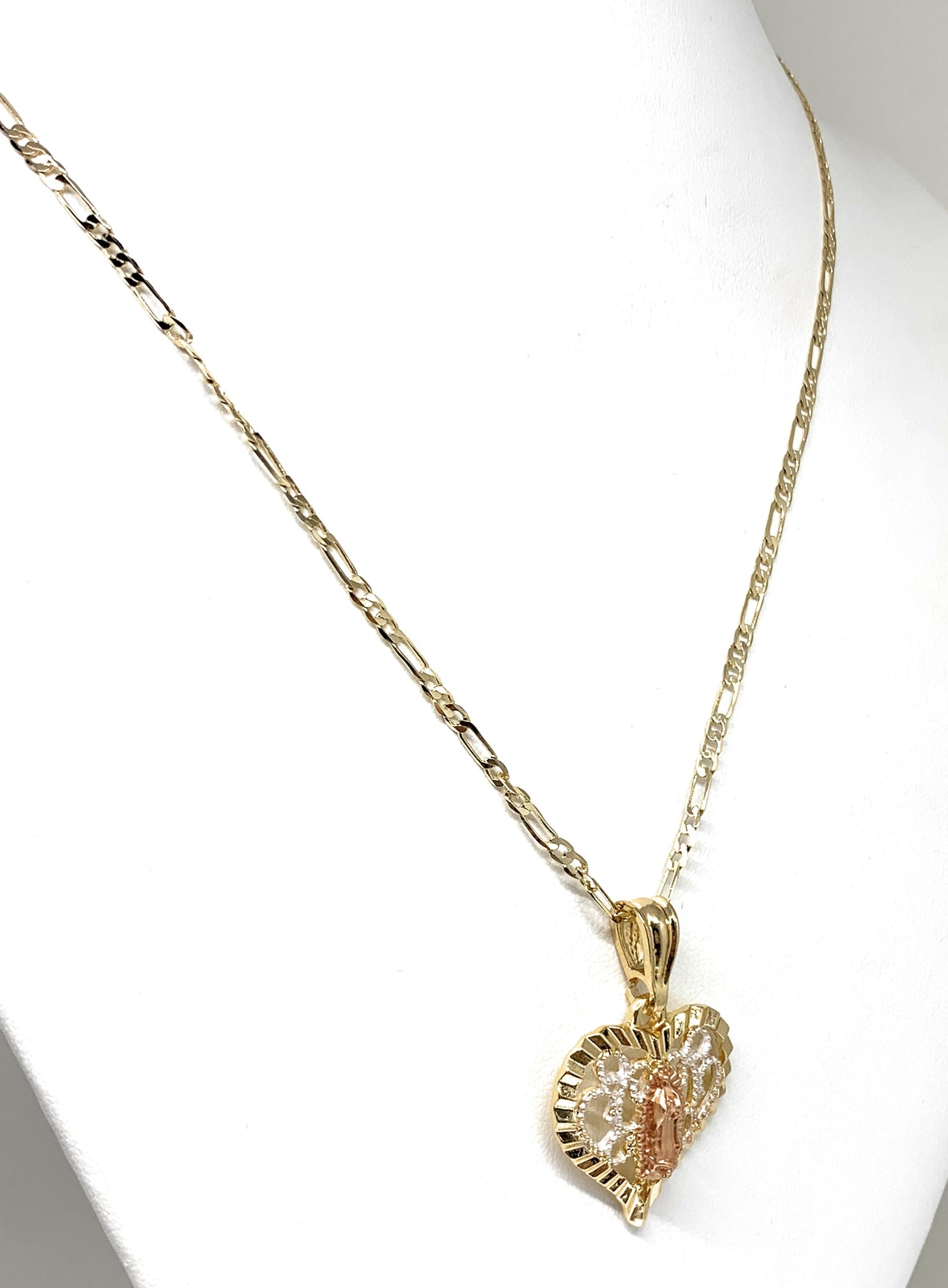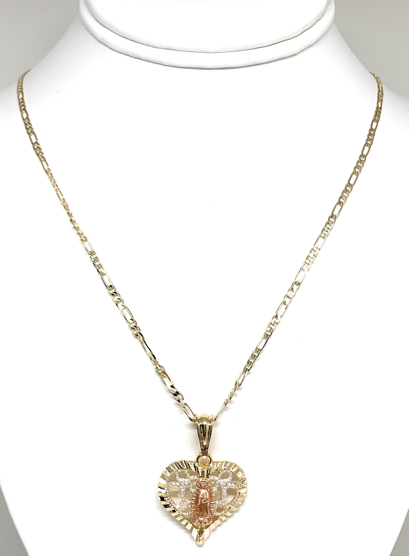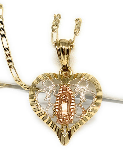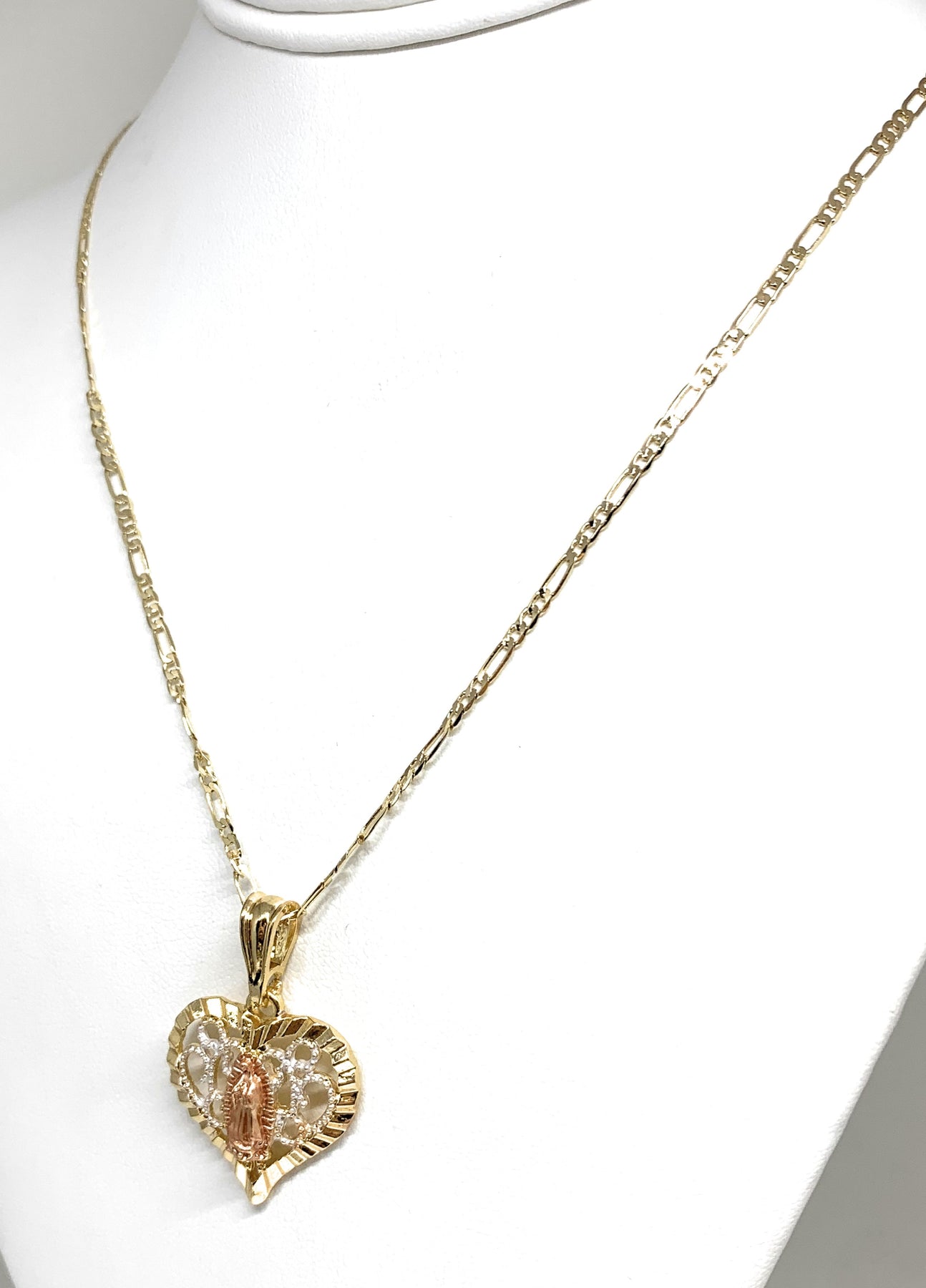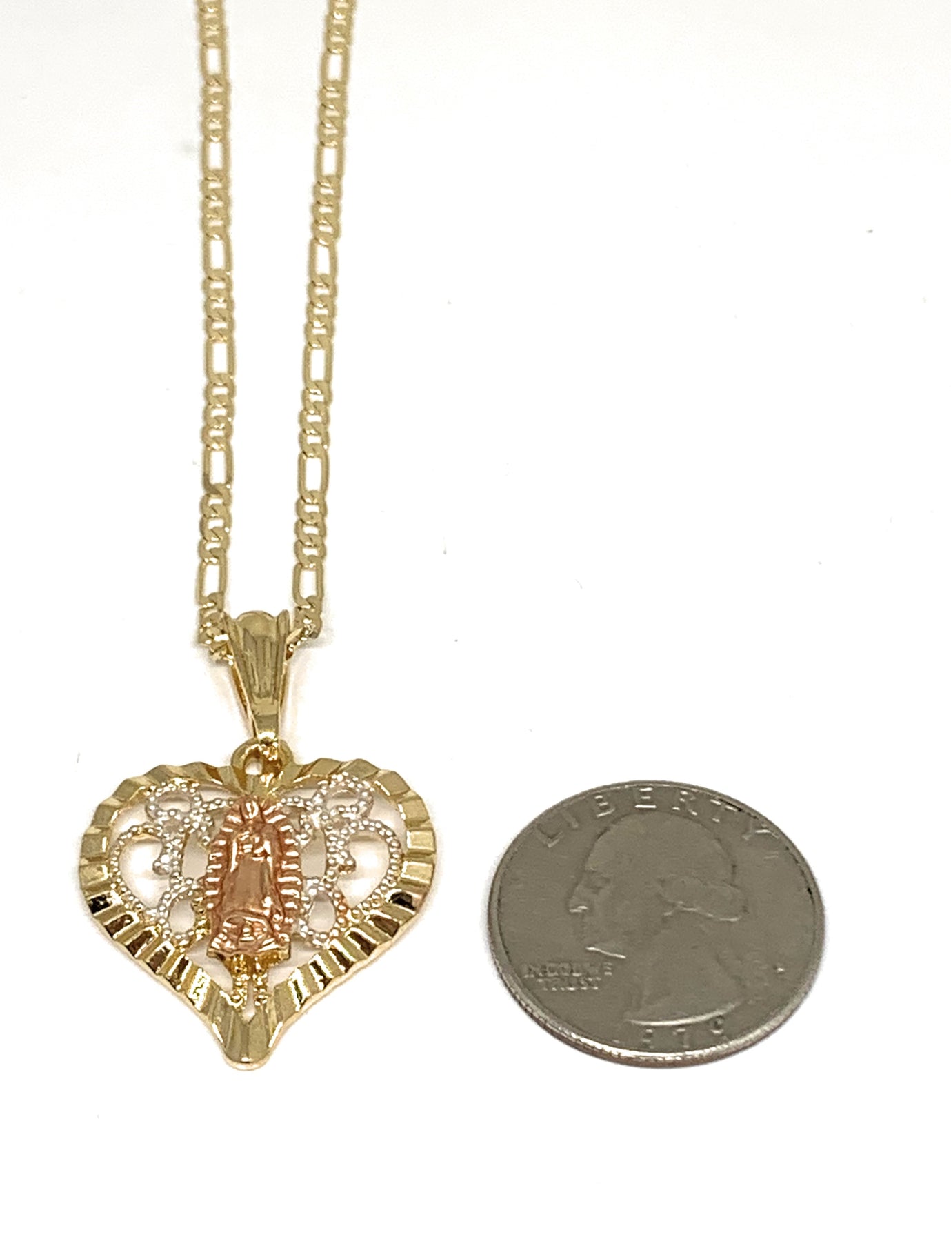 Gold Plated Tri-Color Virgin Mary Filigran Heart Pendant Necklace Figaro 24" Virgen de Guadalupe Medalla