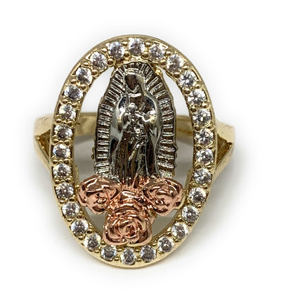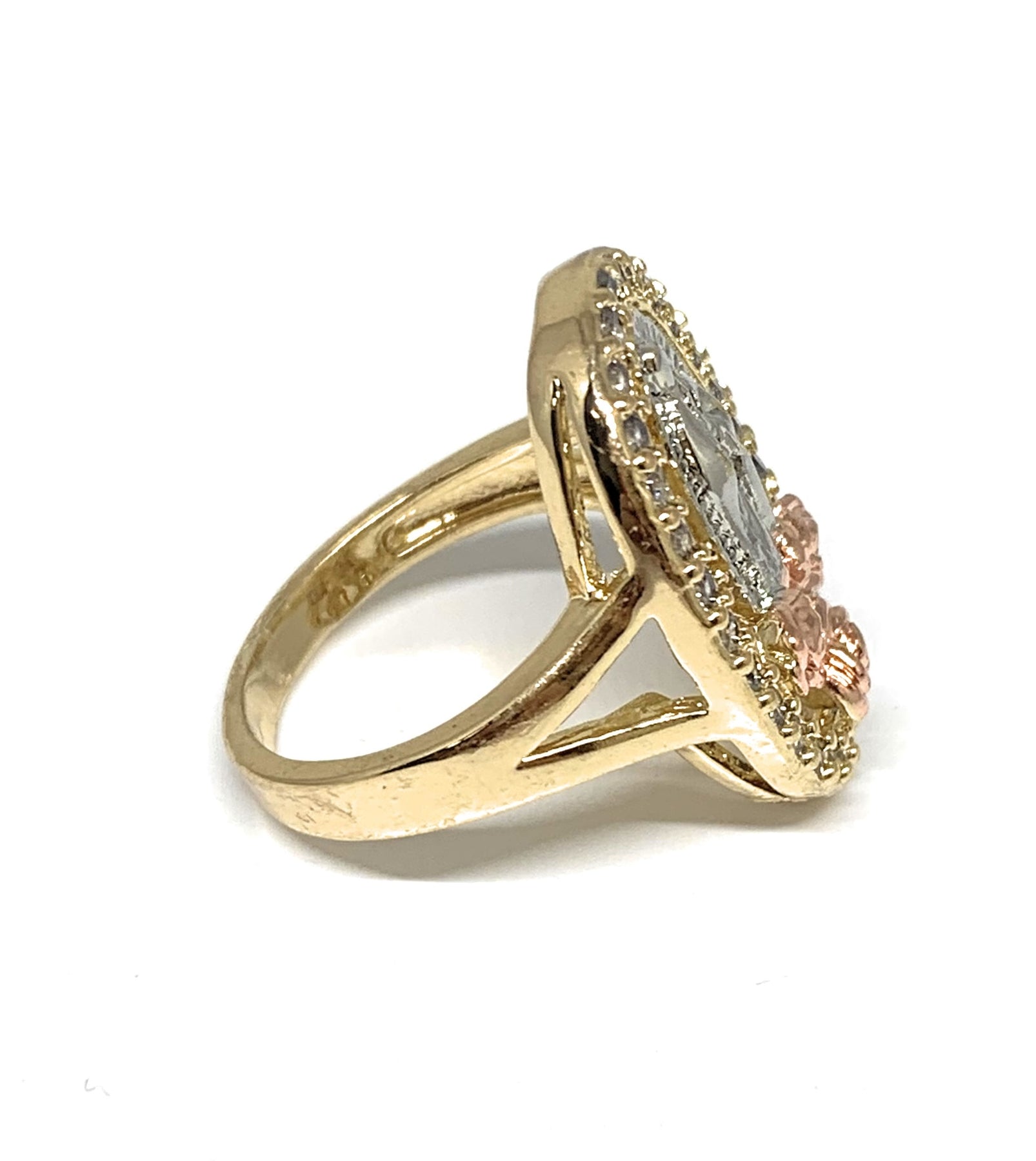 Gold Plated Tri-Color Virgin Mary Flower CZ Ring Virgen De Guadalupe Anillo