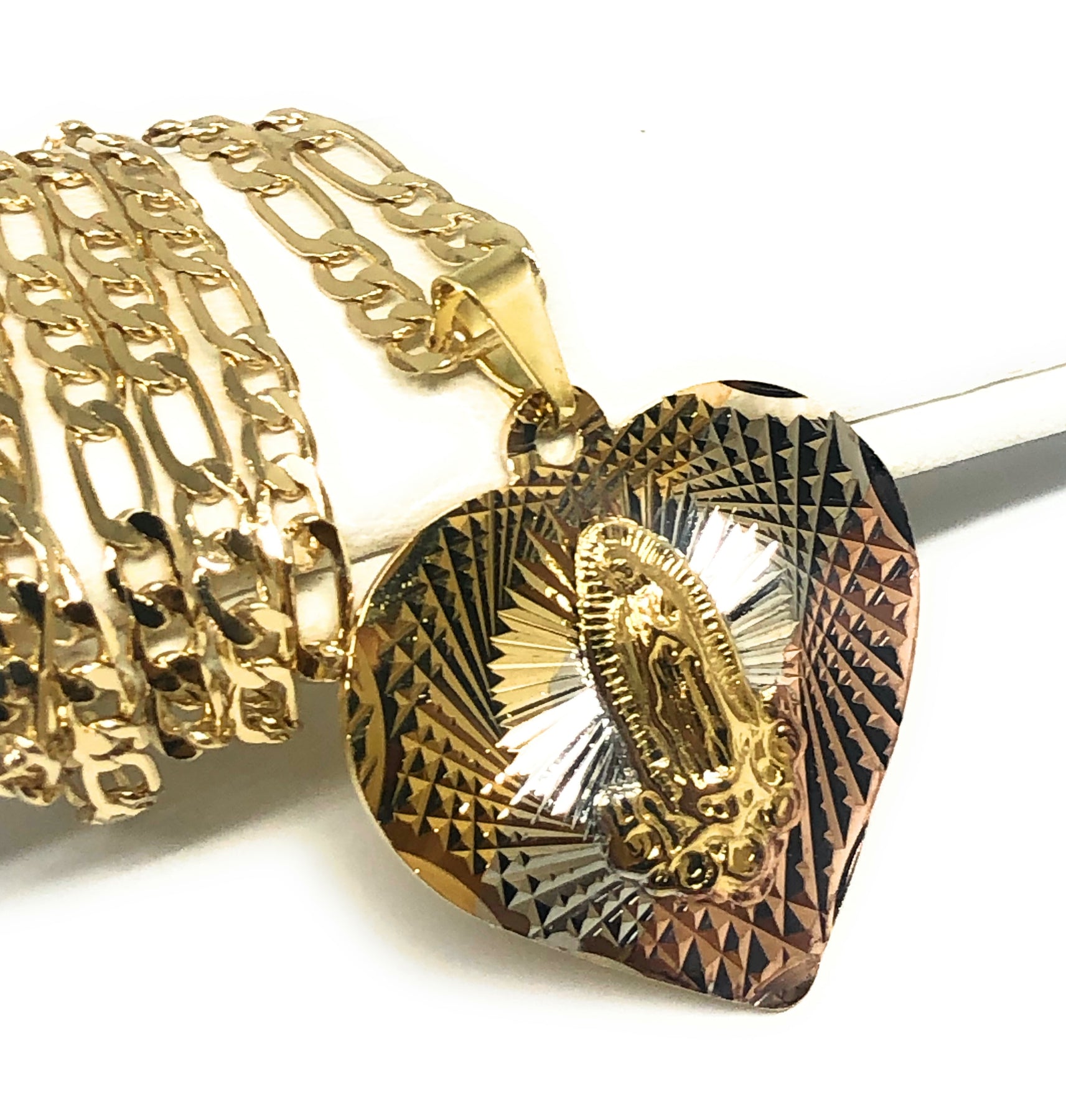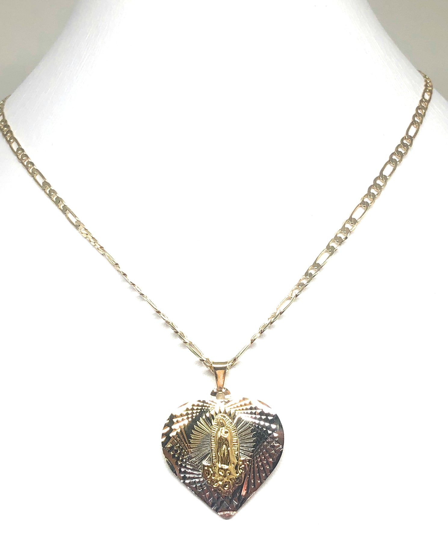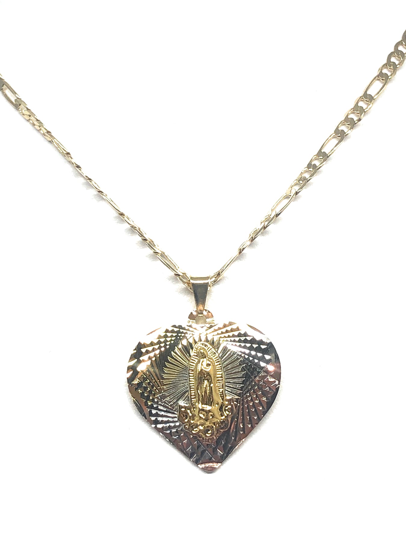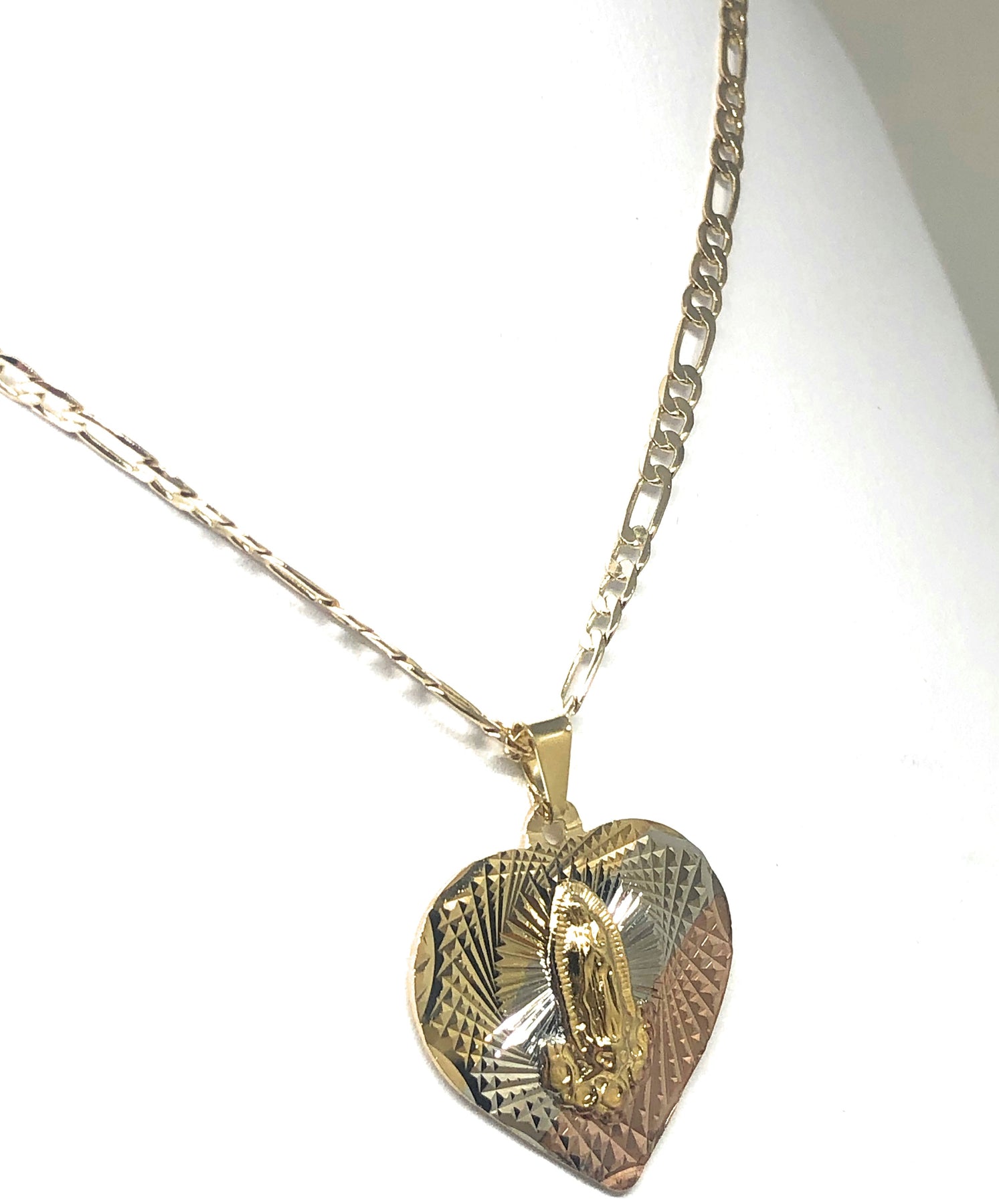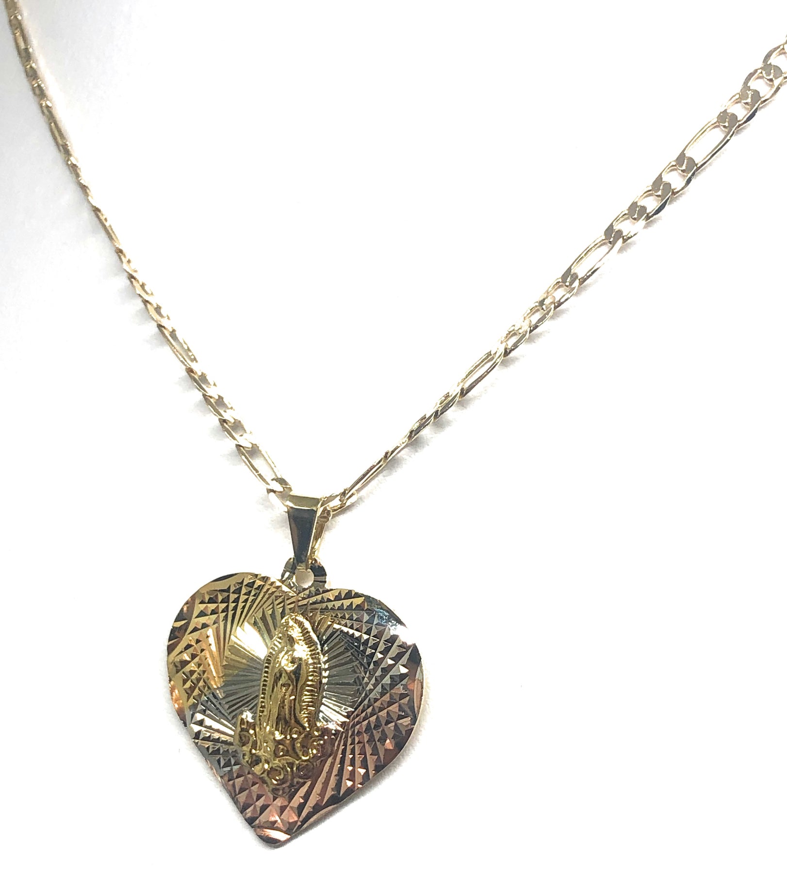 Gold Plated Tri-Color Virgin Mary Laser Cut Heart Pendant Necklace Figaro 24" Virgen de Guadalupe Medalla