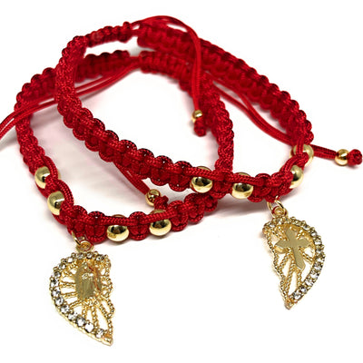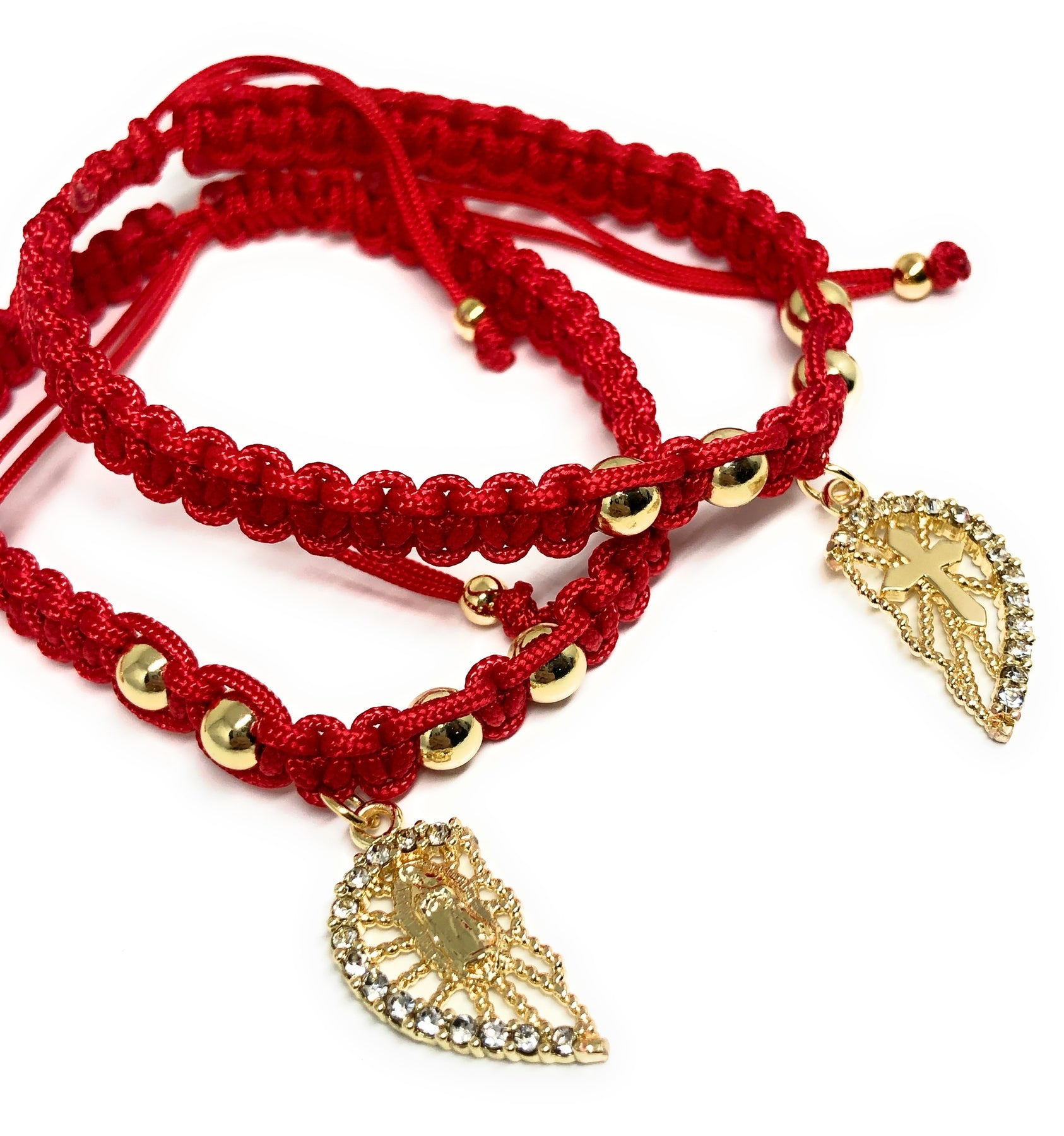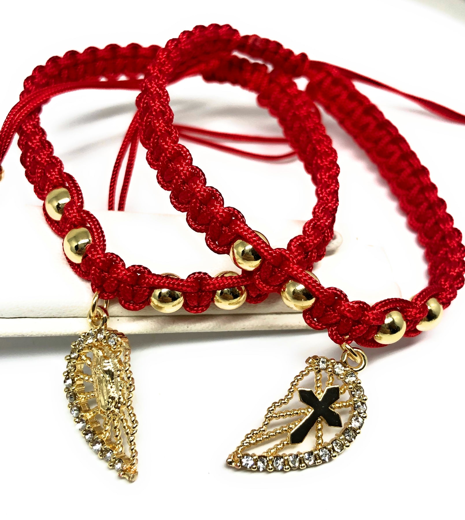Gold Plated Virgin Mary & Cross Heart Split Pendant HAND BRAIDED ADJUSTABLE TWO BRACELET SET 7.5”